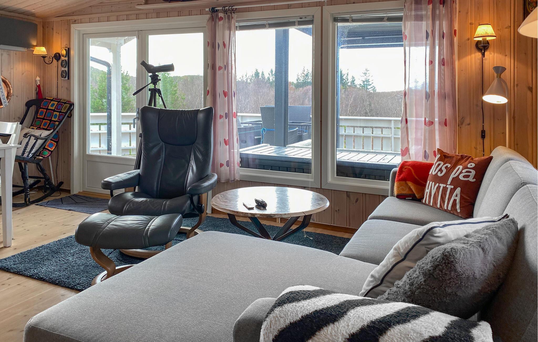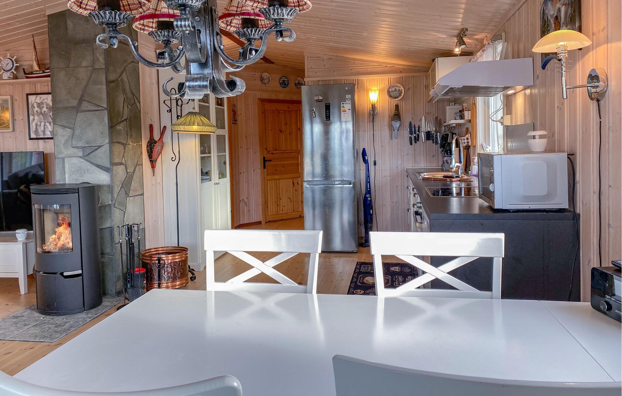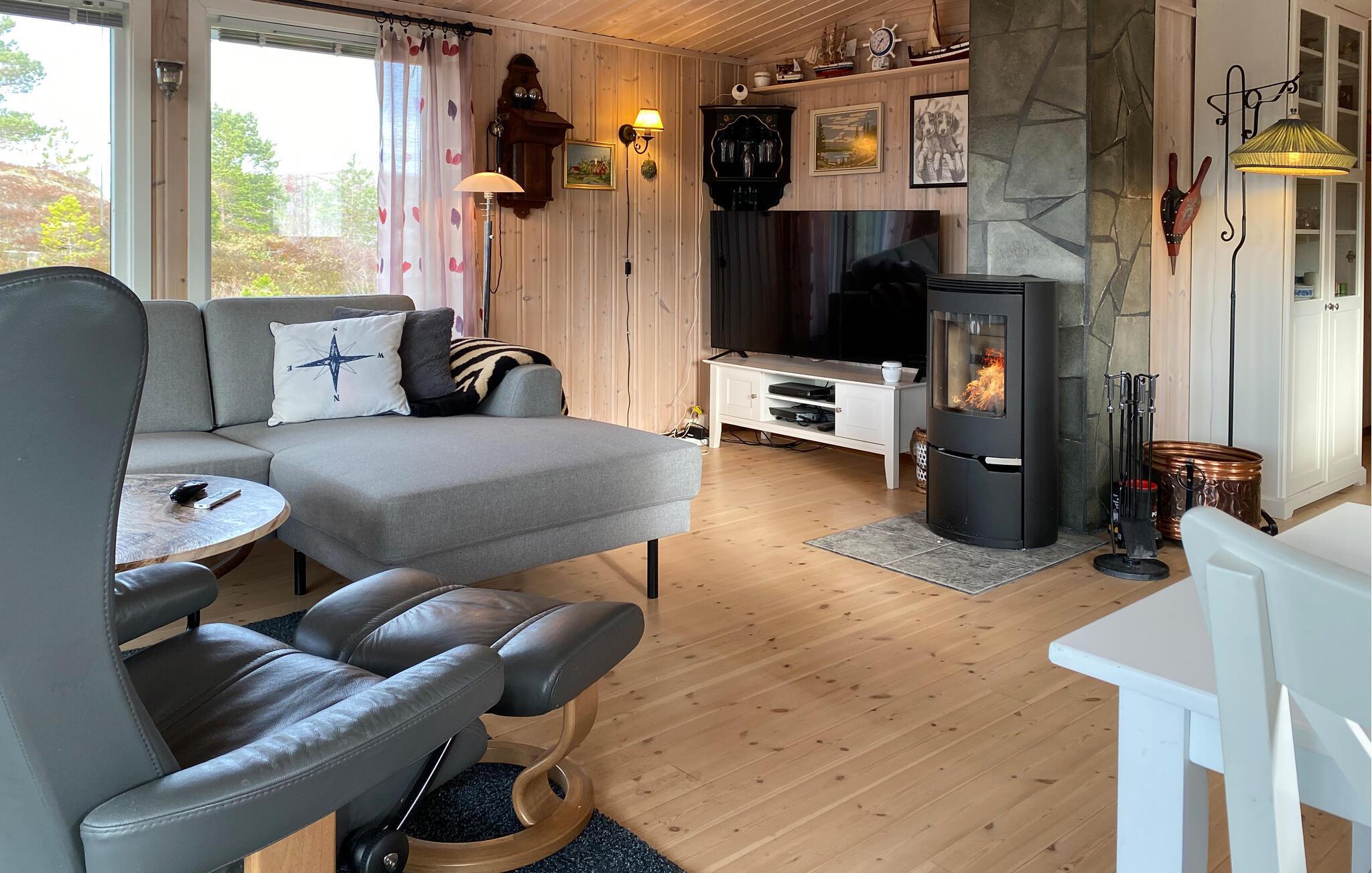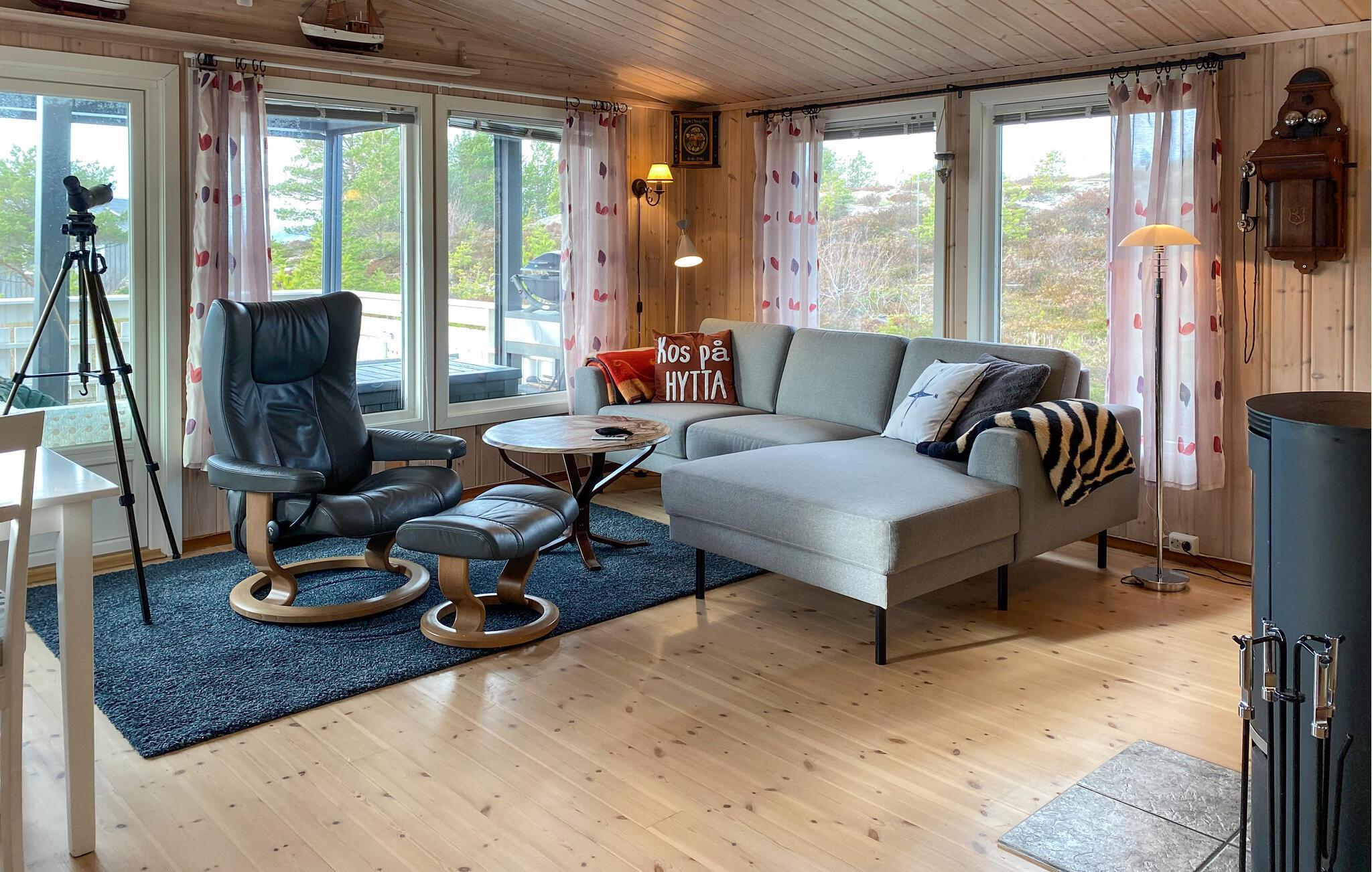 Verbringen Sie eine erholsame Zeit in Ihrem charmanten Ferienhaus, das eingebettet in eine friedliche Landschaft mit weitläufigen Wäldern und atemberaubenden Ausblicken liegt. Entdecken Sie die Natur, gehen Sie auf Wanderungen oder entspannen Sie sich einfach auf der großzügigen Terrasse. Der Innenbereich des Hauses ist ansehnlich und gleichzeitig gemütlich gestaltet. Der offene Wohnbereich mit großen Fenstern lässt viel Licht herein und bietet einen tollen Blick in die Umgebung. Am Horizont können Sie sogar das Meer erblicken. Machen Sie es sich auf dem bequemen Sofa vor dem Kaminofen gemütlich oder genießen Sie Ihre Mahlzeiten am Esstisch mit Blick ins Freie.