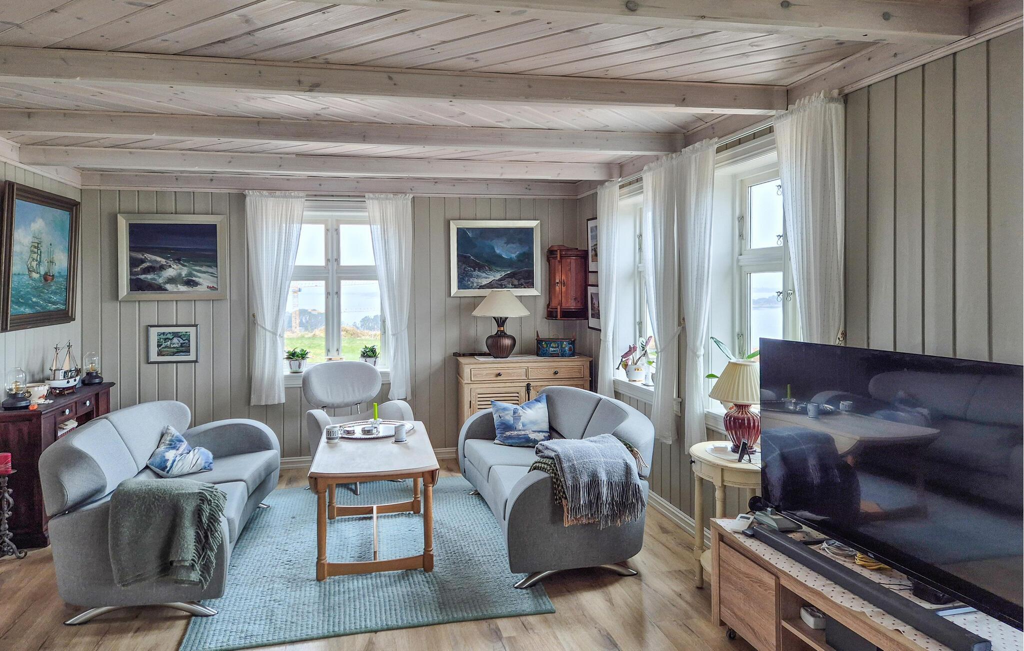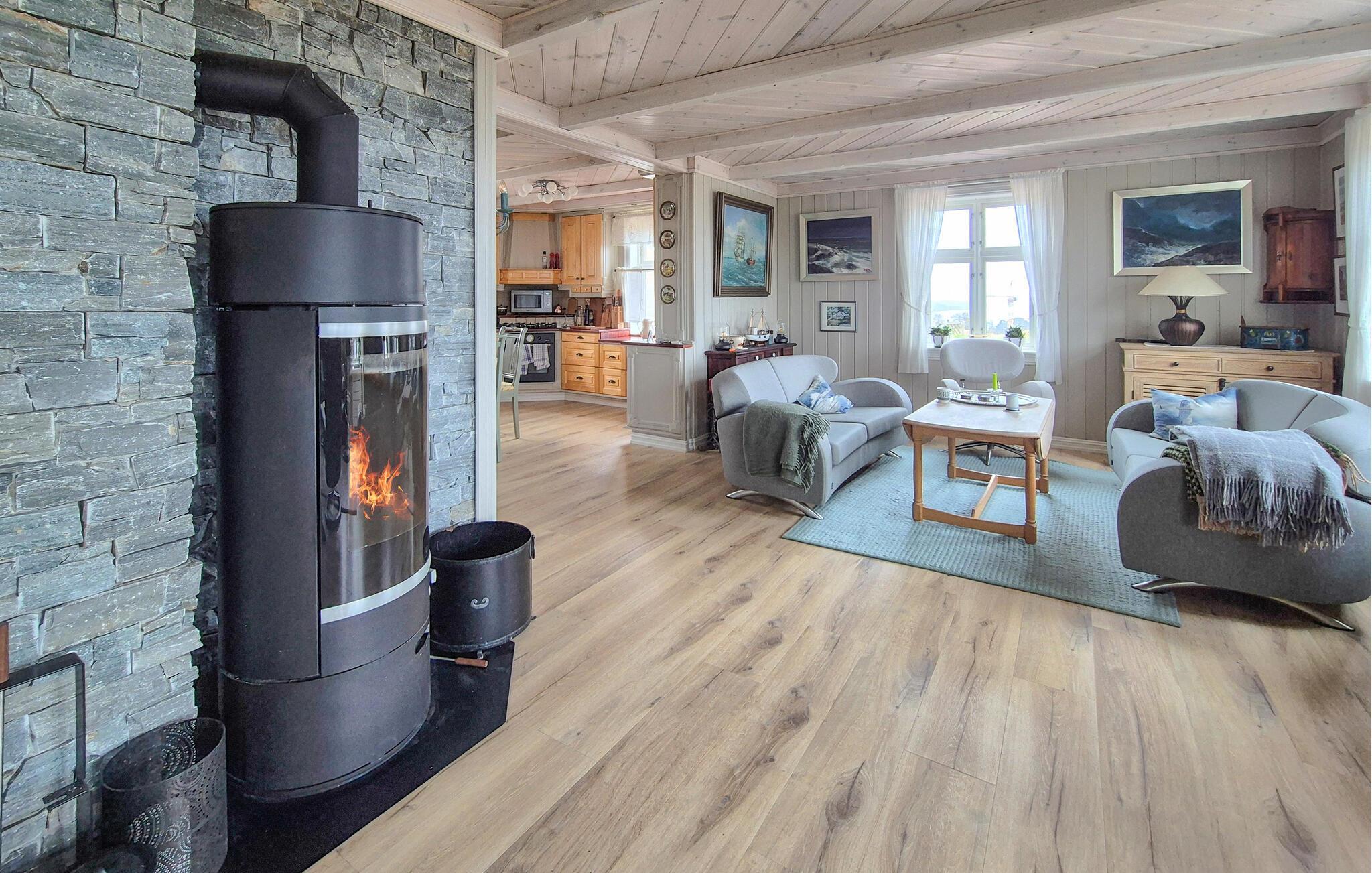 Dieses komfortable und geschmackvoll eingerichtete Urlaubsdomizil verwöhnt Sie mit viel Platz und einem traumhaften Panoramablick, den Sie nicht vergessen werden. Freuen Sie sich auf gesellige Kochabende in der geräumigen Küche und harmonische Mahlzeiten am einladenden Esstisch. Legen Sie nach einem langen Tag an der frischen Seeluft die Füße auf dem Lesesessel hoch, streamen Sie einen Film oder lauschen Sie bei guten Gesprächen dem behaglichen Knistern des Kaminofens.