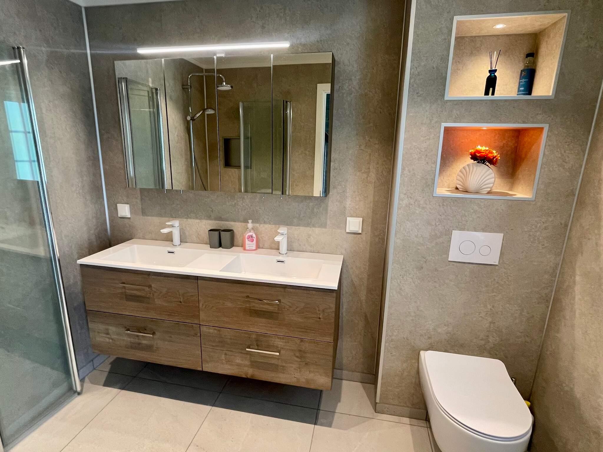 Bad: WC, Waschb., Dusche, Fußbodenheiz.
