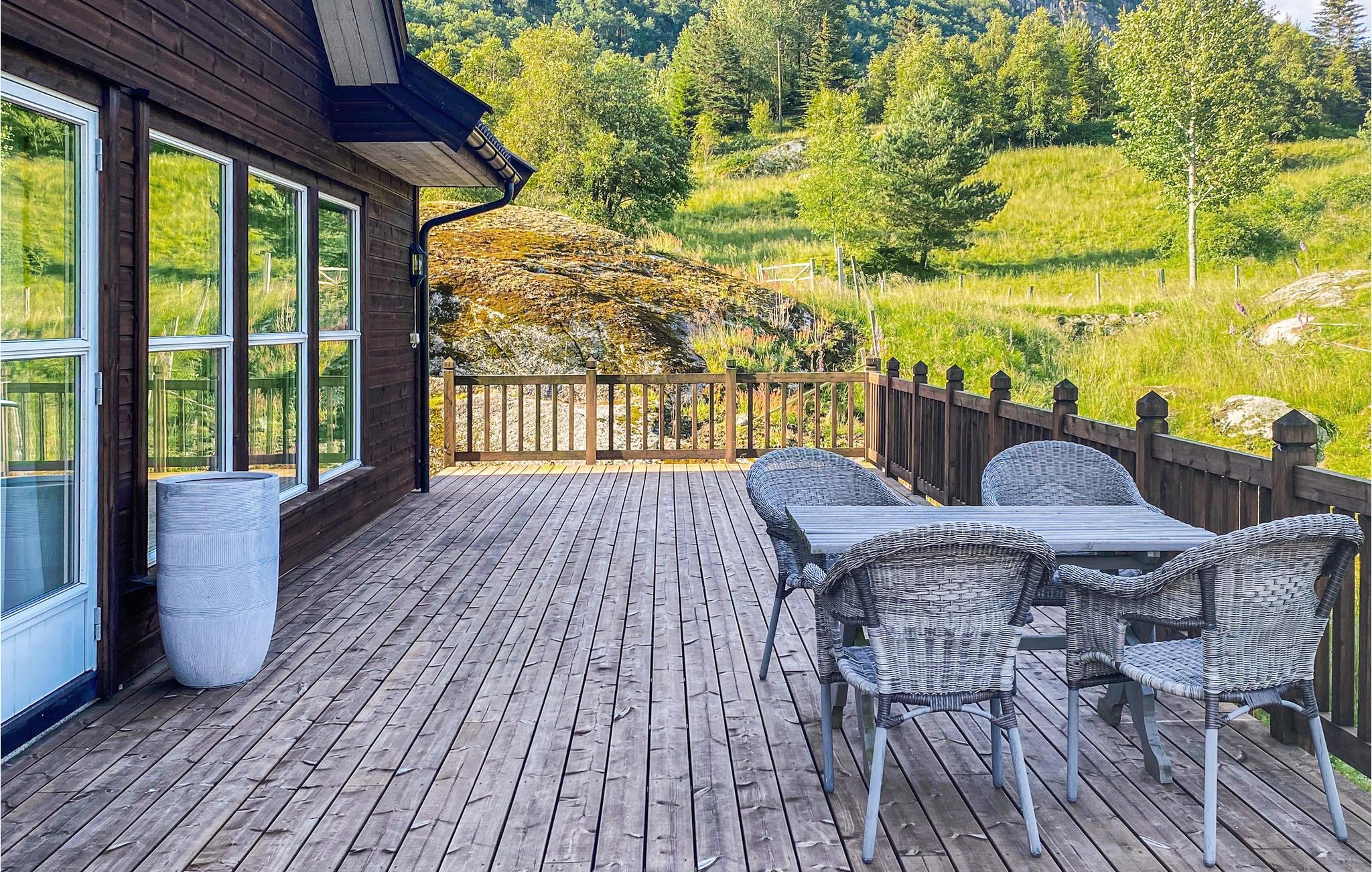 Motorboot starten und lossegeln, jetzt fängt Ihr Angelurlaub an! Auf einem abgelegenen, riesigen Grundstück direkt am Fjord mit beeindruckendem Panoramablick liegt dieses Ferienhaus, das sich für die große angelbegeisterte Familie anbietet. Hier sind mehrere Fischarten auf dem Angelkarte. Lachs, Dorsch oder Seeteufel, egal welchen Fisch Sie vorziehen, können Sie Ihr Angelabenteuer direkt vor der Tür beginnen. Nach ein paar Stunden im Boot können Sie sich abkühlen. Springen Sie vom Steg aus in den glitzernden Fjord umgeben von verträumter Natur. Naturliebhaber sollten unbedingt eine Wandertour machen und das reiche Pflanzen- und Tierleben studieren. Sammeln Sie Pilze und Beeren und binden Sie einen hübschen Strauß aus Wildblumen.