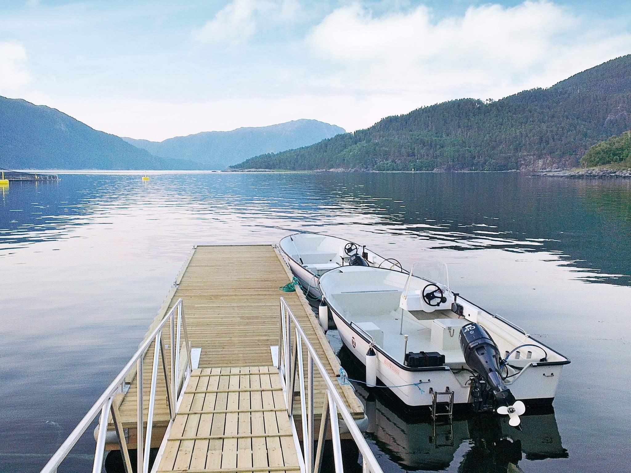 Nur 100 m vom Haus liegt das mietbare Boot (Typ Øien 530F) m. 40 PS 4-Takt Motor (Marke Yamaha), Steuerungskonsole, Elektrostarter, Chartplotter/GPS/Echolot und 6 Rutenhalterungen bereit. Sehr gutes Angelrevier im Fjord und zwischen den Inseln, teils mit viel Kabeljau. In den geschützten Gewässern kann ganz unabhängig von Wind und Wetter geangelt werden. Schwimmwesten sind inklusive. Per Boot sind es nur ca. 30 Min. Anfahrt nach Kristiansund. Filetierraum in der abschließbaren Garage mit Licht- und Wasseranschluss sowie Stauraum für Angelzubehör. Zudem Filetierbank außen. Zum Lachs- und Forellenfluss Bævra sind es 30 km, zum See Kaldbergsvatnet mit kl. Forellen etwa 8 km vom Haus.
