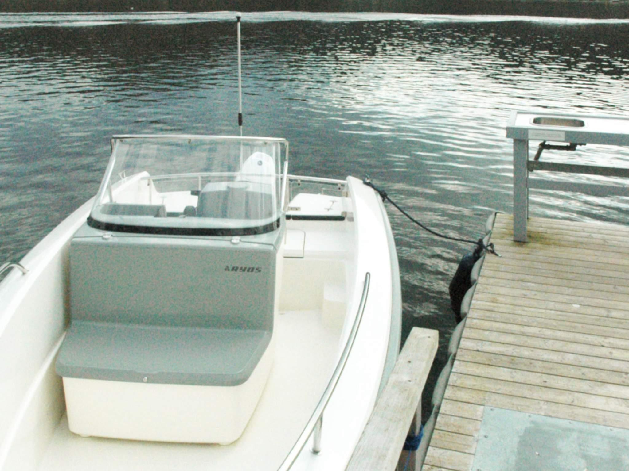 Am Schwimmsteg direkt unterhalb des Hauses liegt das mietbare Boot bereit: