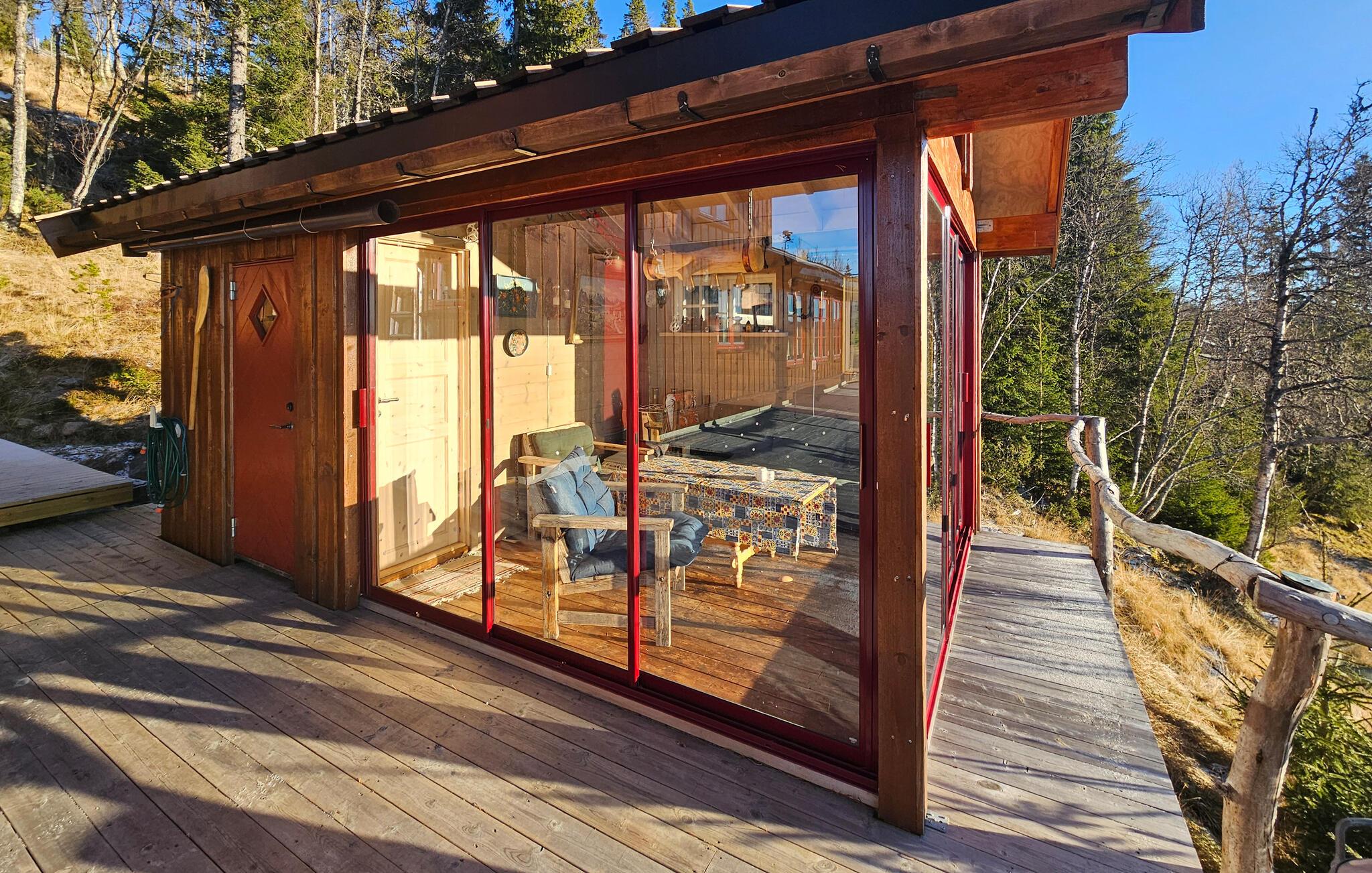 Machen Sie es sich im hellen Wohnraum auf dem großen Sofa bequem und genießen Sie das Zusammenspiel aus rustikalem Stil und Komfort. Der Raum ist liebevoll eingerichtet, mit Holzwänden, stilvollen Möbeln und großen Fenstern, die viel Licht hereinlassen. Entzünden Sie am Abend den Kaminofen und lassen Sie den Tag in wohliger Wärme ausklingen. Im Essbereich finden Sie einen großen Tisch für gemeinsame Mahlzeiten, und in der Küche steht alles bereit, um nach einer Wanderung ein herzhaftes Gericht zuzubereiten. Auch der Wintergarten lädt zu gemütlichen Stunden mit einer fantastischen Aussicht ein.