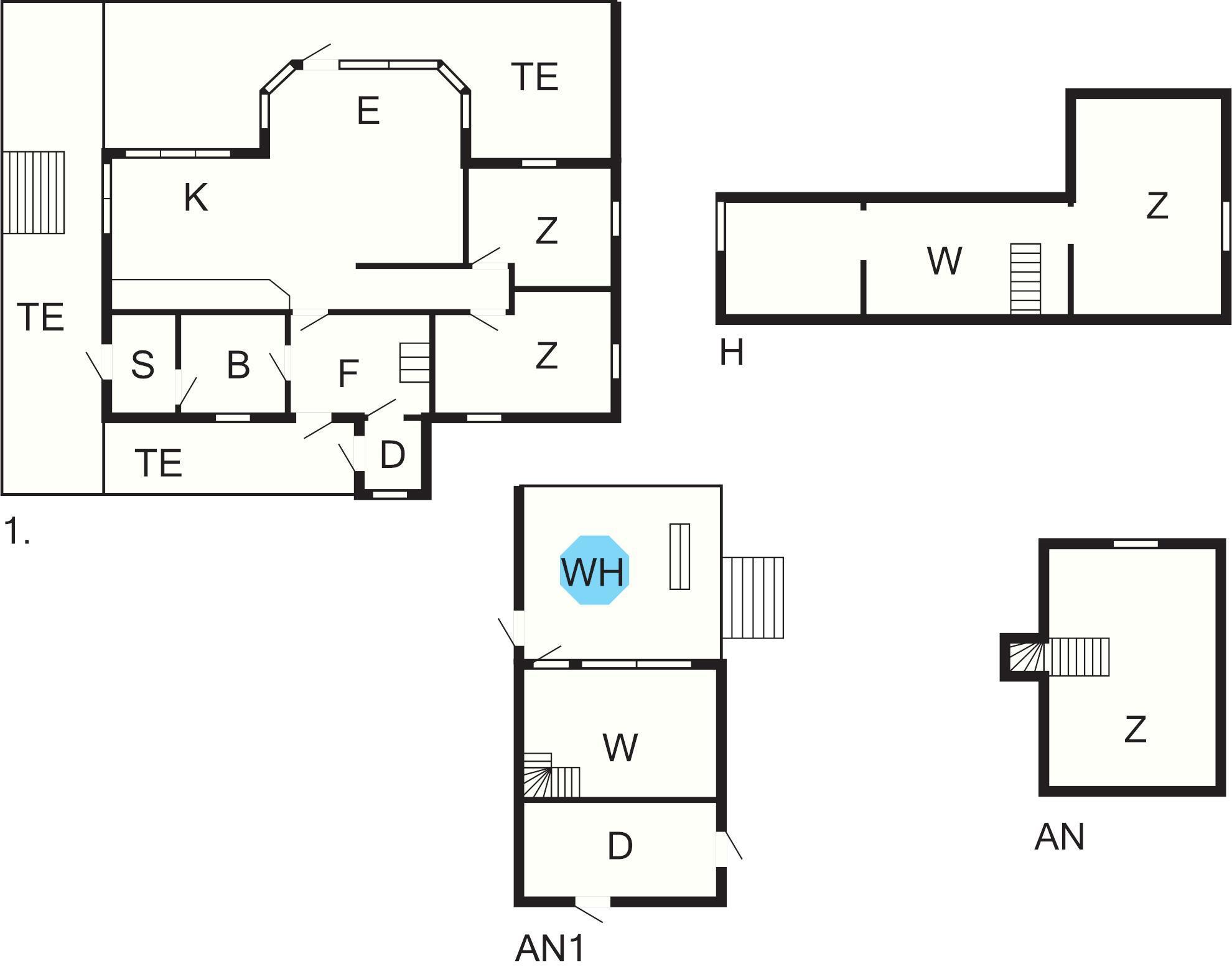 Schlafzimmer 1 bietet ein Doppelbett, Schlafzimmer 2 eine Familienkoje, wobei die untere Liegefläche 120 cm breit ist. Im Schlafzimmer 3 mit max. 175 cm Raumhöhe oben im Dachgeschoss stehen zwei breite Betten bereit. Im separaten Annex stehen 2 Einzelbetten und die Höhe des Schlafbodens beträgt hier 140 cm.