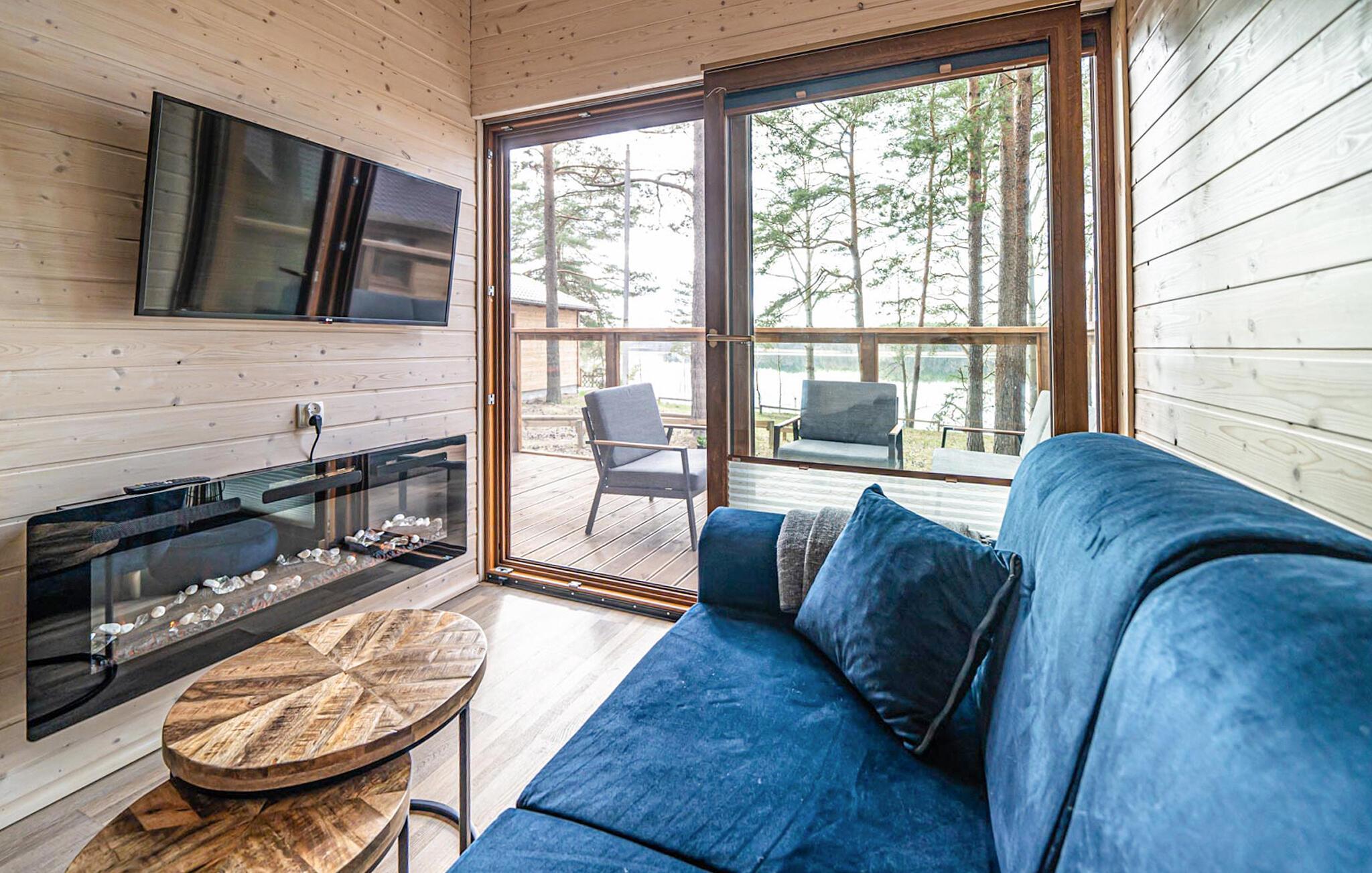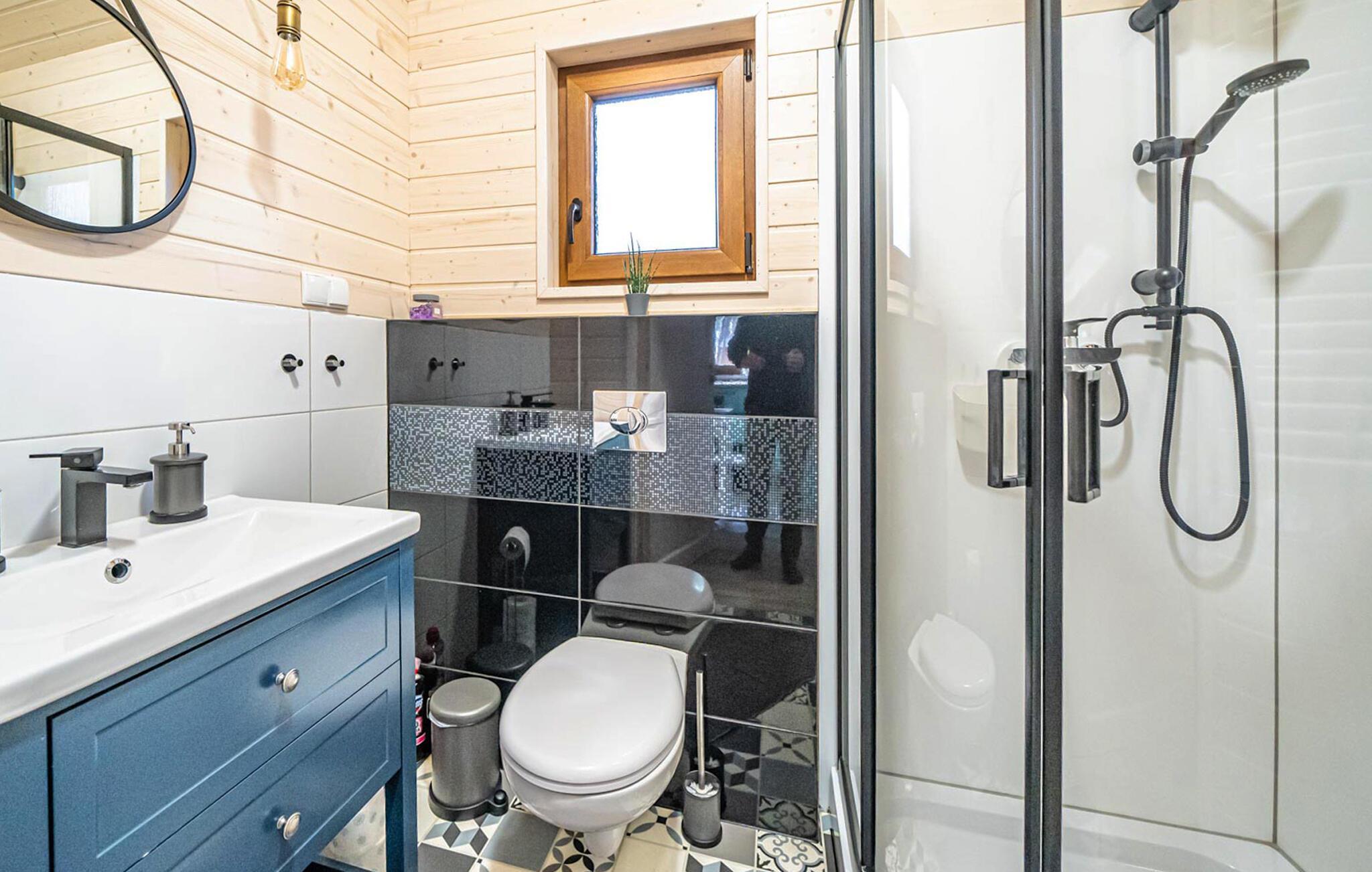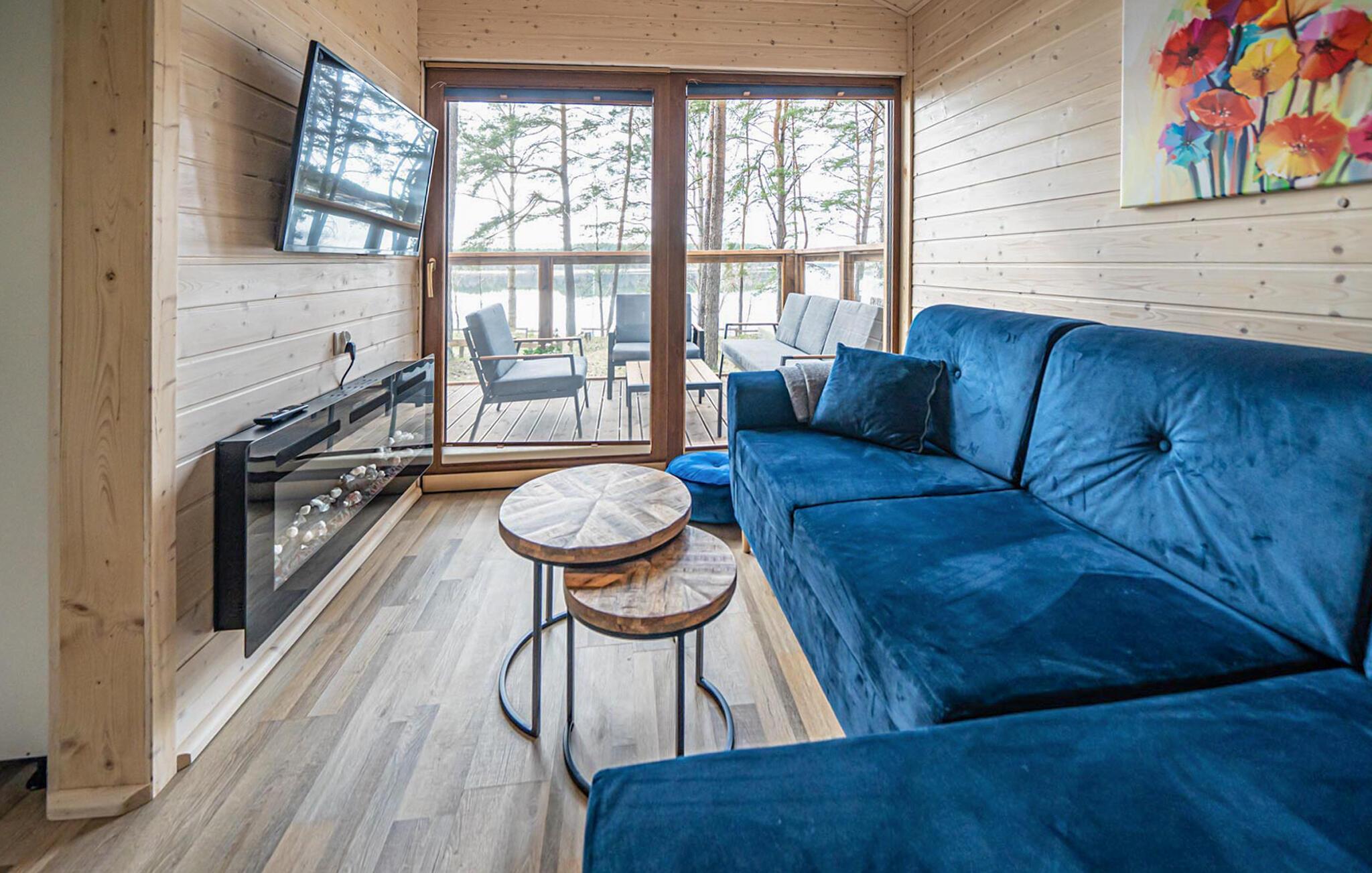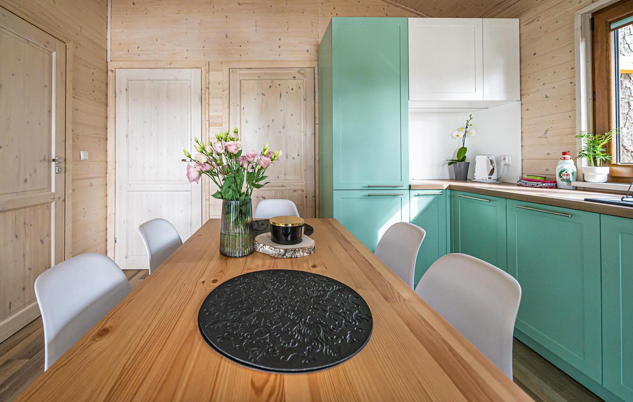 Dieses einladende Holzhaus mit Blick auf einen idyllischen See verspricht harmonische Stunden in seinem behaglichen, holzverkleideten Innenbereich und unvergessliche Erlebnisse in der Natur. Schwingen Sie in der modernen, offenen Küche den Kochlöffel und genießen Sie Ihre Mahlzeiten am stilvollen Esstisch. Kuscheln Sie sich abends auf die bequeme Couch und streamen Sie einen guten Film oder eine spannende Serie.