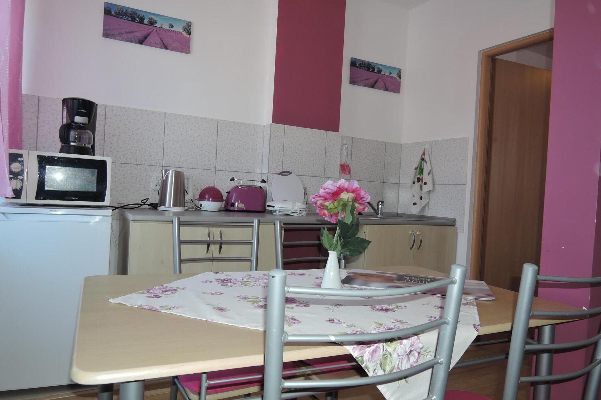 In der 2. Etage: (offene Küche(Wasserkocher, Kochendwasserhahn, Toaster, Espressomaschine, Mikrowelle, Kühlschrank), Wohn-/Schlafzimmer(Doppelschlafcouch, Esstisch), Schlafzimmer(Einzelbett, Einzelbett, TV(Deutsch Fernsehsender)), Badezimmer(Dusche, Waschbecken, Toilette)) Internet, Terrasse(Gemeinschaftliche Nutzung mit anderen Gästen, 25 m2), Parkplatz