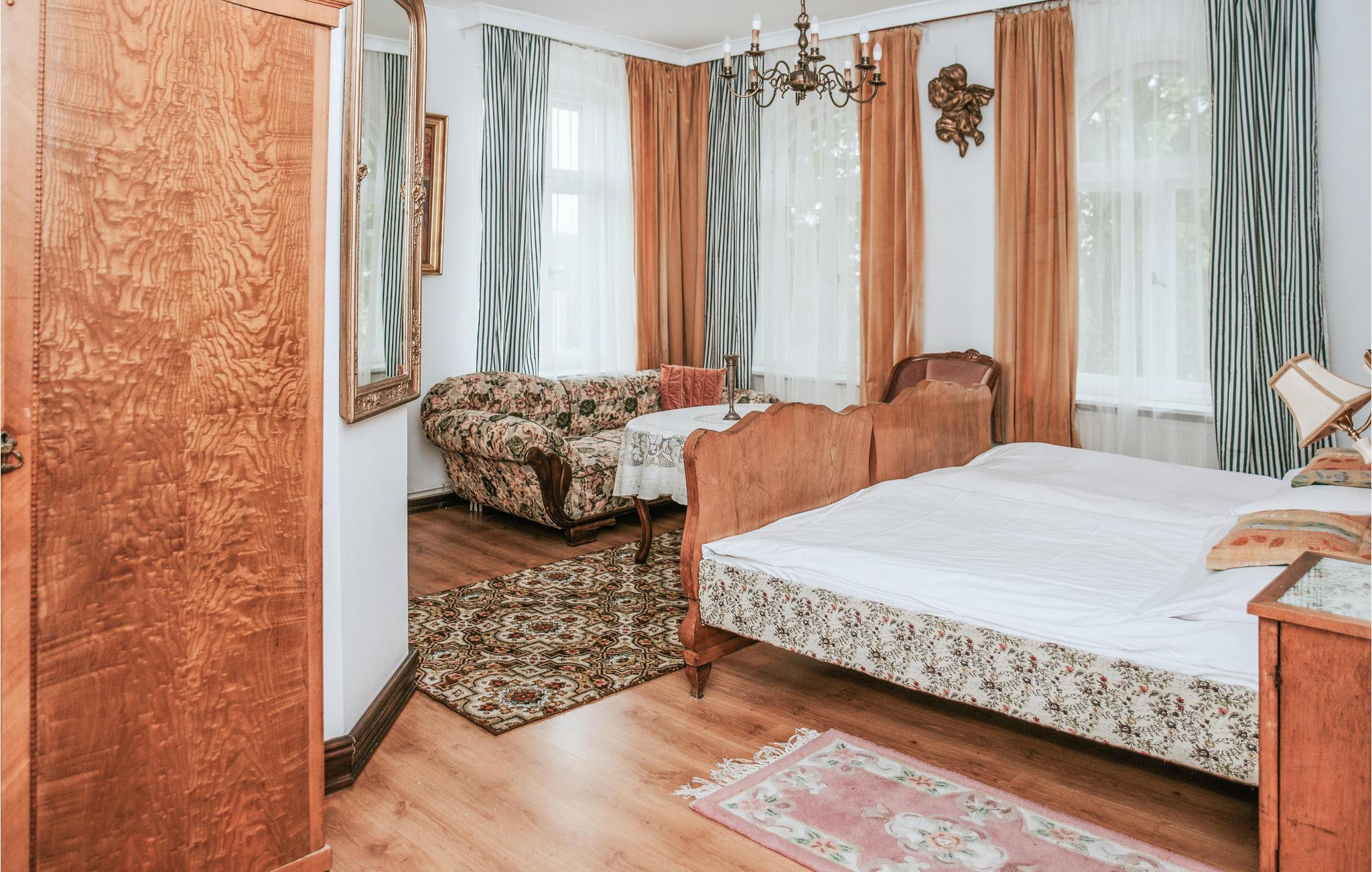 Diese einladende Ferienwohnung empfängt Sie in schöner Lage in einem alten Gebäude auf einem gemeinsamen Grundstück. Der Urlaubsort passt perfekt zu zwei befreundeten Familien oder einer Gruppe von Freunden. Die Räume erhalten ihren besonderen Charme durch die auffallenden Möbeln im altmodischen eleganten Stil, die warmen Farben, viele niedliche Details, hölzerne Elemente, große Fenster und schöne Vorhänge. Hier fühlen Sie sich wie auf einer Zeitreise in die Vergangenheit. Unterhalten Sie sich unter dem Kronleuchter bei gutem Essen oder genießen Sie leckeres Grillessen auf der offenen Terrasse. Auf dem Balkon können Sie den Sonnenuntergang bewundern.