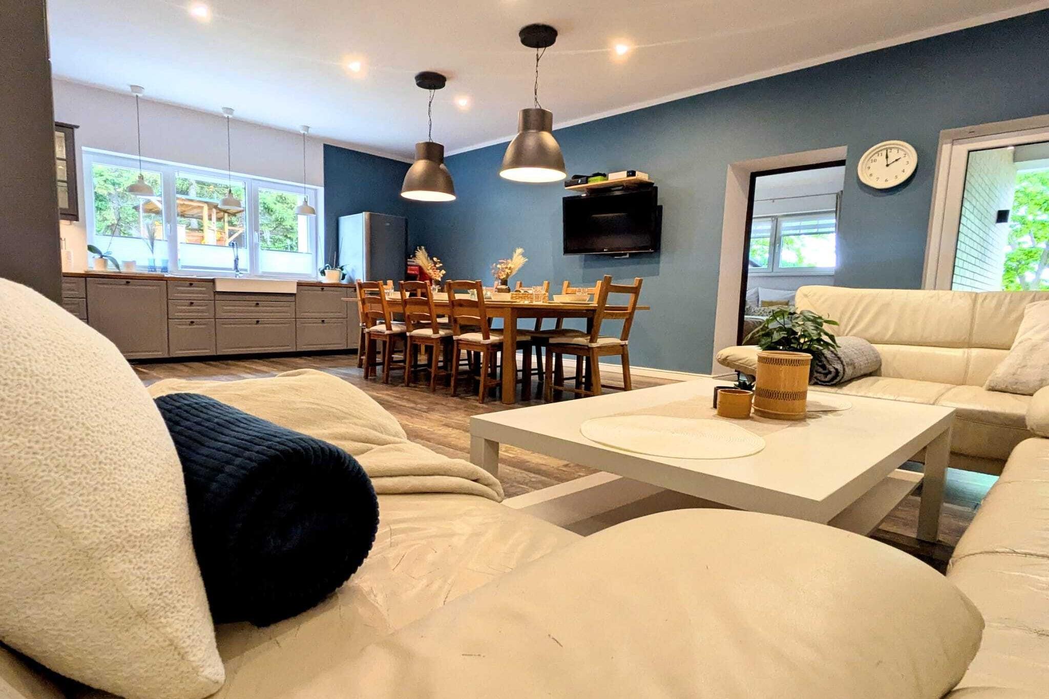 Ein gemütlicher Ferienort in unmittelbarer Nähe des Flusses Parseta. Ruhige Lage, nur wenige Schritte vom Zentrum entfernt. Zum Strand sind es 650 m. In der Nähe befindet sich der Fischmarkt, wo Sie frischen Fisch direkt vom Kutter kaufen können. Die komfortable, sehr geräumige Wohnung (Erdgeschoss) bietet Platz für bis zu 14 Personen. Sie besteht aus einem Wohnzimmer (großer Tisch, Fernseher, Videospielkonsole) und einer perfekt ausgestatteten Küche. Es gibt vier separate Schlafzimmer, zwei Badezimmer mit Duschen (eine Waschmaschine ist vorhanden) und ein separates WC. Eine überdachte Terrasse mit Gartenmöbeln und Liegestühlen ist ebenfalls vorhanden. Ein Spielplatz mit Trampolin ist ebenfalls vorhanden. Zentralheizung und WLAN sind verfügbar. Auf dem eingezäunten Gelände befinden sich eine Sauna (im Aufenthaltspreis inbegriffen) mit Badewanne zum Abkühlen, eine Sommerküche, ein Parkplatz und ein schöner Grillpavillon mit Grillzubehör. Vom Grundstück aus haben Sie direkten Zugang zum Flussufer, wo Sie auf Liegestühlen entspannen oder beim Angeln entspannen können. Allen Gästen der Anlage steht außerdem ein Ruderboot kostenlos zur Verfügung. Frühstück kann vor Ort erworben werden. Im Aufenthaltspreis enthalten sind: Bettwäsche, Handtücher, Strom- und Wasserverbrauch, Sauna, Endreinigung, Internet, Parkplatz, Kinderbett und Hochstuhl (Reservierung erforderlich) sowie Ruderboot. Die größte Attraktion des Kurorts Kolobrzeg ist der breite Sandstrand. Es gibt auch zahlreiche Spazierwege im Strandpark, entlang der Strandpromenade, der historischen Mole und in der Altstadt. Sehenswert sind der Leuchtturm, das Ozeanarium, der Seehafen und die Kathedrale. Familien mit Kindern empfehlen wir den Pomerania Fun Park. Dieser ganzjährig geöffnete Park befindet sich im Dorf Dygowo (ca. 15 km von Kolobrzeg entfernt).