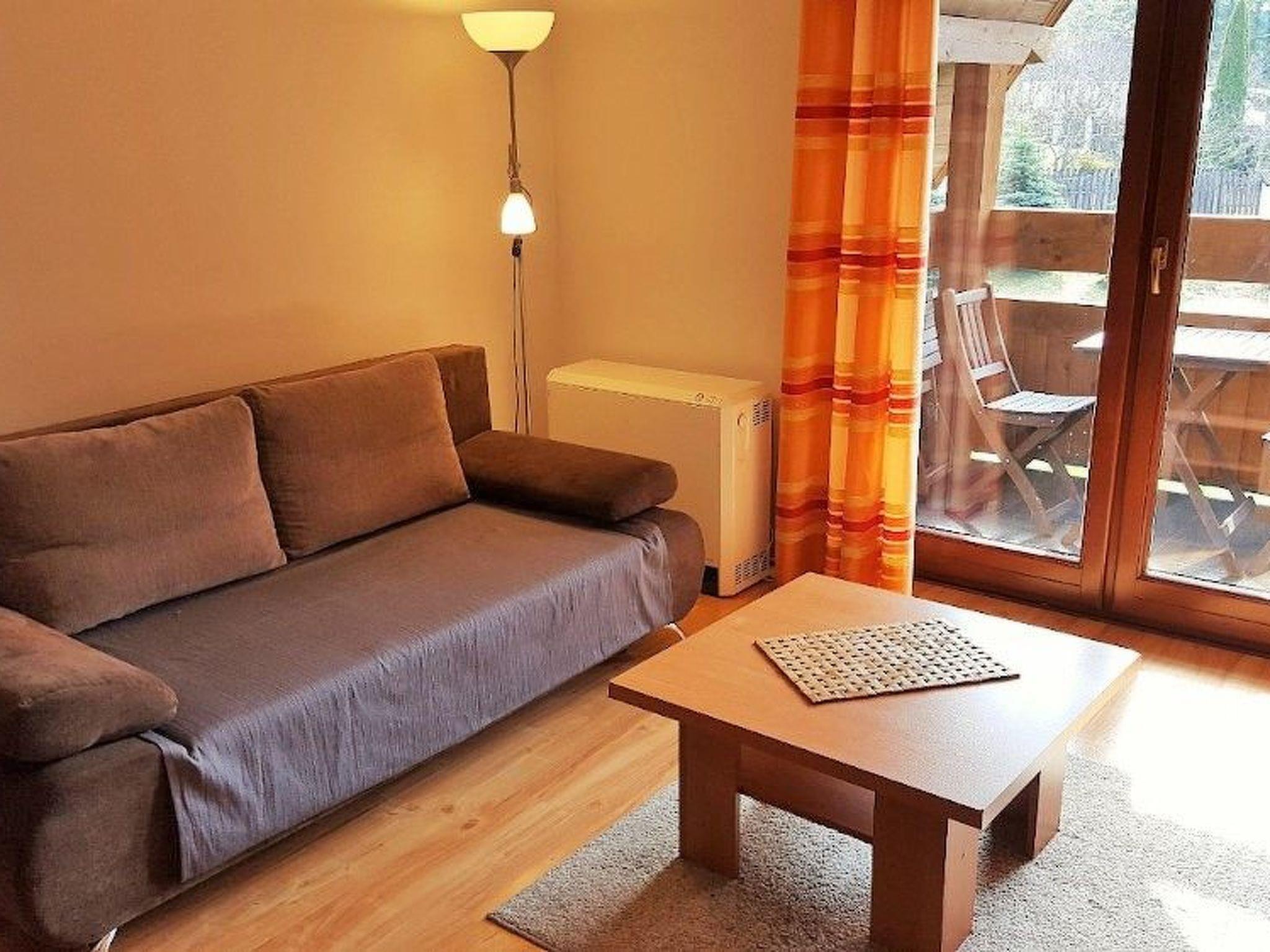 - Wohnzimmer mit 2-sitziger Schlafcouch, Kochnische, TV, mit Blick auf die Tatra,