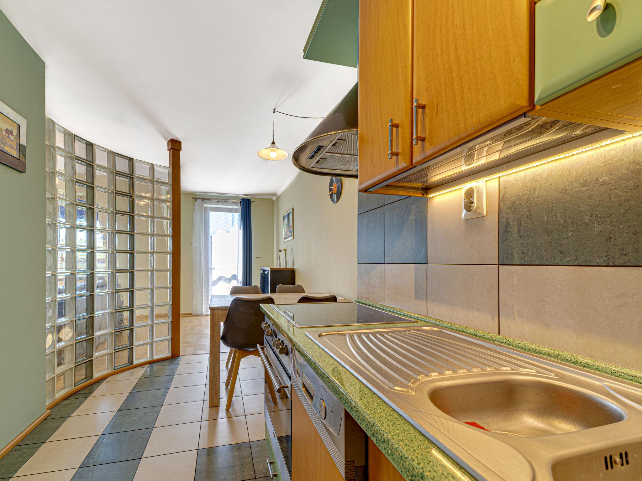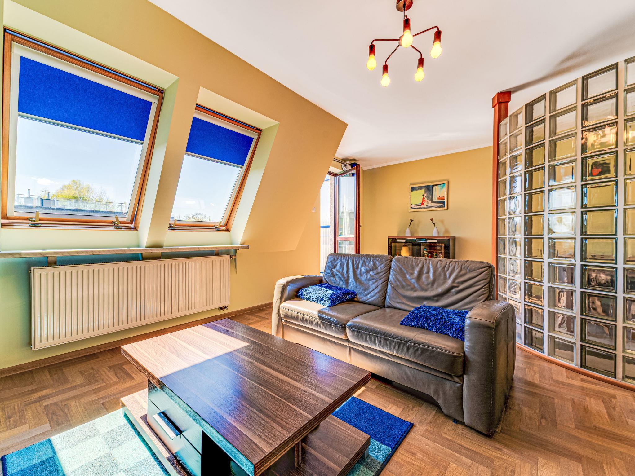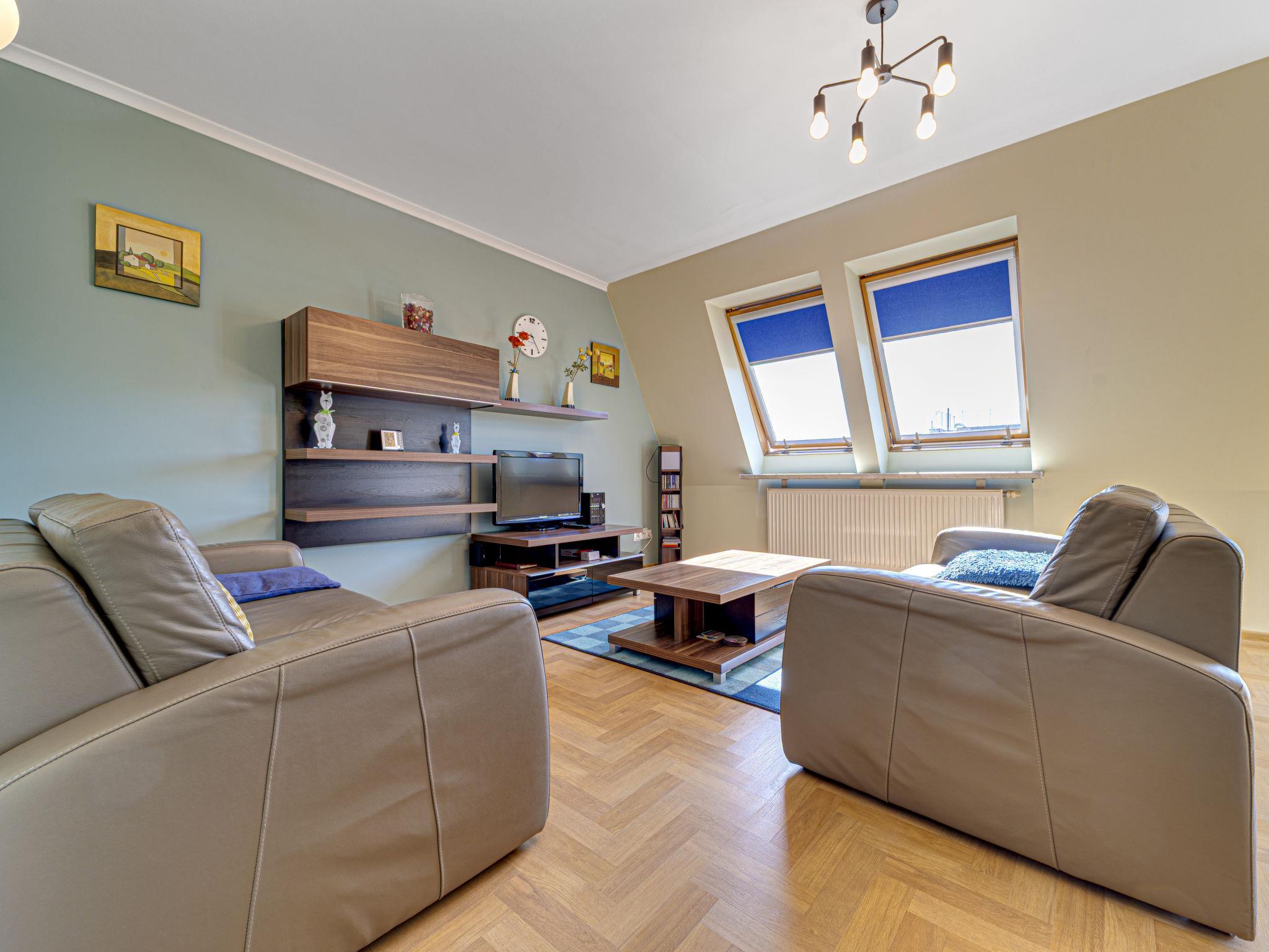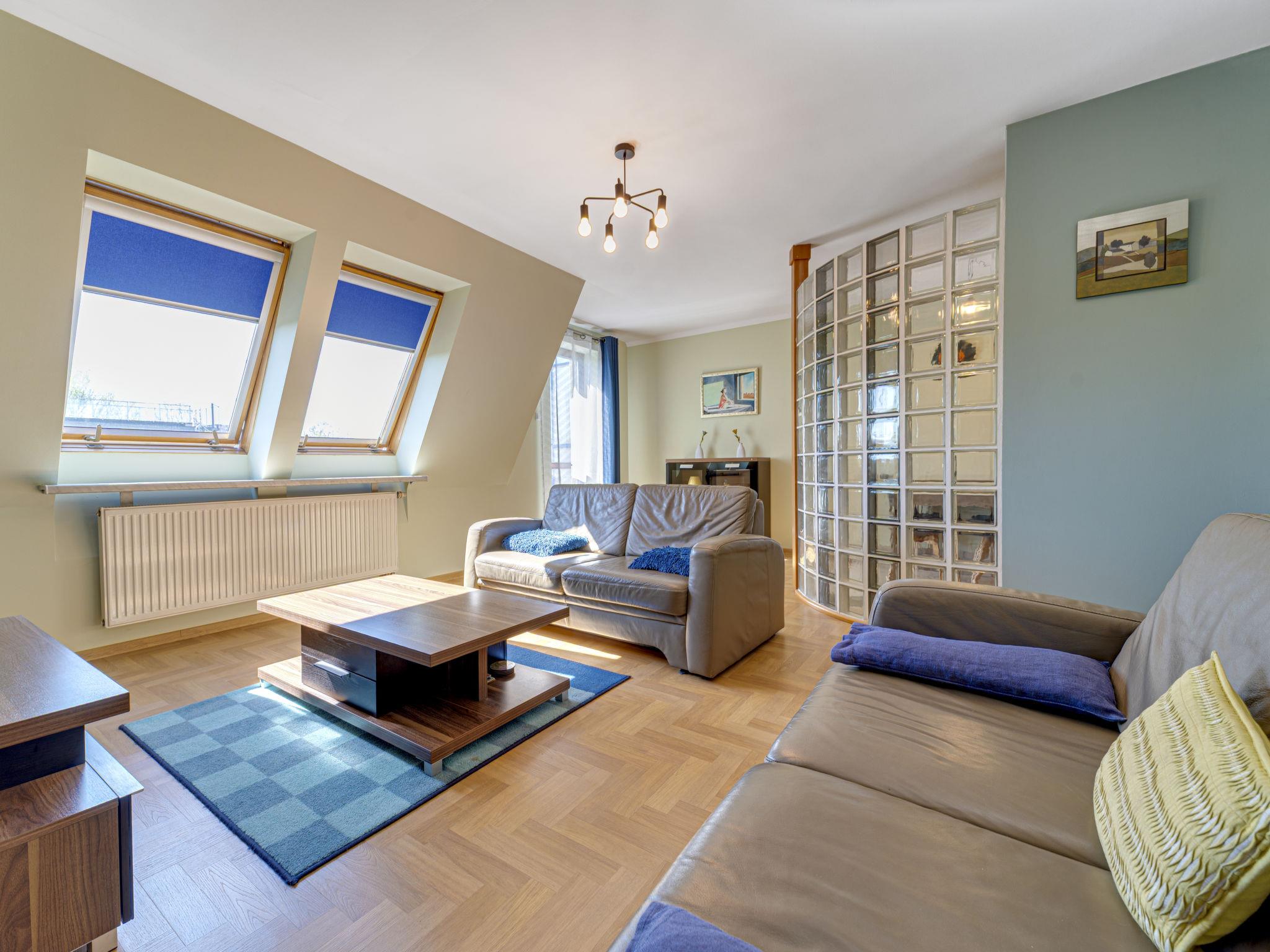 3-Zimmer-Wohnung 70 m2, im Dachgeschoss. Zweckmässig und schön eingerichtet: offenes Wohnzimmer mit 2 Doppeldiwanbetten (140 cm), TV, Radio, CD, Stereoanlage und DVD. Ausgang zum Balkon. 1 abgeschrägtes kleines Zimmer 9 m2 mit 1 Doppelbett (140 cm, Länge 200 cm). 1 abgeschrägtes kleines Zimmer 8 m2 mit 2 Betten (80 cm, Länge 200 cm). Offene Küche (Backofen, Geschirrspüler, 4 Glaskeramikplatten, Mikrowelle) mit Bar. Bad/WC. Balkon. Zur Verfügung: Kinderhochstuhl, Babybett bis 2 Jahre, Haartrockner. Internet (WLAN). Bitte beachten: TV nur PL. Rauchmelder. 52031321214