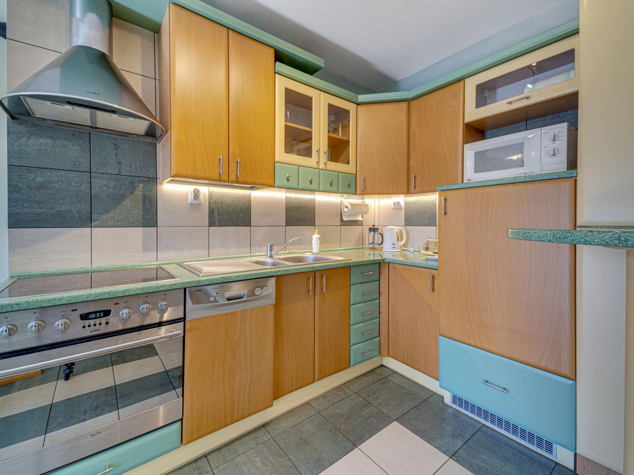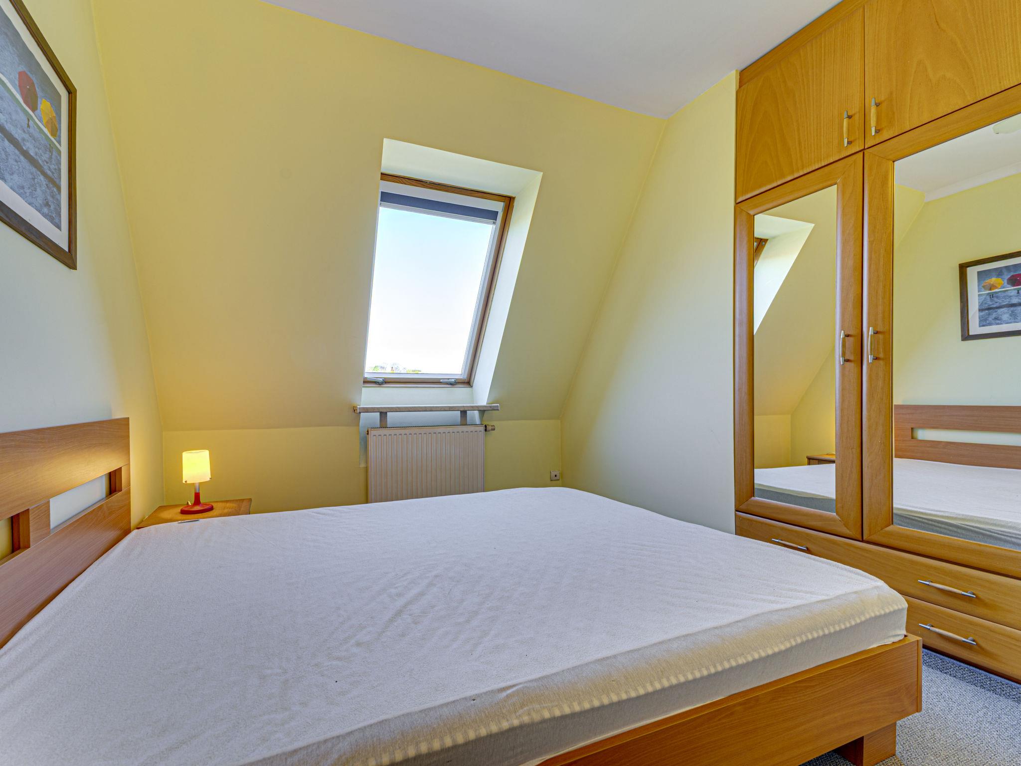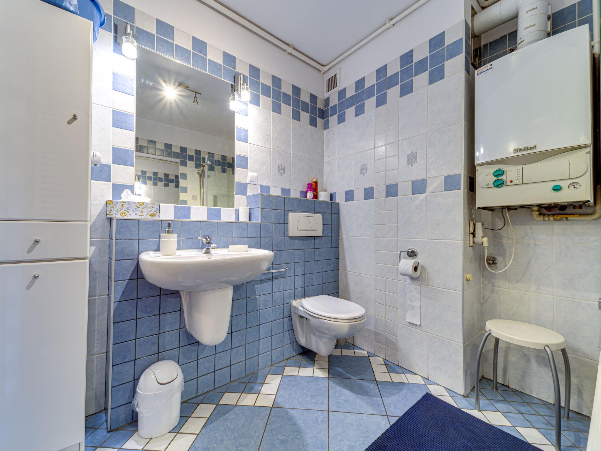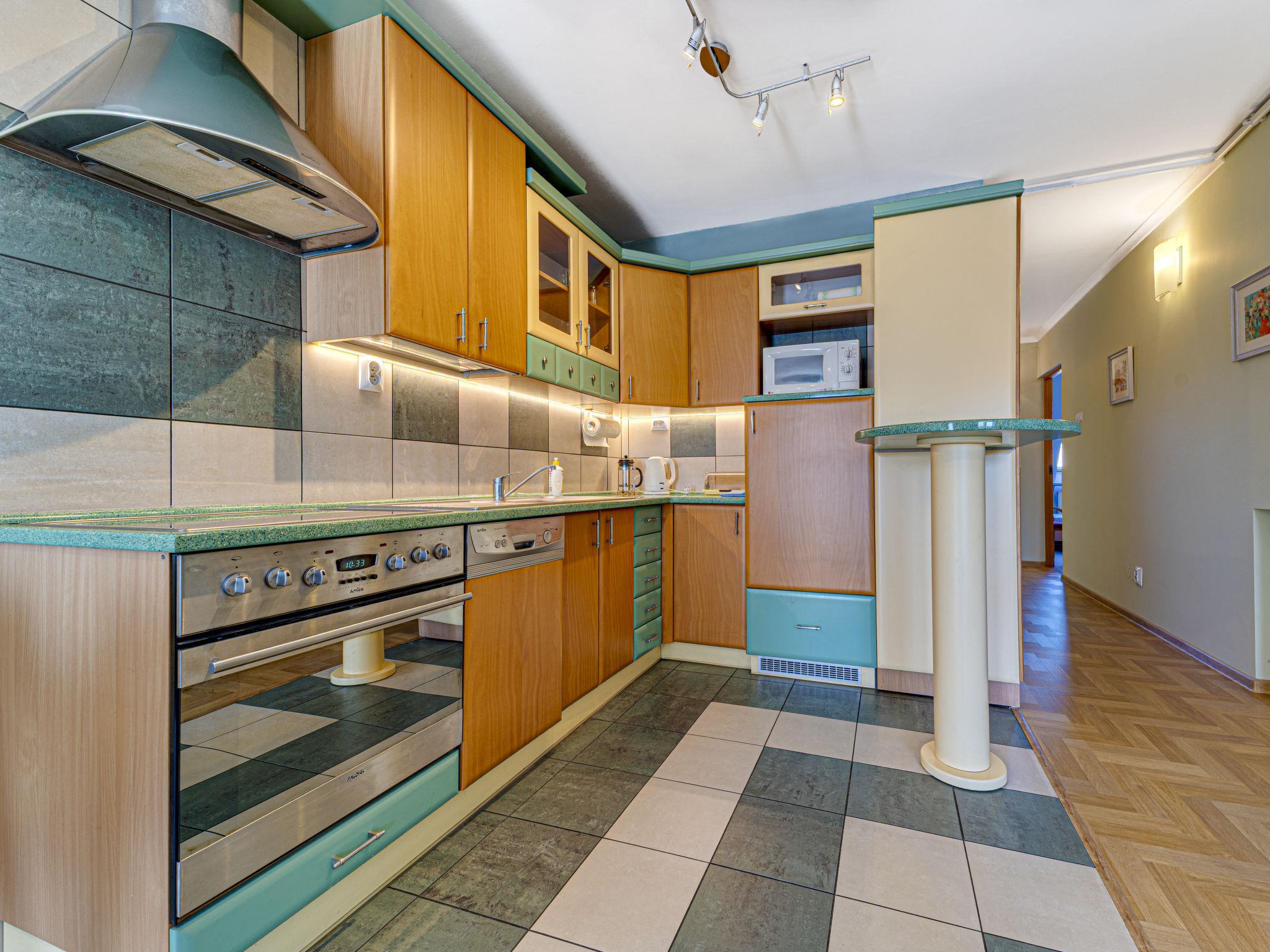 3-Zimmer-Wohnung 70 m2, im Dachgeschoss. Zweckmässig und schön eingerichtet: offenes Wohnzimmer mit 2 Doppeldiwanbetten (140 cm), TV, Radio, CD, Stereoanlage und DVD. Ausgang zum Balkon. 1 abgeschrägtes kleines Zimmer 9 m2 mit 1 Doppelbett (140 cm, Länge 200 cm). 1 abgeschrägtes kleines Zimmer 8 m2 mit 2 Betten (80 cm, Länge 200 cm). Offene Küche (Backofen, Geschirrspüler, 4 Glaskeramikplatten, Mikrowelle) mit Bar. Bad/WC. Balkon. Zur Verfügung: Kinderhochstuhl, Babybett bis 2 Jahre, Haartrockner. Internet (WLAN). Bitte beachten: TV nur PL. Rauchmelder. 52031321214