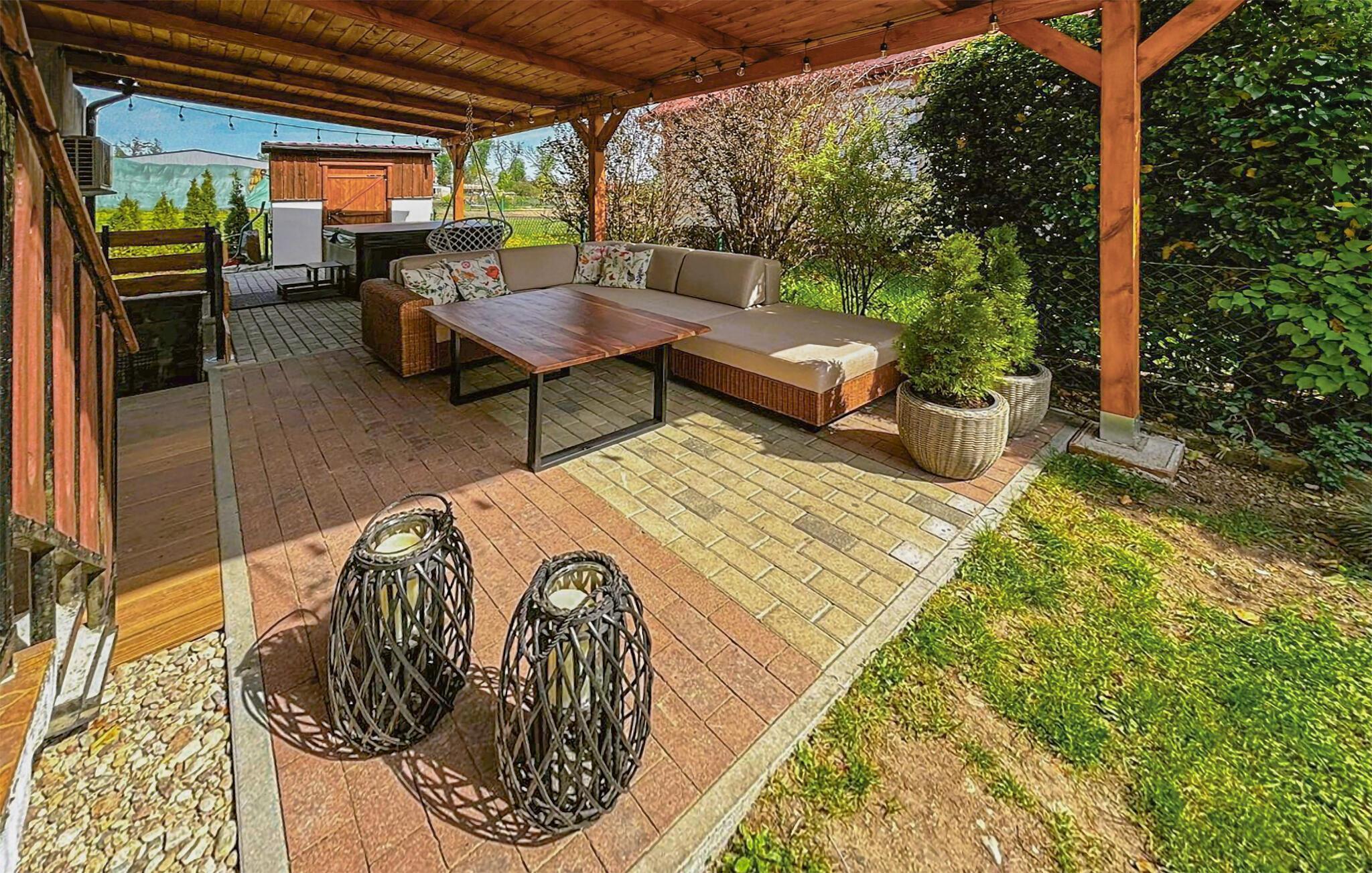 Der Außenbereich des Ferienhauses lädt zu vielfältigen Aktivitäten ein. Entspannen Sie in der Hängematte und sehen Sie Ihren Kindern beim Schaukeln zu. Spielen Sie gemeinsam Federball und nutzen Sie abends den Grill für gesellige Abende im Freien. Für völlige Entspannung sorgt Ihr Whirlpool.