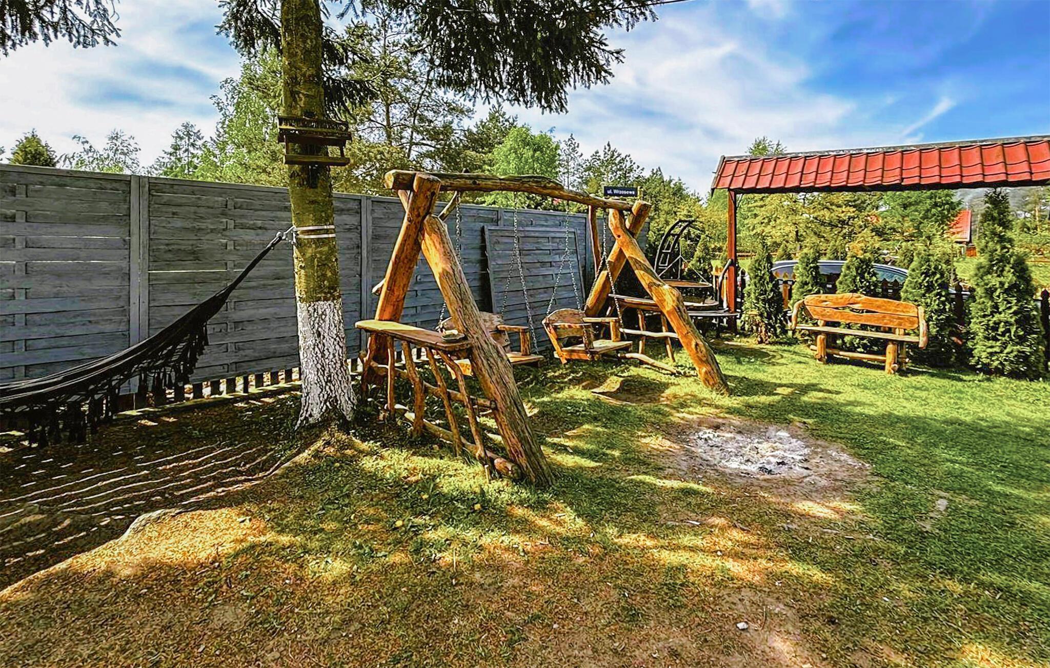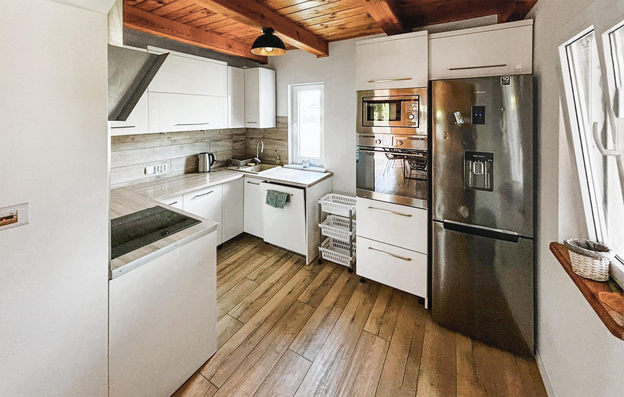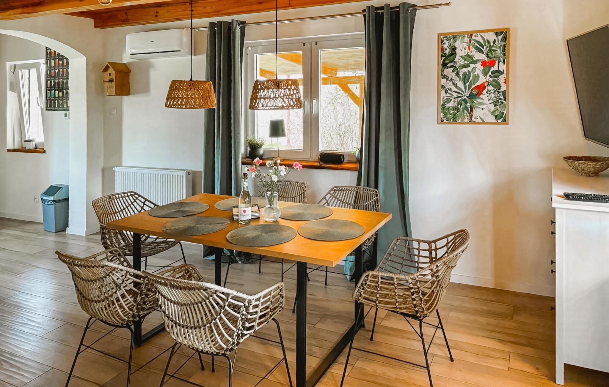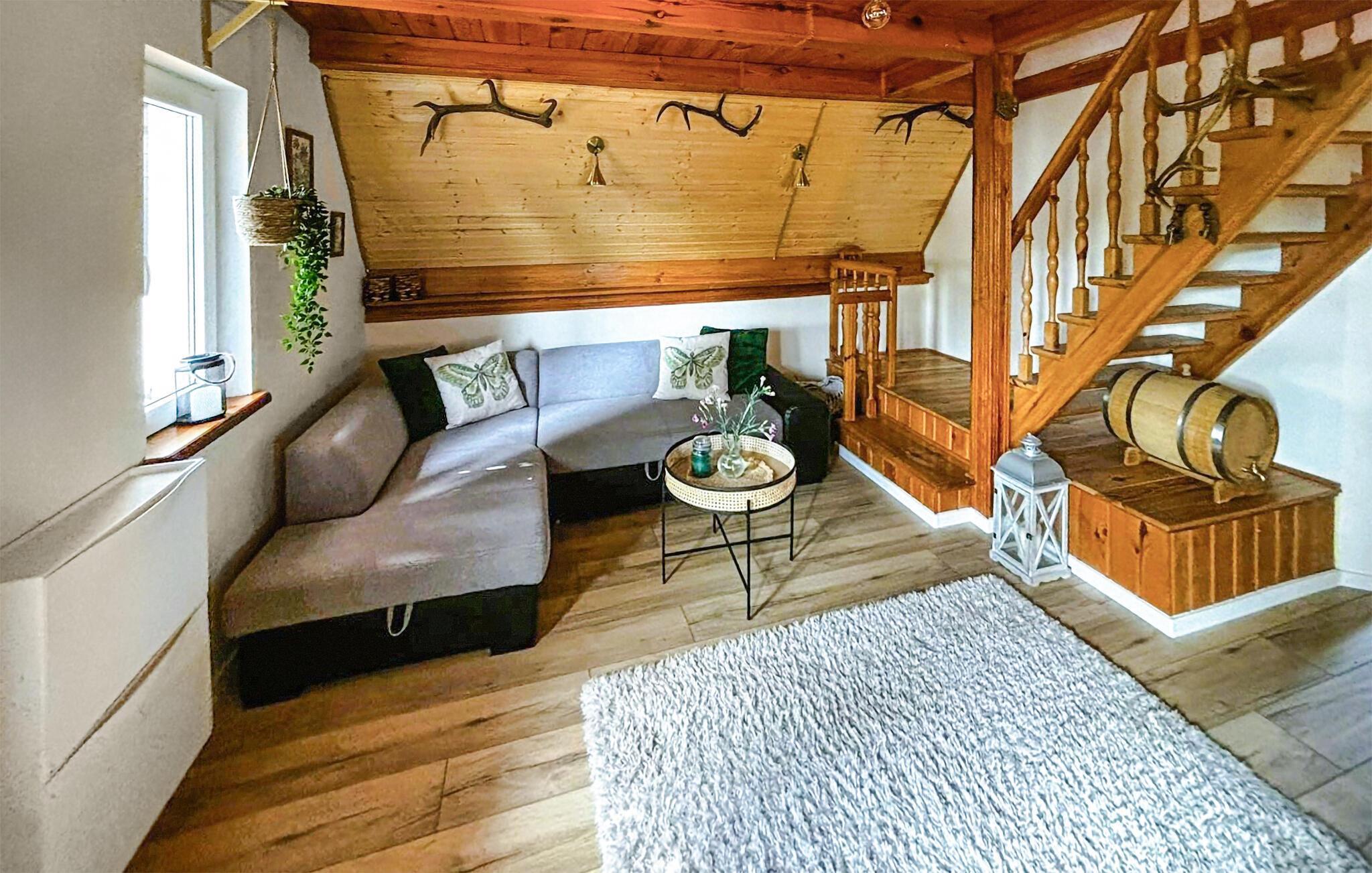 Herzlich willkommen am See Jezioro Kucki, auf Deutsch bekannt als Kauziger See, zu einem traumhaften Urlaub mit der ganzen Familie. In diesem komfortablen Ferienhaus können Sie sich erholen und zahlreiche Naturerlebnisse genießen. Machen Sie es sich morgens beim Frühstück am Esstisch bequem und genießen Sie die behagliche Atmosphäre des Holzambientes und der liebevollen Deko-Details. Auch die Sofaecke strahlt Gemütlichkeit aus und lädt zum Kartenspielen oder Bücherlesen ein. Nutzen Sie die Möglichkeit, den Tag entspannt zu starten und sich auf die bevorstehenden Urlaubsaktivitäten vorzubereiten.