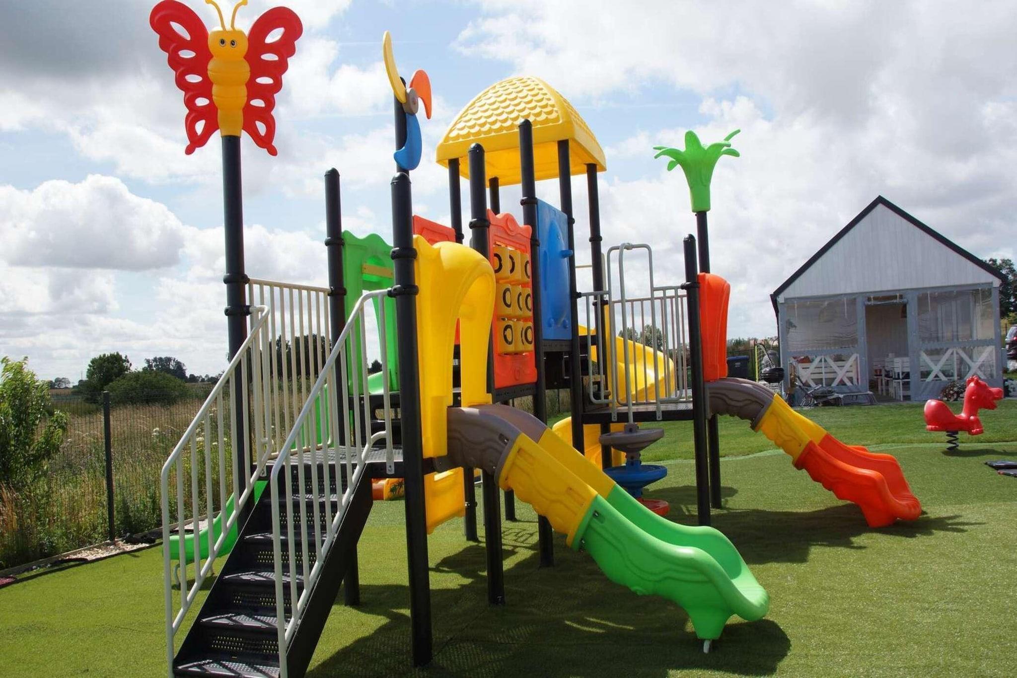 Parterre: (offene Küche(Kochplatte(2 Kochplatten, Induktion), Wasserkocher, Toaster, Dunstabzugshaube, Mikrowelle, Spülmaschine, Kühl-/Gefrierkombination), Wohn/Esszimmer(Doppelschlafcouch, TV(Flatscreen, smart TV), Esstisch), Schlafzimmer(Doppelbett(160 x 200 cm)), Schlafzimmer(Einzelbett(90 x 200 cm), Einzelbett(90 x 200 cm)), Badezimmer(Dusche, Waschbecken, Toilette, Föhn)) Zentraler Grill, Rezeption, Internet, Parkplatz, Spielplatz, Liegewiese, Kaffeemaschine, Heizung(elektrisch, durch Klimaanlagen), Klimaanlage, Terrasse, Garten(Gemeinschaftliche Nutzung mit anderen Gästen, umzäunt, 3000 m2), Gartenmöbel, Rutsche(Gemeinschaftliche Nutzung mit anderen Gästen), Hochstuhl, Gartenhaus, Schaukel, Babybett (kostenlos)