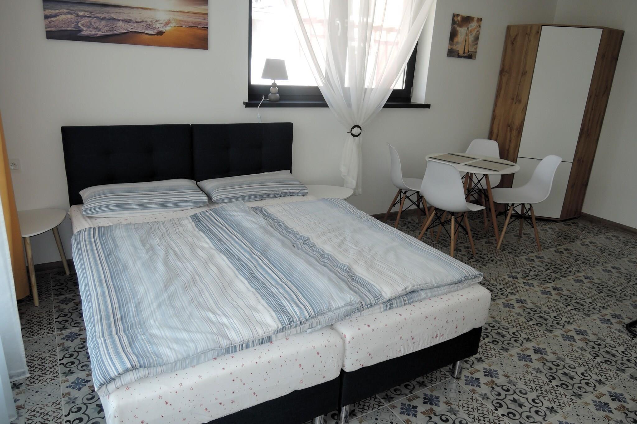 Eine komfortable Ferienwohnung in Mrzezyno genießt eine einzigartige Lage direkt an den Sandstränden, umgeben von üppigen Wäldern, was sie zu einem idealen Ort für Entspannung, Erholung und Regeneration macht. Im Herzen des Ortes gelegen, ist es ein ausgezeichneter Ausgangspunkt für die Erkundung der Stadt mit ihren Sommerattraktionen und malerischen Waldwegen und Straßen, die zu Spaziergängen und Fahrradausflügen inmitten der Natur einladen. Das Apartment bietet komfortable Aufenthaltsbedingungen und verfügt über ein geräumiges Wohnzimmer mit bequemen Betten, das mit einer ausgestatteten Küche mit Kühlschrank und Kaffeemaschine sowie einem Badezimmer mit Dusche verbunden ist. Ein zusätzlicher Vorteil ist eine große Terrasse (im ersten Stock, gemeinsam mit anderen Gästen) mit einer Fläche von 40 m2, von der aus man einen malerischen Ausblick hat, perfekt für ein morgendliches Frühstück im Freien oder abendliche Entspannungsmomente. Bettwäsche ist im Apartment vorhanden. Den Gästen stehen außerdem ein garantierter Parkplatz und Breitband-Internet zur Verfügung. Mrzezyno ist ein Ferienort und Fischereihafen 12 km westlich von Kolberg, an der Mündung des Flusses Rega. Die Stadt liegt im Trzebiatowsko-Kolobrzeg-Küstengürtel, einem besonderen Schutzgebiet des Natura-2000-Programms, das ein gesundes Mikroklima schafft. Der schöne, sandige und saubere Strand in Mrzezyno mit einem Streifen Kiefernwald wird jeden zufrieden stellen, der sich abseits der Hektik der Stadt entspannen möchte. Mrzezyno ist einer der wenigen Strände in Polen mit der „Blauen Flagge“, einem Symbol für das hohe Niveau des Strandes, die höchste Wasserqualität und das höchste Maß an Sicherheit (eine große Anzahl gut ausgebildeter Rettungsschwimmer). Die Lage von Mrzezyno macht es zu einem wahren Paradies für Angler. Vom Meer getrennt durch einen breiten, schönen Strand und einen mit Pinien bewachsenen Dünenstreifen. Hier herrscht ein Meeresmikroklima, das durch geringe Temperaturschwankungen und einen hohen Jodgehalt gekennzeichnet ist. Die Stadt bezieht ihr Wasser aus tiefen Quellen. Hier herrscht ein spezifisches Mikroklima, das durch einen erheblichen Gehalt an Meersalz und Jod gekennzeichnet ist