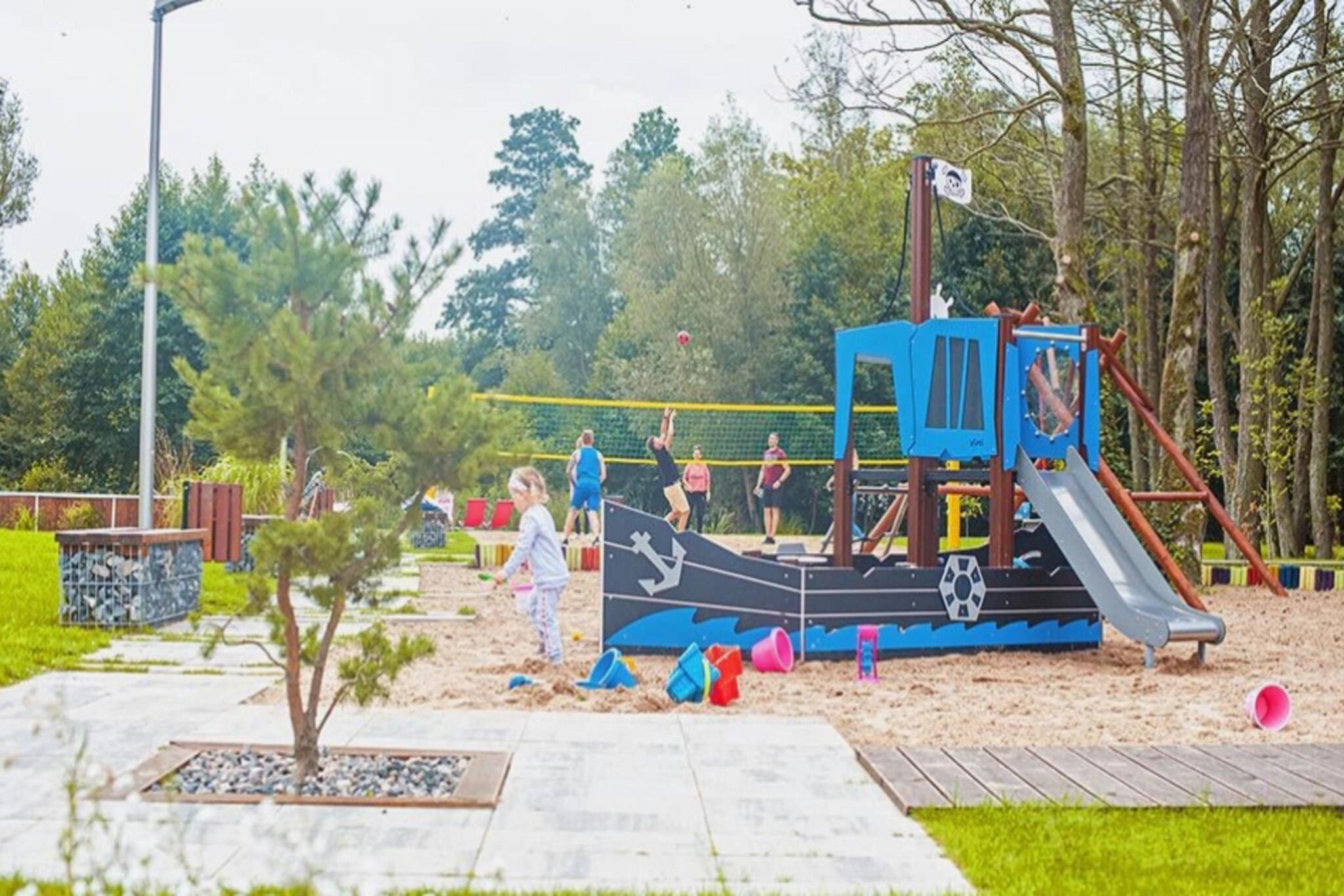Parterre: (offene Küche(Kochplatte(2 Kochplatten, Ceranfeld, elektrisch), Wasserkocher, Toaster, Dunstabzugshaube, Kaffeemaschine, Spülmaschine, Kühl-/Gefrierkombination), Wohn/Esszimmer(Doppelschlafcouch, TV(Flatscreen, digital, smart TV, Deutsch Fernsehsender, internationale TV-Kanäle), Esstisch(4 Personen)), Schlafzimmer(Doppelbett), Badezimmer(Dusche, Waschbecken, Toilette, Föhn)) Rezeption, Internet, Parkplatz, Kosmetikzentrum, Massage, Sauna, Sportplatz, Angeln, Volleyvallfeld, Schach, Restaurant, Bar, Spielplatz, Liegewiese, Babybadewanne, Heizung(Fußbodenheizung, durch Klimaanlagen), Klimaanlage, Terrasse(alleinige Nutzung, 9 m2), Garten(Gemeinschaftliche Nutzung mit anderen Gästen, umzäunt, 10000 m2), Gartenmöbel, Liegen, Grill(auf Anfrage, elektrisch), Pool(Gemeinschaftliche Nutzung mit anderen Gästen, im Garten, beheizbar, 10 x 5 m., geöffnet von 1/2 Mai bis einschließlich Sep), Fitnessgeräte, Hängematte, Hochstuhl, Gartenhaus, Babybett (kostenpflichtig), Alarmanlage