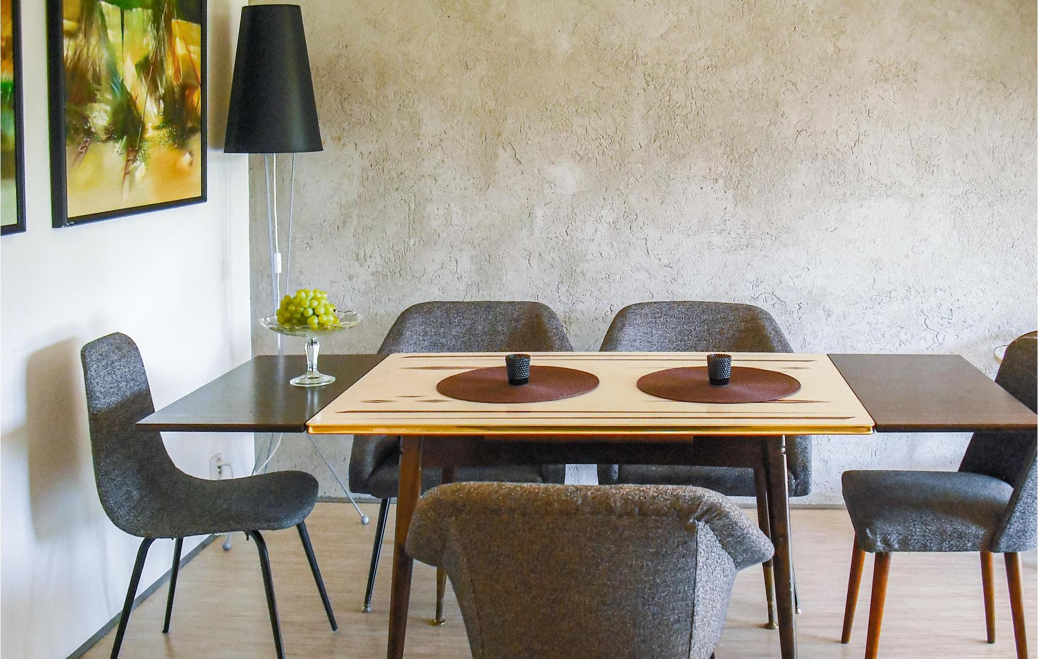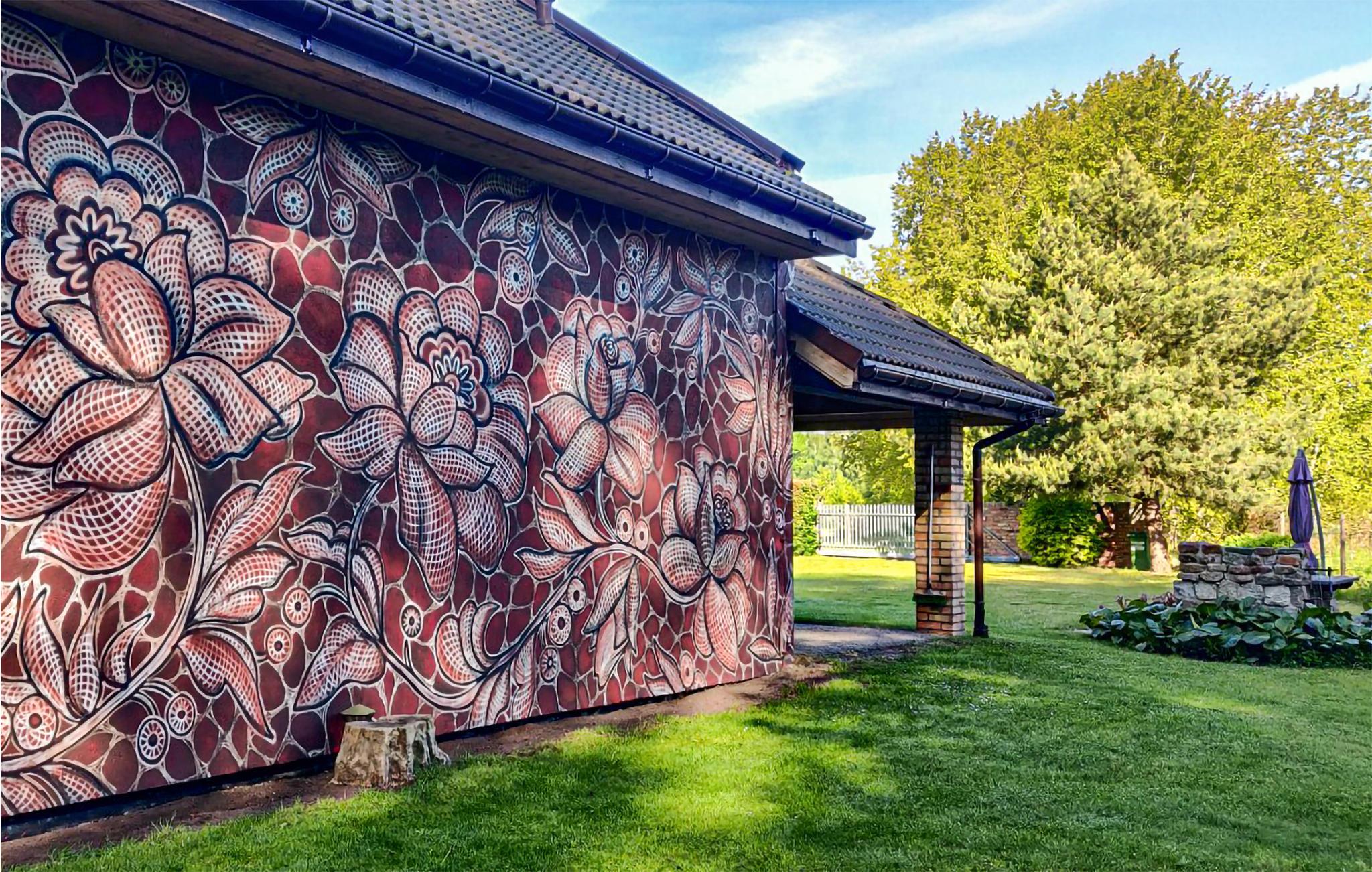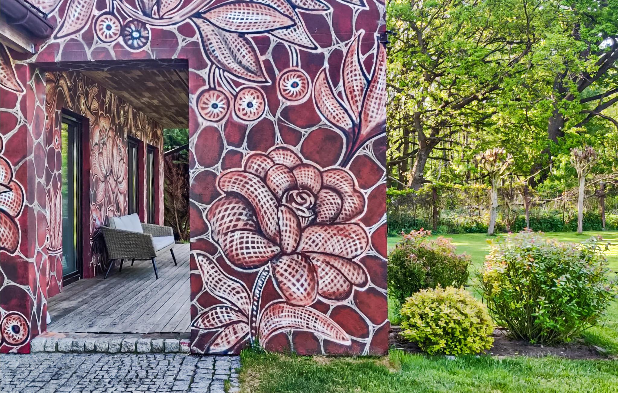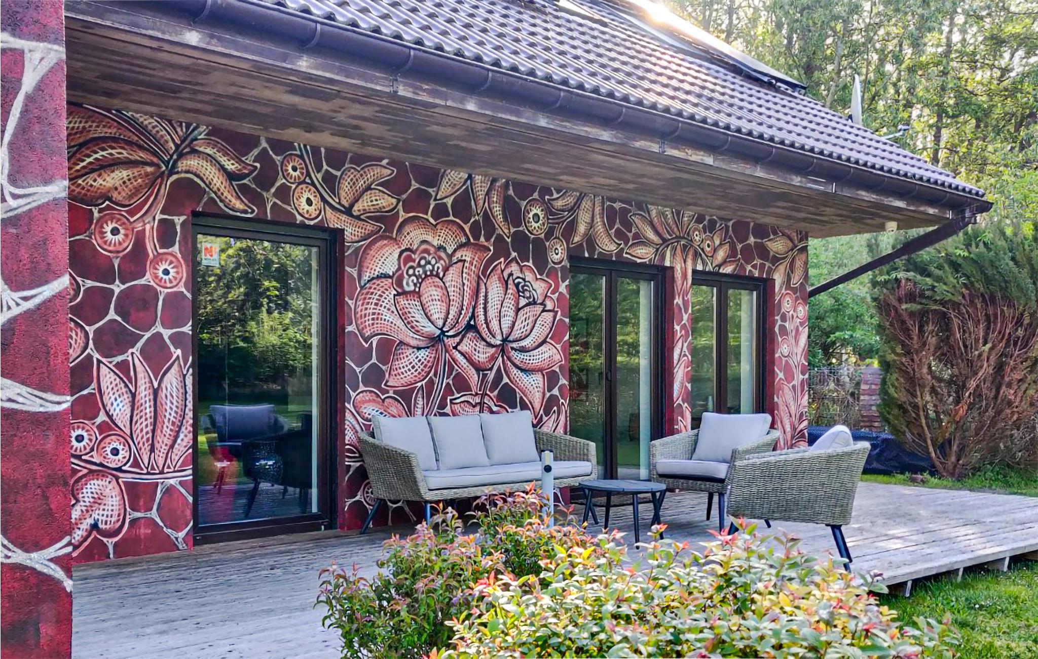 Dieses architektonisch interessante Haus liegt sehr idyllisch auf einem Naturgrundstück in einer wald- und feldreichen Umgebung. Die Künstlerin Nes Nespoon gestaltete die Fassade des Gebäudes, die mit ihrem spitzenartigen Muster, inspiriert von traditioneller Handwerkskunst, die Aufmerksamkeit auf sich zieht. Sie ist eine renommierte polnische Gegenwartskünstlerin, deren Arbeiten Street Art, Keramik, Malerei und Konzeptkunst miteinander verbinden. Im Inneren des Hauses können Sie zeitgenössische Gemälde polnischer Künstler sowie polnische Vintage-Möbel aus den 1960er- und 1970er-Jahren bewundern. Das Haus ist ein idealer Ort, um an kühleren Abenden mit einer Tasse Kaffee am Kamin zu entspannen.