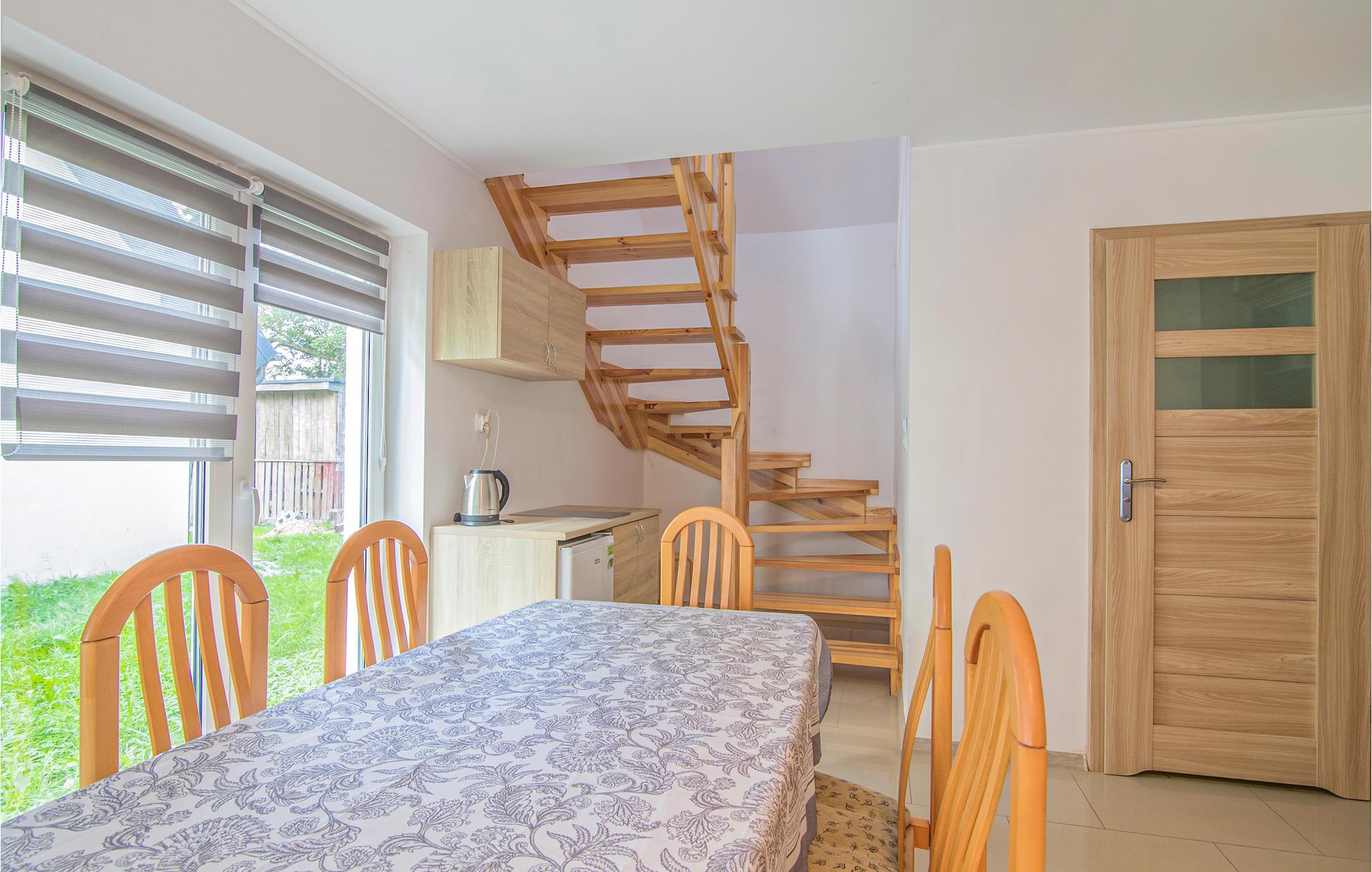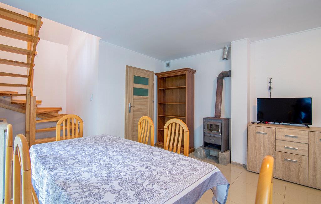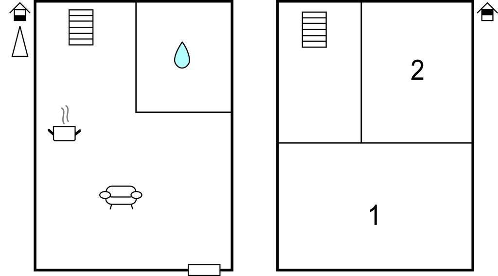 Das Ferienhaus befindet sich innerhalb einer Anlage mit 6 Ferienhäusern. Im Erdgeschoss befindet sich ein Wohnzimmer mit TV, eine Küchenzeile und ein Badezimmer mit Duschkabine. Ein Ofen sorgt für eine gemütliche Atmosphäre. Auf der 1. Etage befinden sich 2 separate Schlafzimmer und die Treppe ist mit einem Geländer gesichert.