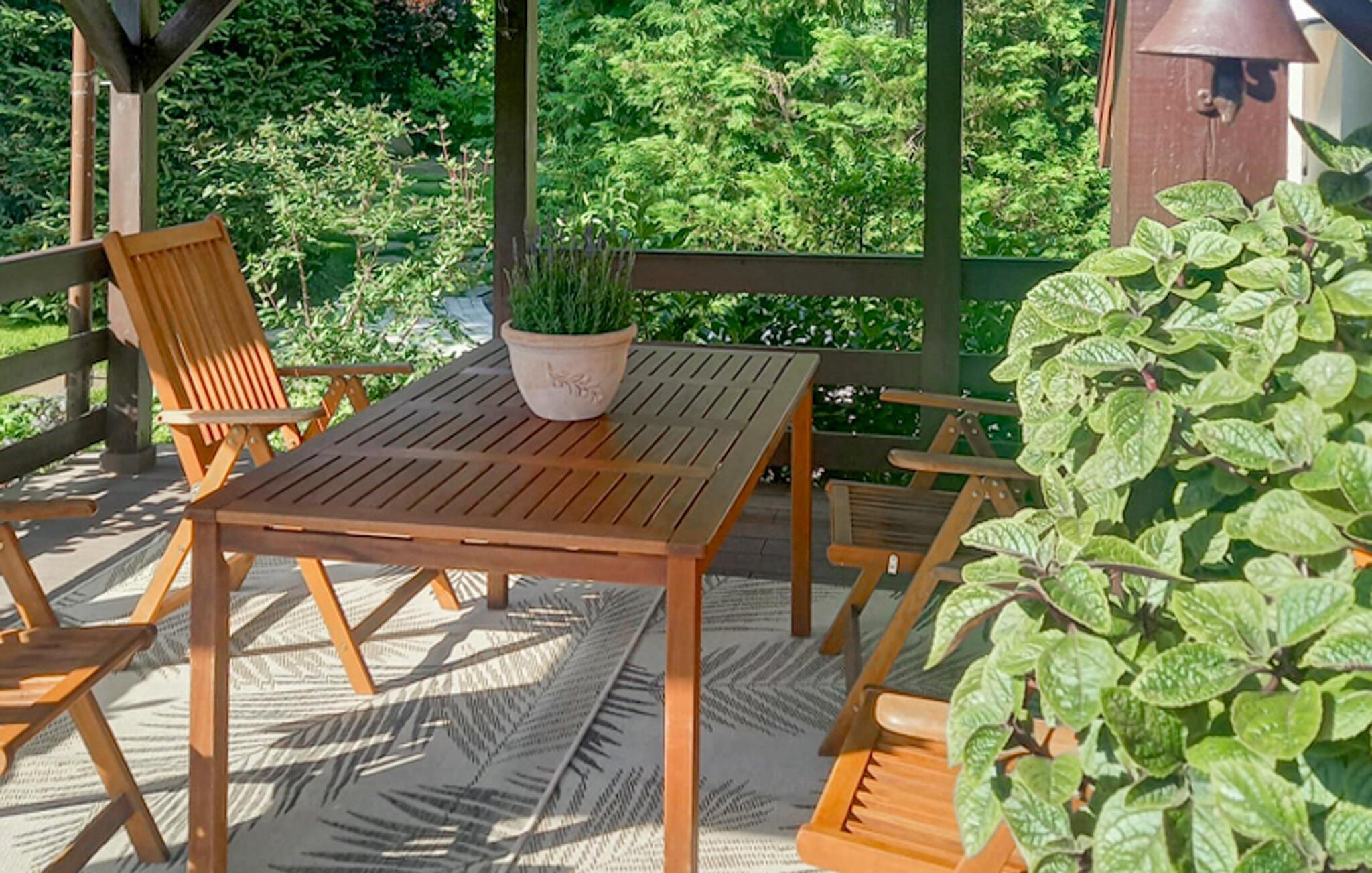 Die großzügige, überdachte Terrasse lädt Sie dazu ein, den Tag entspannt im Freien zu verbringen, mit einem traumhaften Blick auf den liebevoll angelegten Garten. Ob beim Frühstück in der Morgensonne oder beim gemütlichen Abendessen im Freien – hier können Sie die Ruhe der Natur in vollen Zügen genießen und einfach abschalten.