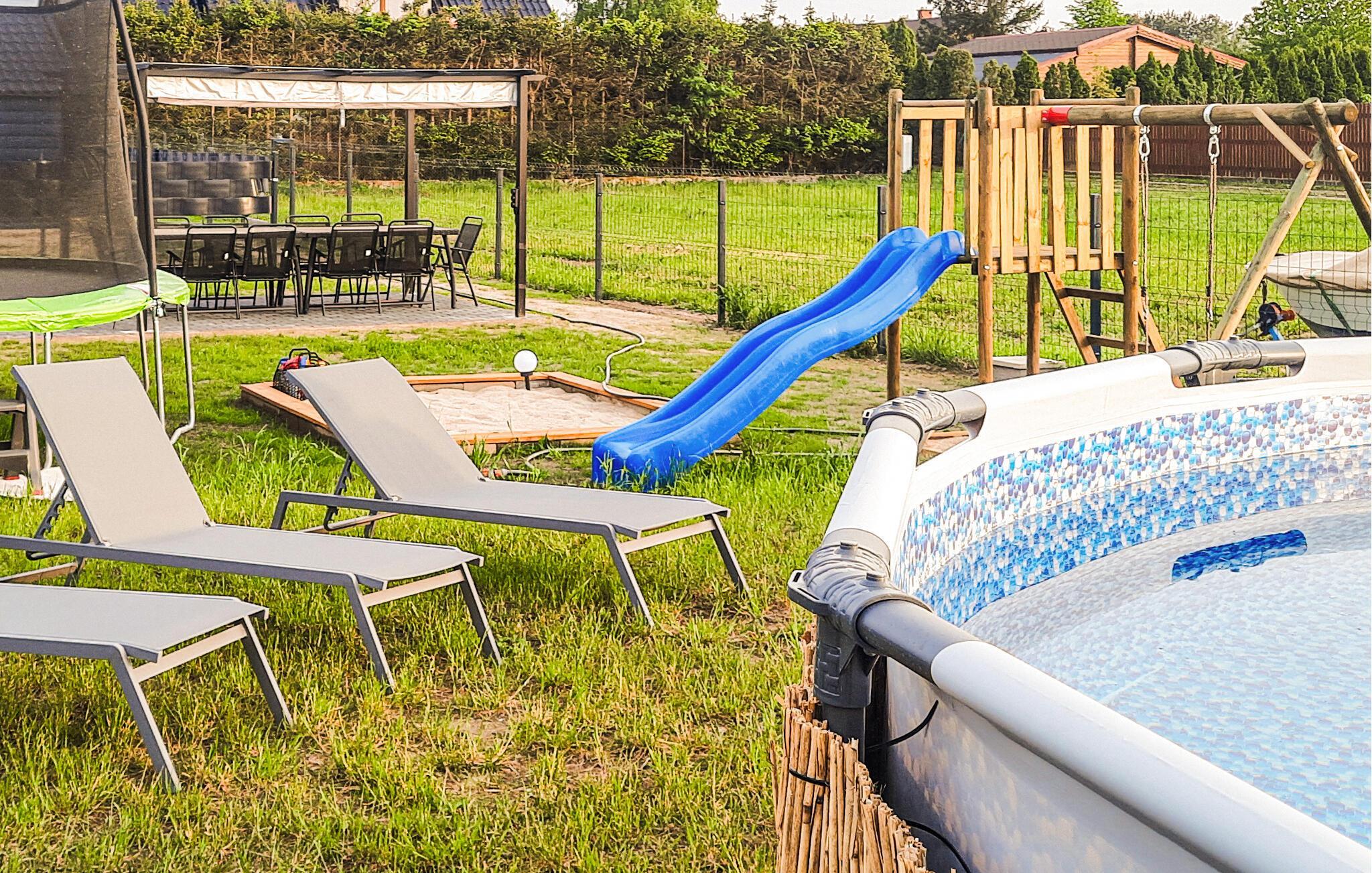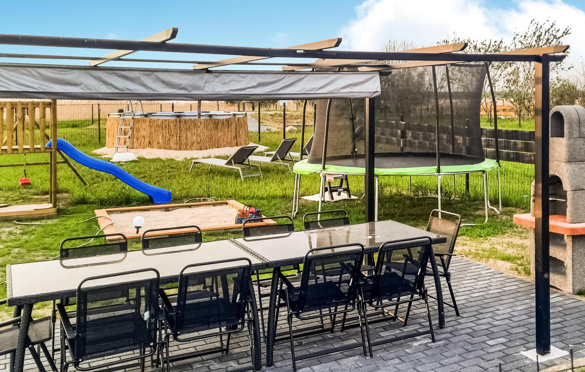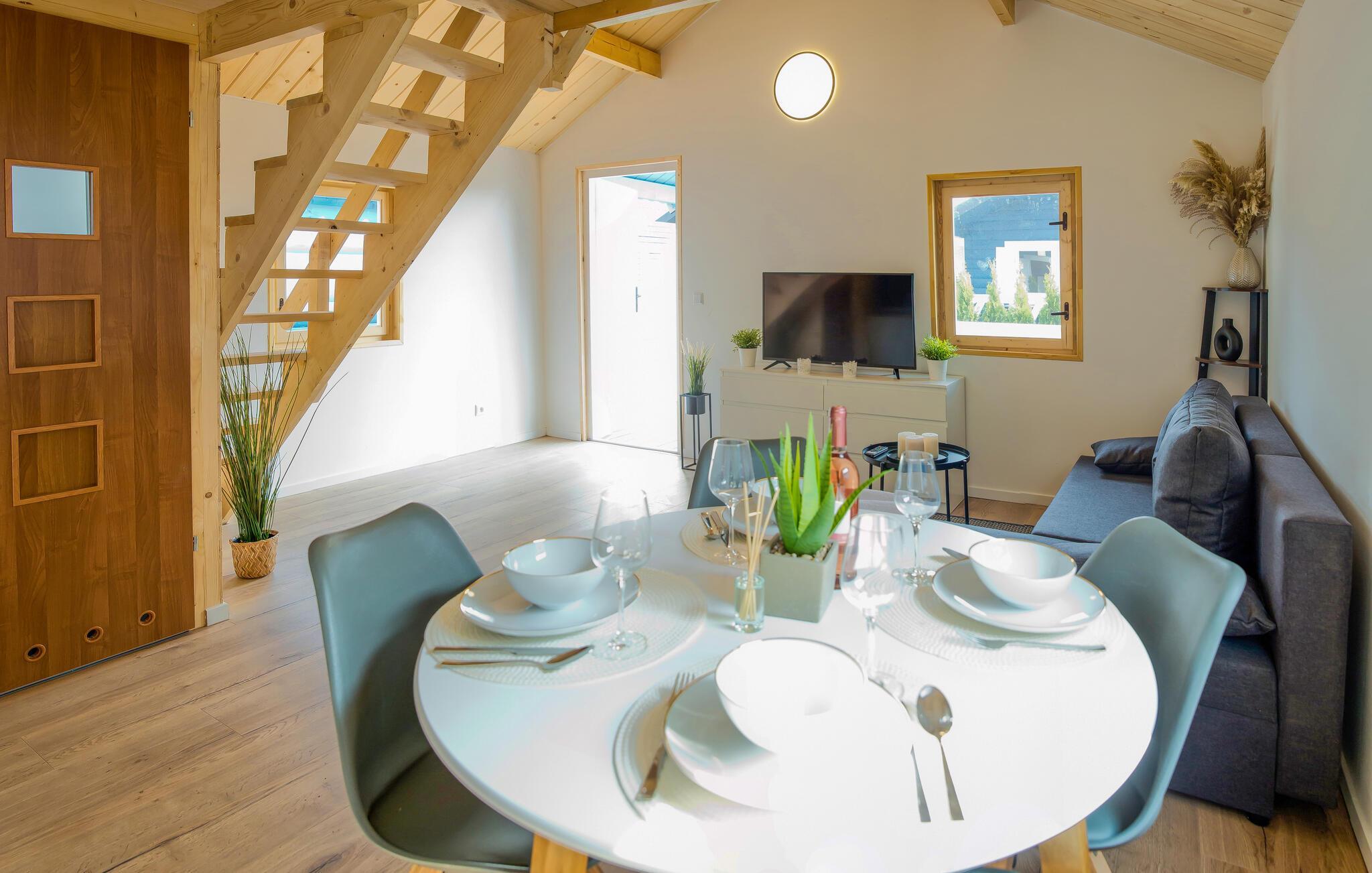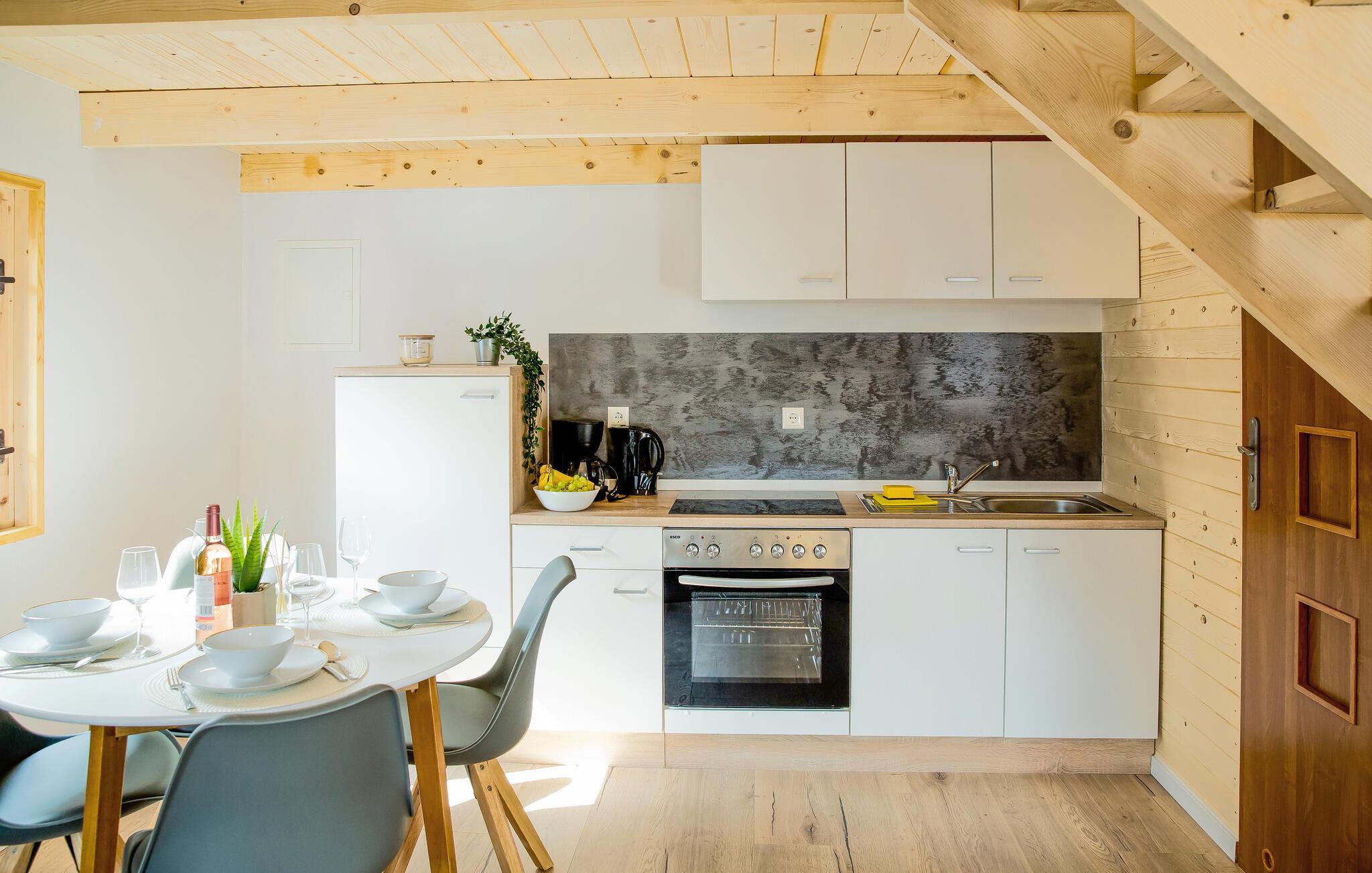 Gönnen Sie sich mit Ihren Lieben eine Auszeit von Ihrem Alltag. Fühlen Sie sich hier rundum wohl, entspannen sich im stilvoll eingerichteten Wohnraum, wo das Kochen, Essen und Entspannen Hand in Hand gehen. Nachtruhe finden Sie auf dem Schlafboden, während Sie am Morgen Ihre private Terrasse für ein Frühstück nach draußen lockt. Hier können Sie auch grillen oder den gemauerten Grill im Gemeinschaftsgarten nutzen, wo Ihre Kinder auf dem Trampolin und die anderen Spielgeräte spielen und Freundschaften schließen können. Erfrischen Sie sich auch im aufgestellten Pool und planen Ihre nächsten Ausflüge.