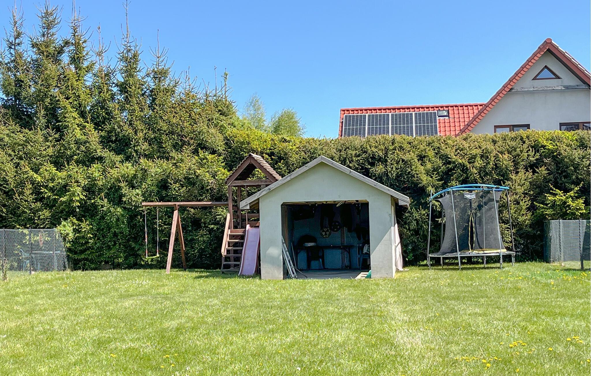 Nehmen Sie auf der Terrasse Platz und starten Sie den Morgen mit einem Frühstück im Freien. Beobachten Sie Ihre Kinder beim Spielen im eingezäunten Garten oder schließen Sie sich bei einer Partie Fußball auf dem Rasen an. Ein Trampolin, eine Schaukel und ein Spielhäuschen sorgen für Abwechslung und Bewegung. Hier haben Groß und Klein viel Platz zum Austoben.