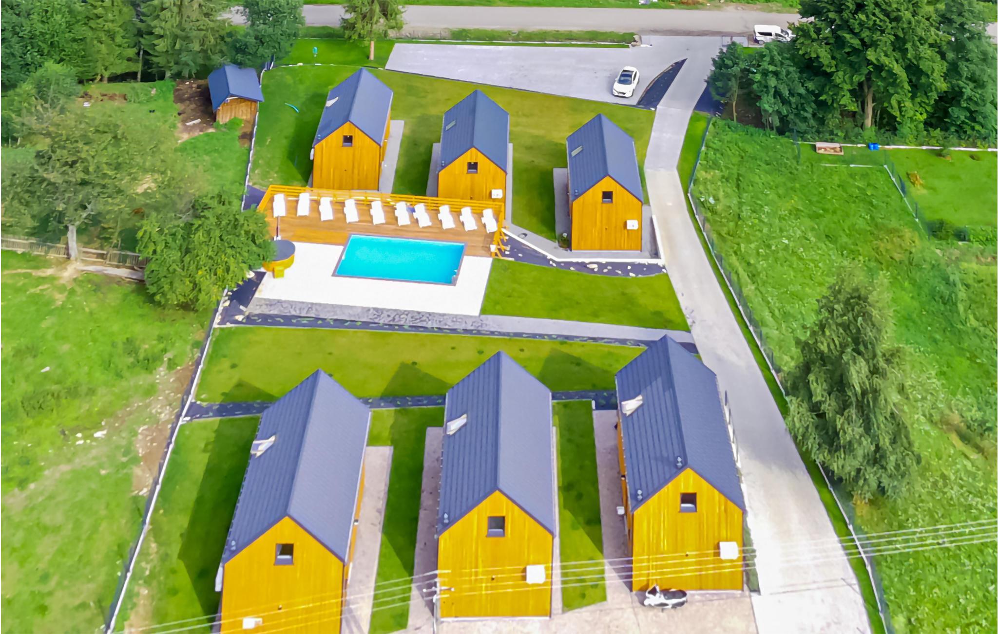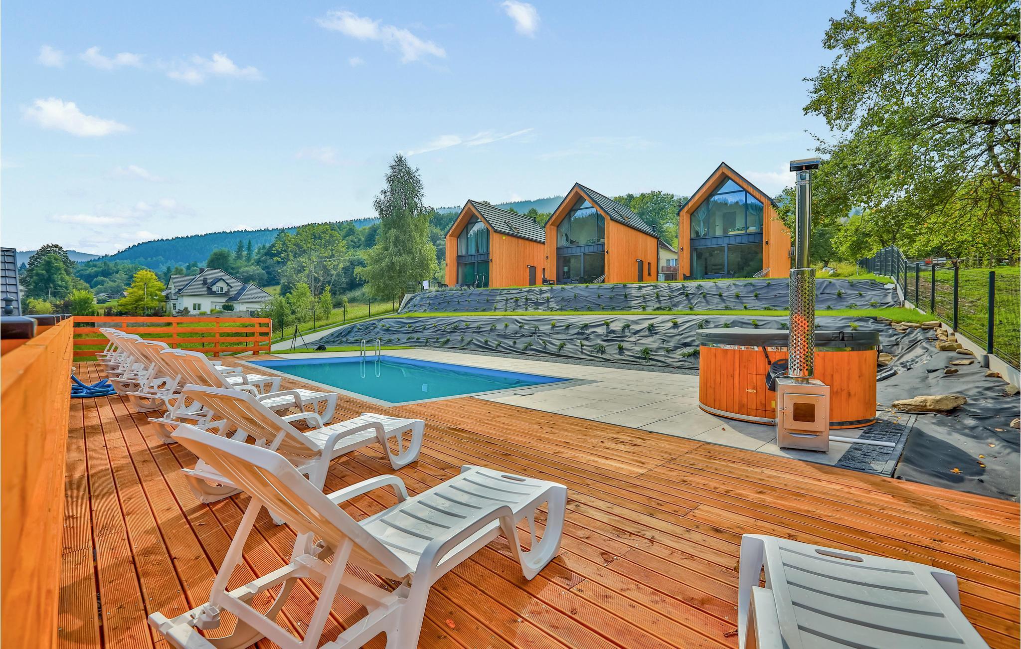 Auch im Freien wurde an die ganze Familie gedacht. Gemeinsam mit den weiteren Häusern können Sie den Pool und das Finnische Holzbad nutzen und die saubere Luft der Bergwelt einatmen. Ihre Kinder finden einen einladenden Spielplatz.