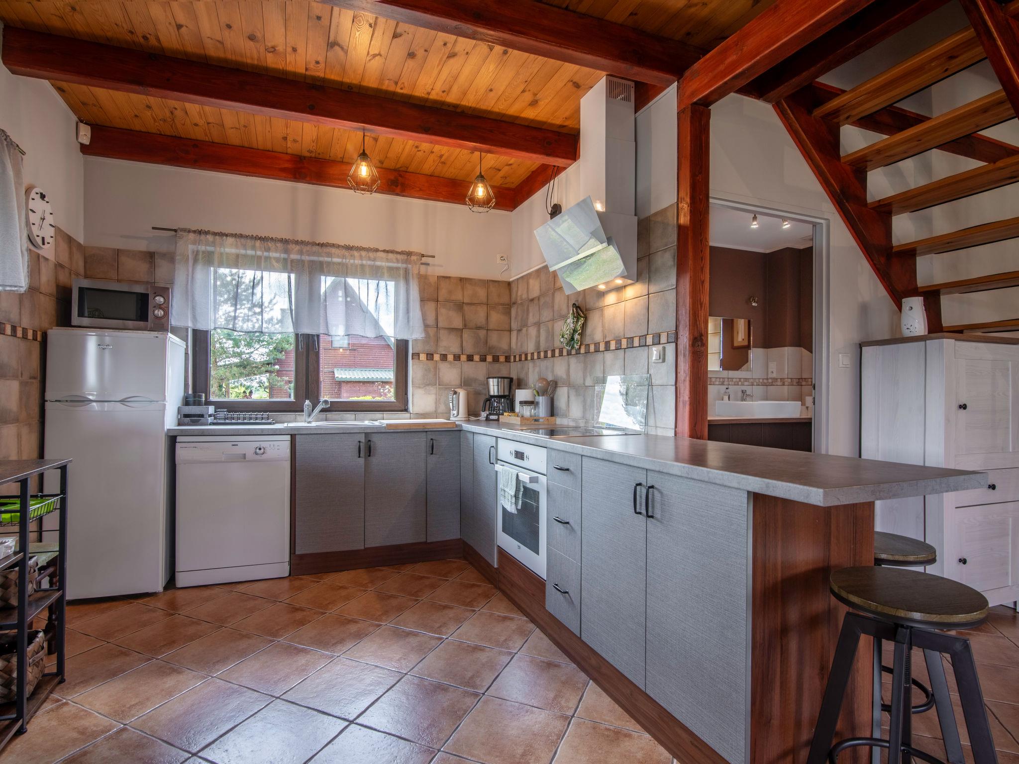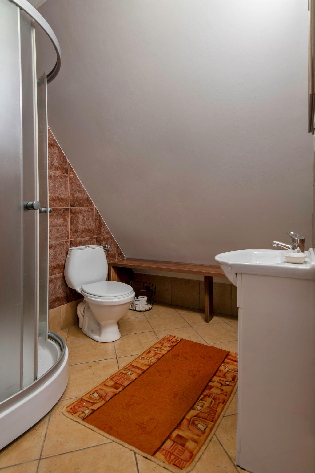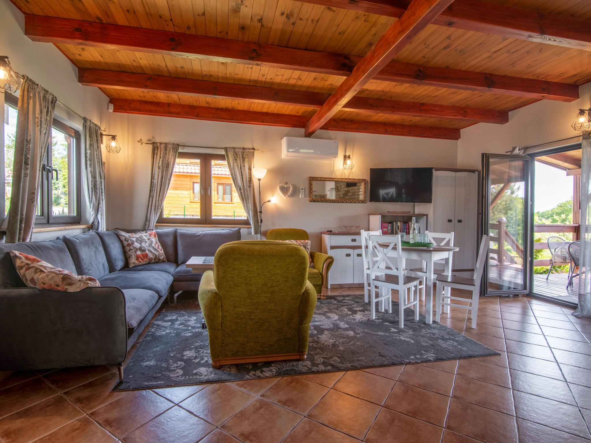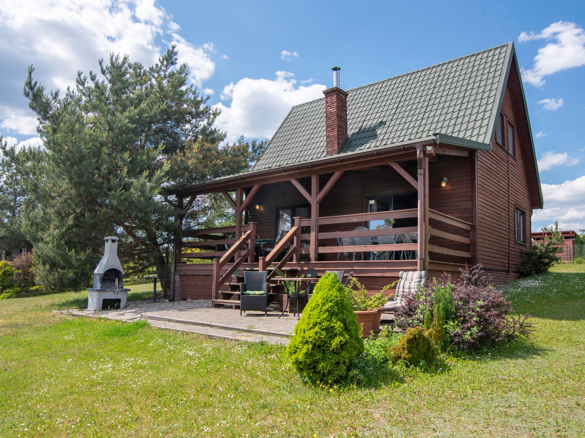 "Dom zielony", 4-Zimmer-Haus 96 m2 auf 2 Stockwerken. Teilweise abgeschrägt, einfach und schön eingerichtet: offenes grosses Wohnzimmer mit 1 Diwanbett, offenem Kamin, Sat-TV und Radio. Ausgang zur Veranda. Grosse, offene Küche (4 Kochplatten, Geschirrspüler, Mikrowelle). Dusche/WC. Obergeschoss: 2 abgeschrägte Zimmer, jedes Zimmer mit 1 Doppelbett. 1 abgeschrägtes Zimmer mit 2 Betten. Dusche/WC. E-Heizung, Holzheizung. Terrasse. Terrassenmöbel. Sehr schöne Panoramasicht auf den See und die Landschaft. Zur Verfügung: Holz (gratis). Internet (Wireless LAN, gratis). Maximal 1 Haustier/Hund erlaubt. Boot steht den Gästen kostenlos zur Verfügung.