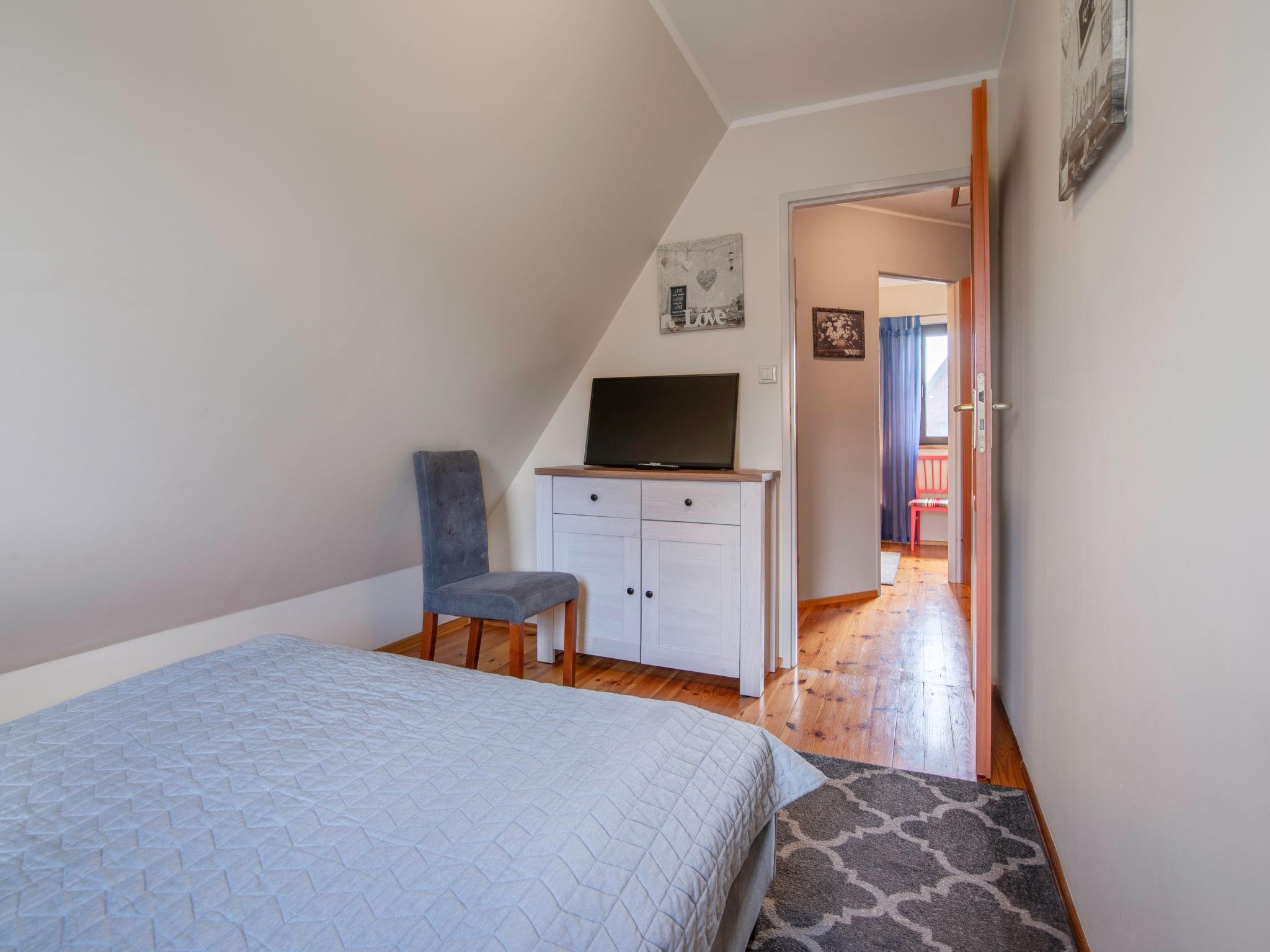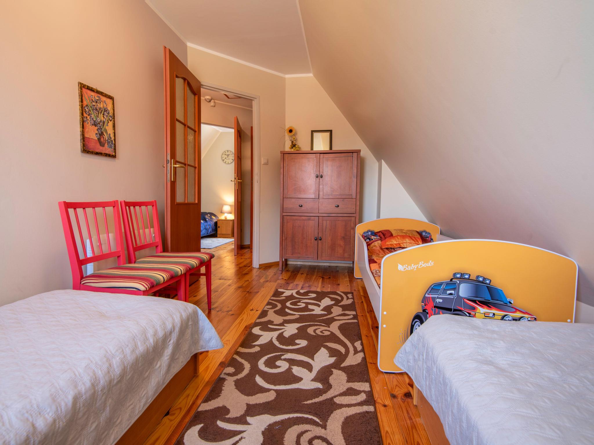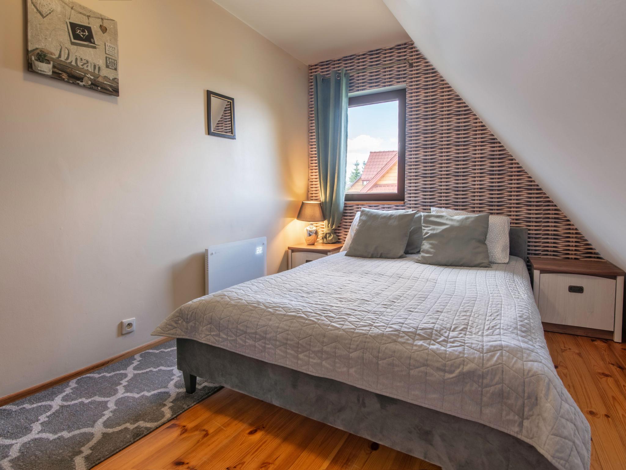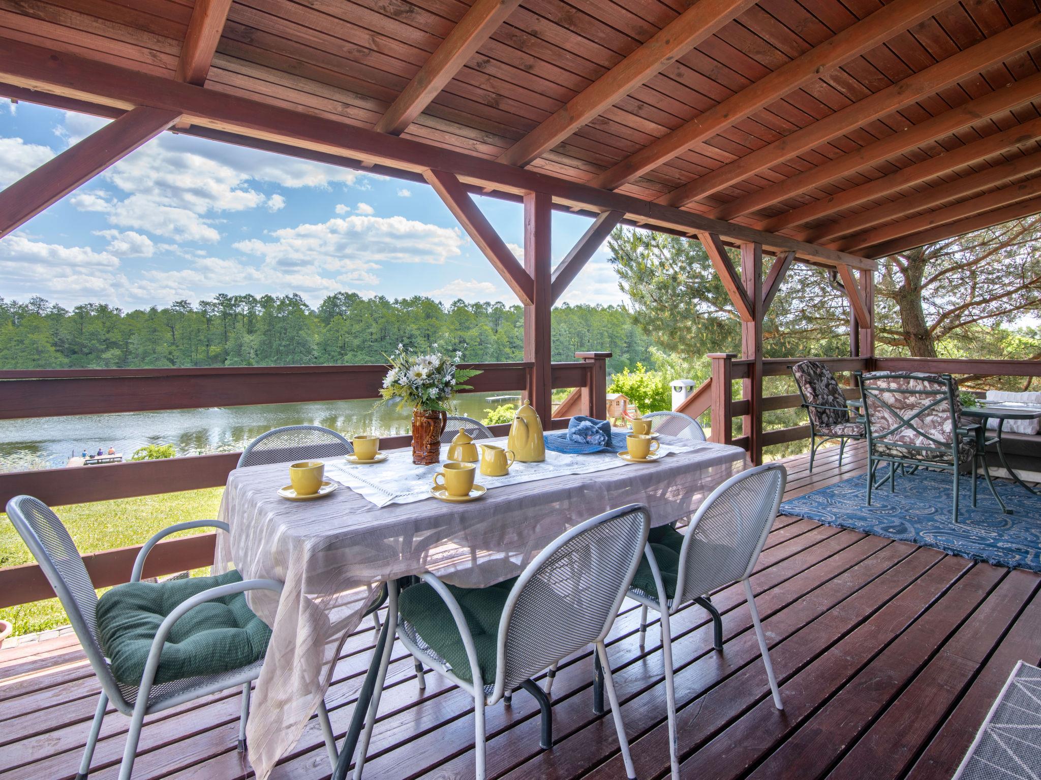"Dom zielony", 4-Zimmer-Haus 96 m2 auf 2 Stockwerken. Teilweise abgeschrägt, einfach und schön eingerichtet: offenes grosses Wohnzimmer mit 1 Diwanbett, offenem Kamin, Sat-TV und Radio. Ausgang zur Veranda. Grosse, offene Küche (4 Kochplatten, Geschirrspüler, Mikrowelle). Dusche/WC. Obergeschoss: 2 abgeschrägte Zimmer, jedes Zimmer mit 1 Doppelbett. 1 abgeschrägtes Zimmer mit 2 Betten. Dusche/WC. E-Heizung, Holzheizung. Terrasse. Terrassenmöbel. Sehr schöne Panoramasicht auf den See und die Landschaft. Zur Verfügung: Holz (gratis). Internet (Wireless LAN, gratis). Maximal 1 Haustier/Hund erlaubt. Boot steht den Gästen kostenlos zur Verfügung.