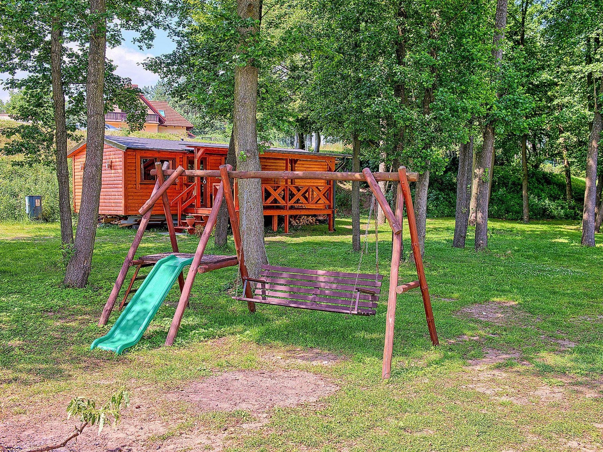 Die überdachte Terrasse ist mit Gartenmöbeln ausgestattet. Direkt neben der Hütte befindet sich ein Kinderspielplatz mit Schaukel, Sandkasten und Feuerstelle. Die Hütte ist mit einem Kohlegrill ausgestattet. Die Hütte grenzt an den Wald und ist 10 Meter vom See entfernt.