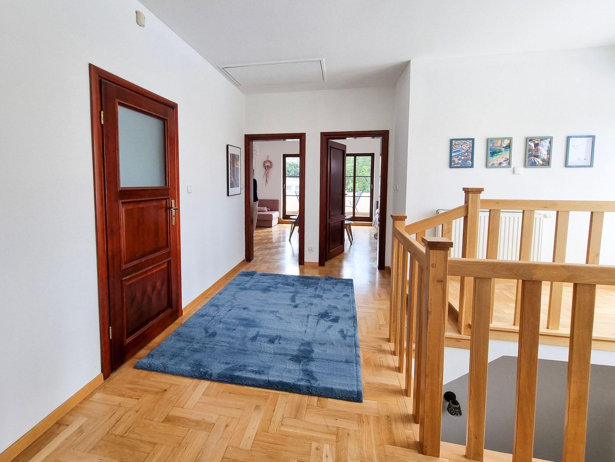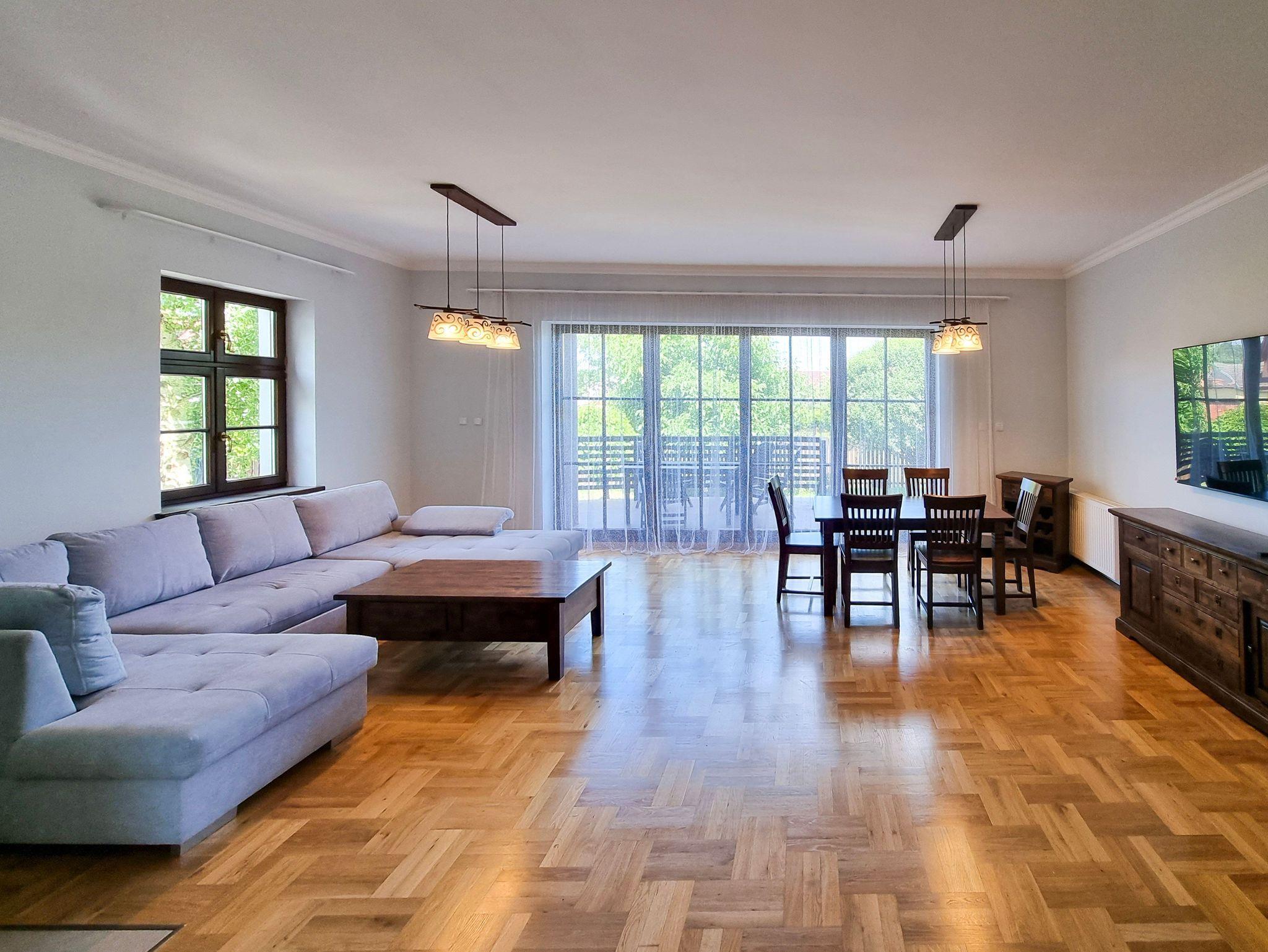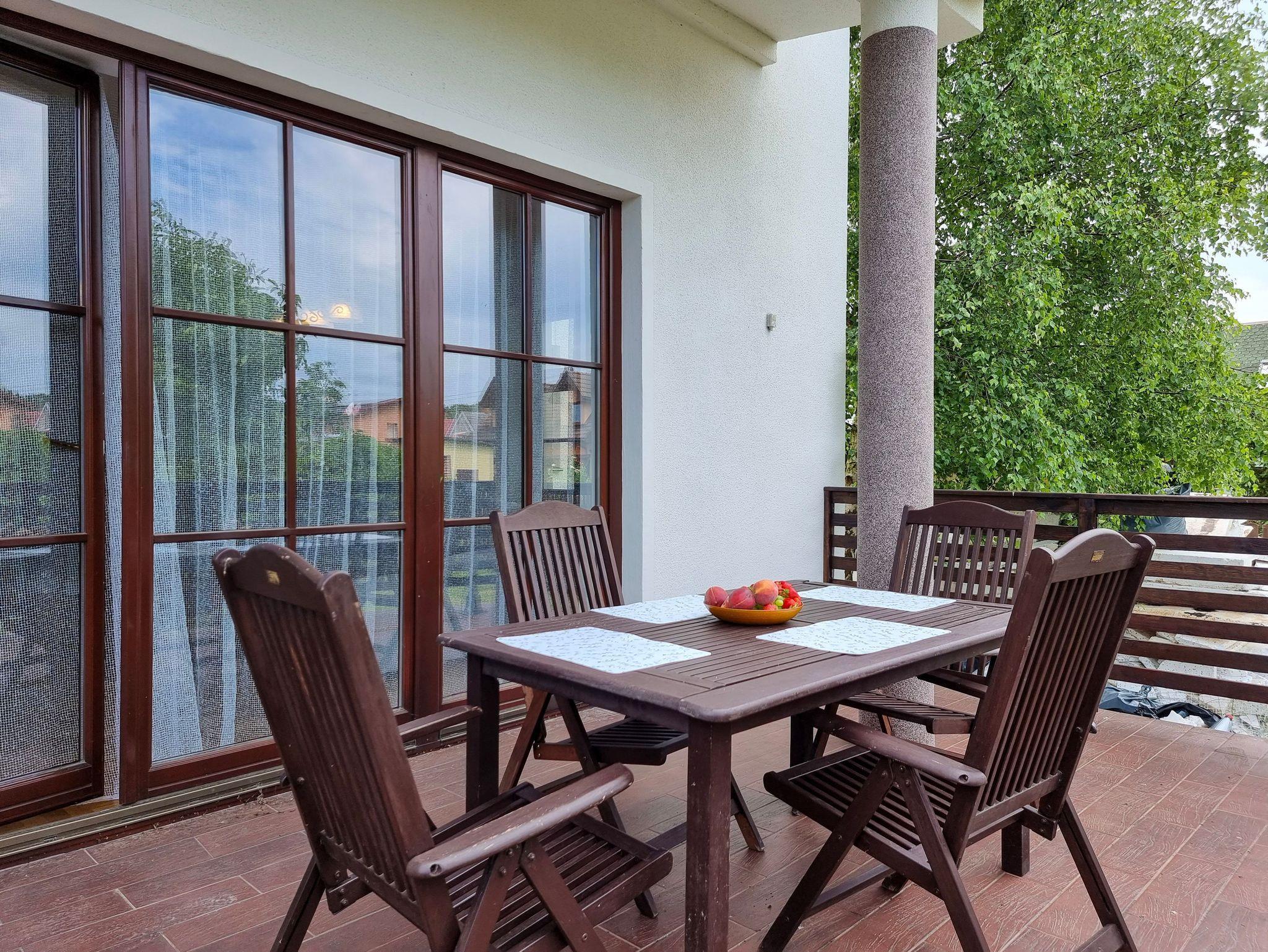 Großzügiges Wohnzimmer mit Zugang zur Terrasse. Für die Gäste: große Schlafcouch, zusätzliche 2-Sitzer-Couch, Tisch mit 6 Stühlen, Fernseher, Kommode. Auf der Terrasse befinden sich Gartenmöbel und eine Treppe zum Garten. Grillmöglichkeit vorhanden.