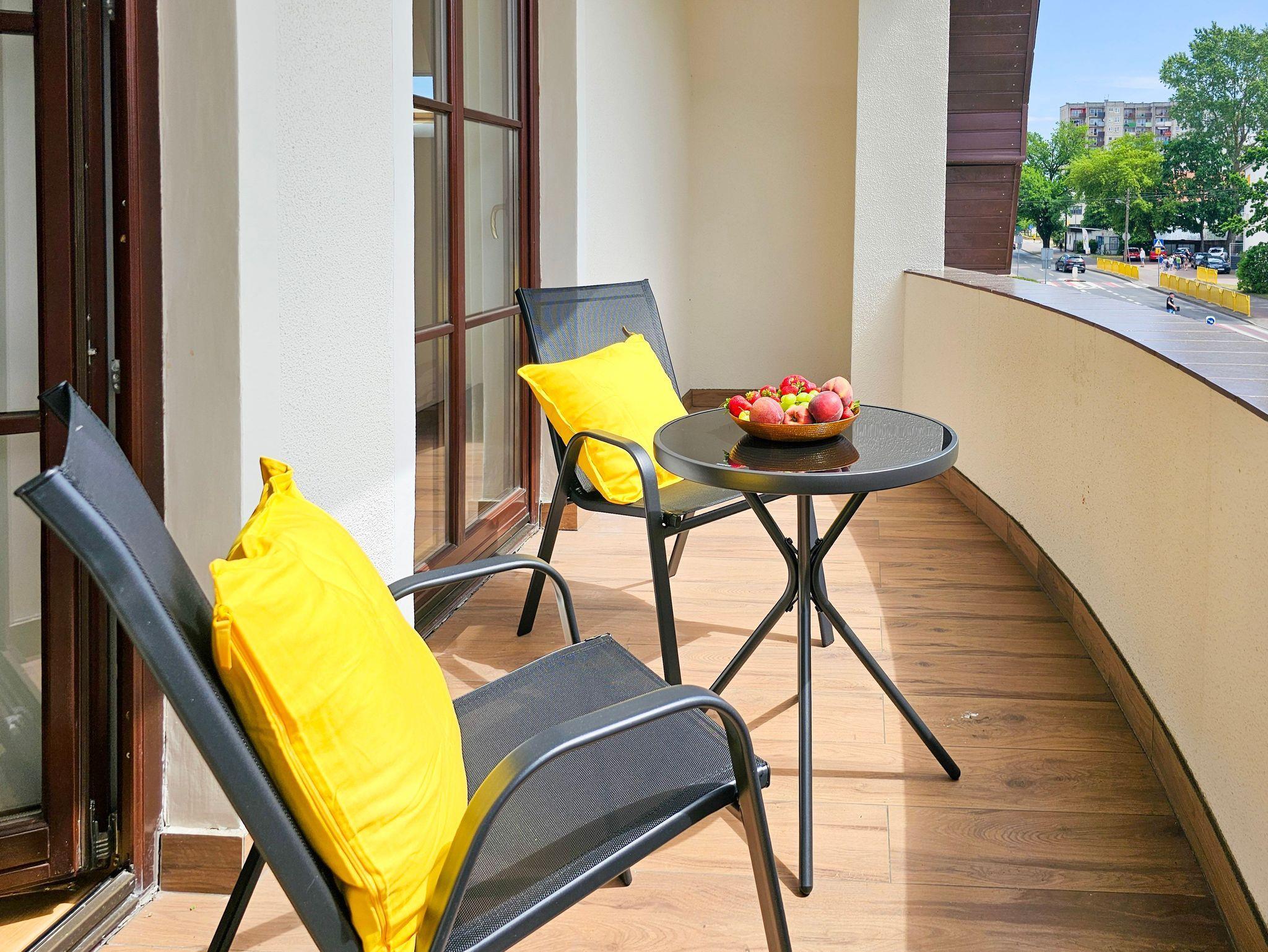 Schlafzimmer 2: Doppelbett (160x200 cm), Einzelschlafsofa, Kleiderschrank, Tisch mit 2 Stühlen, Zugang zum Balkon.