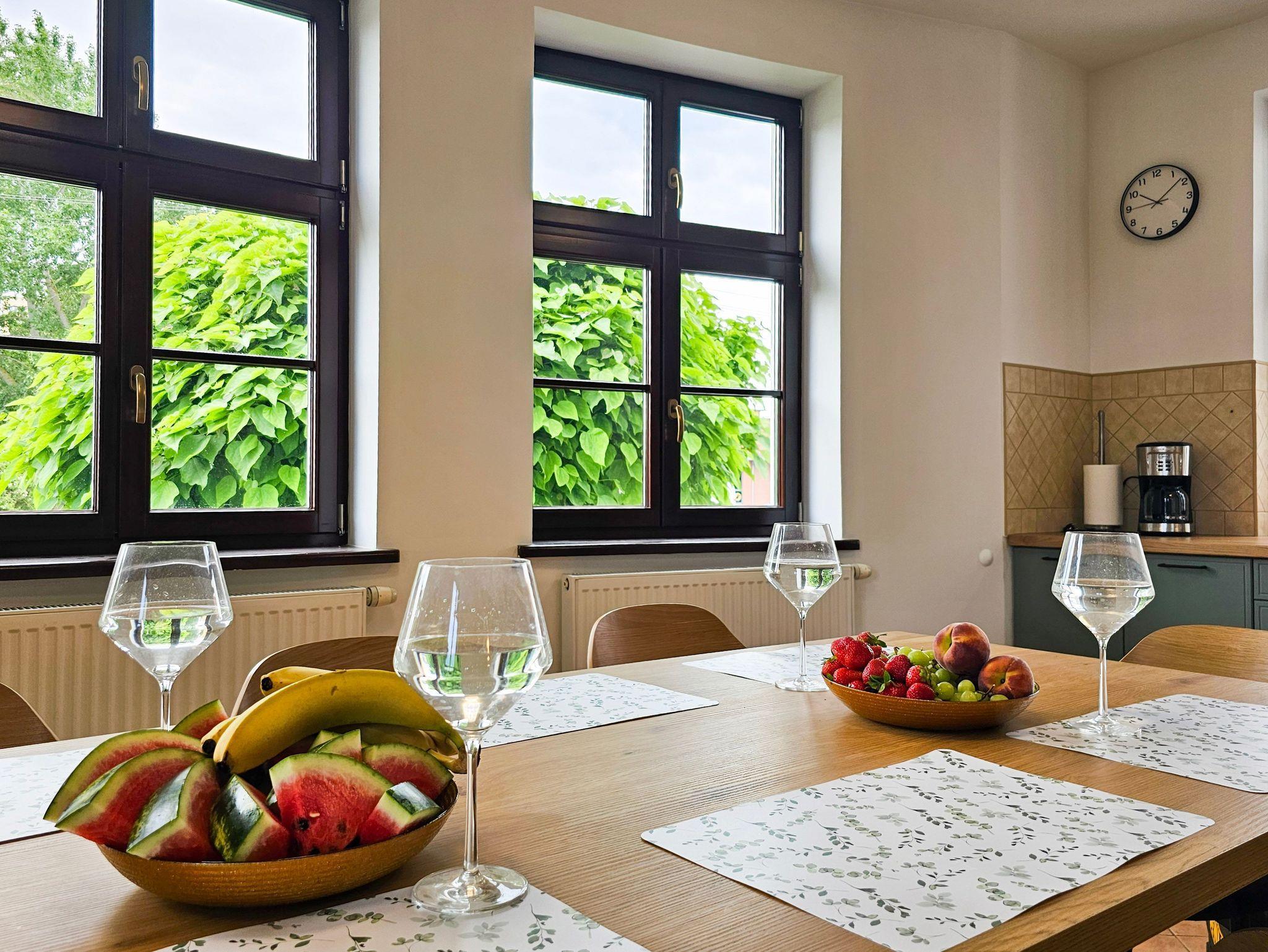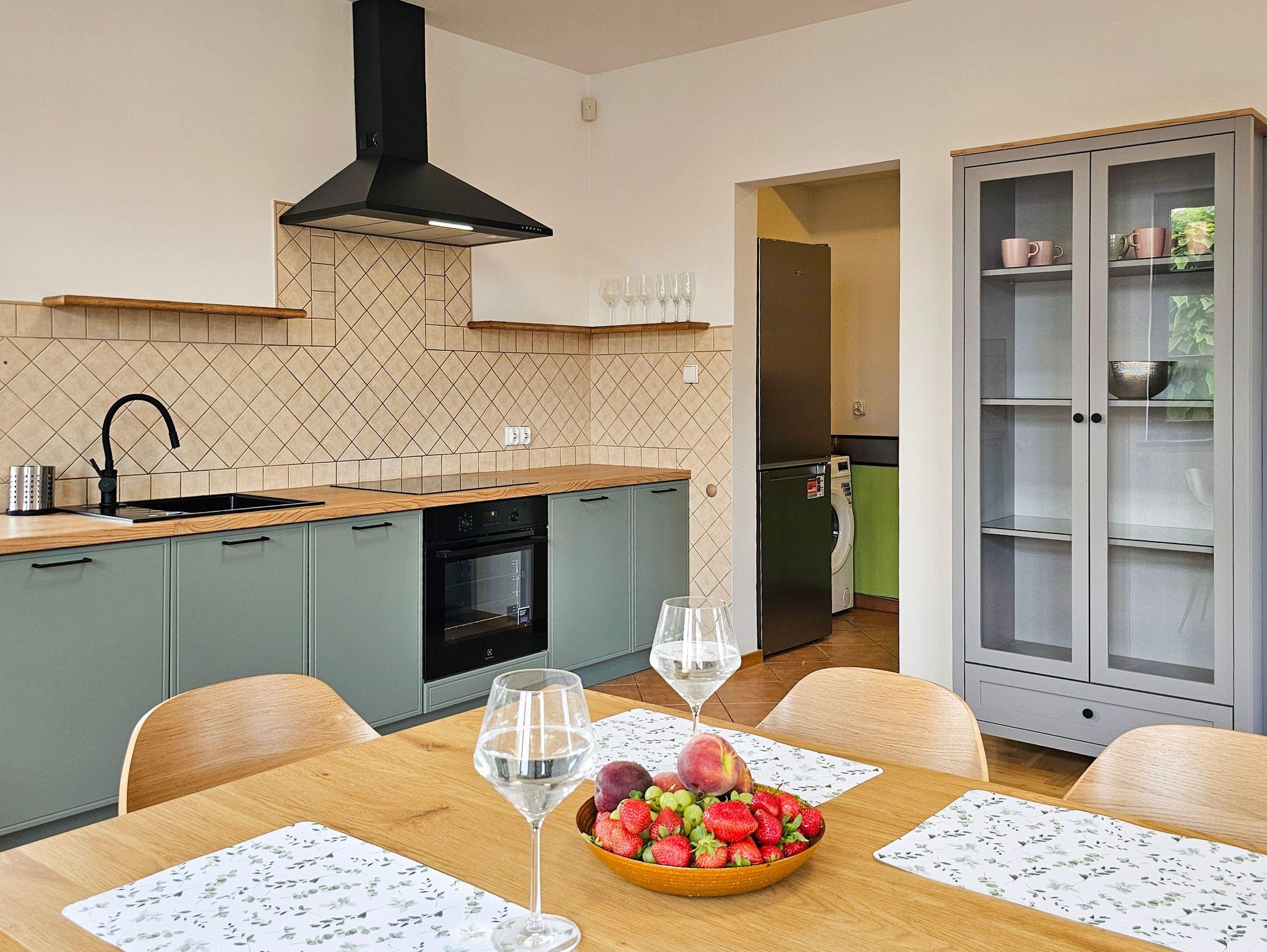 Großem Essbereich mit Küchenzeile ? ein heller Raum mit nach Süden ausgerichteten Fenstern. Den Gästen stehen zur Verfügung: ein ausziehbares, bequemes Doppelschlafsofa, ein Esstisch mit 8 Stühlen, eine voll ausgestattete Küchenzeile mit Dunstabzugshaube, Geschirrspüler, Backofen, Induktionskochfeld mit 4 Platten, Einzelspülbecken, Geschirr, Töpfe, Besteck sowie eine Speisekammer mit großem Kühlschrank mit Gefrierfach und Waschmaschine.