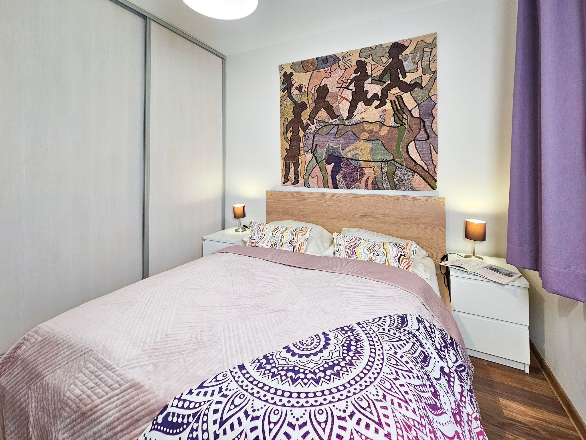 Im Schlafzimmer steht ein Doppelbett, ein großer Kleiderschrank und eine Frisierkommode.