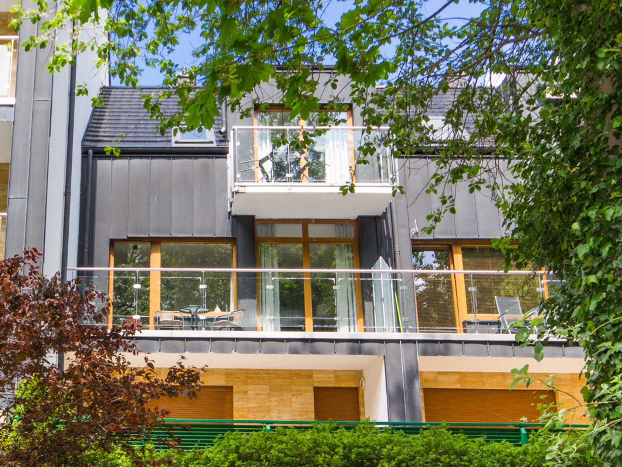 Die Fenster des Wohnzimmers und der Balkon sind nach Süden ausgerichtet, was den Gästen den Ausblick auf den in der Nähe liegenden Wald ermöglicht.