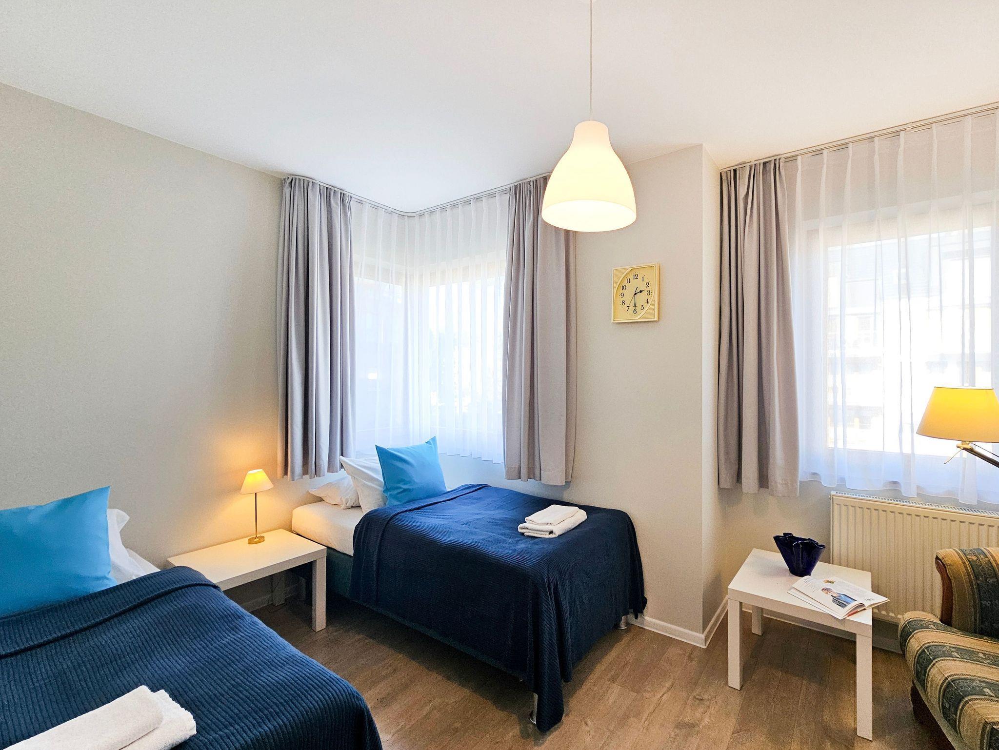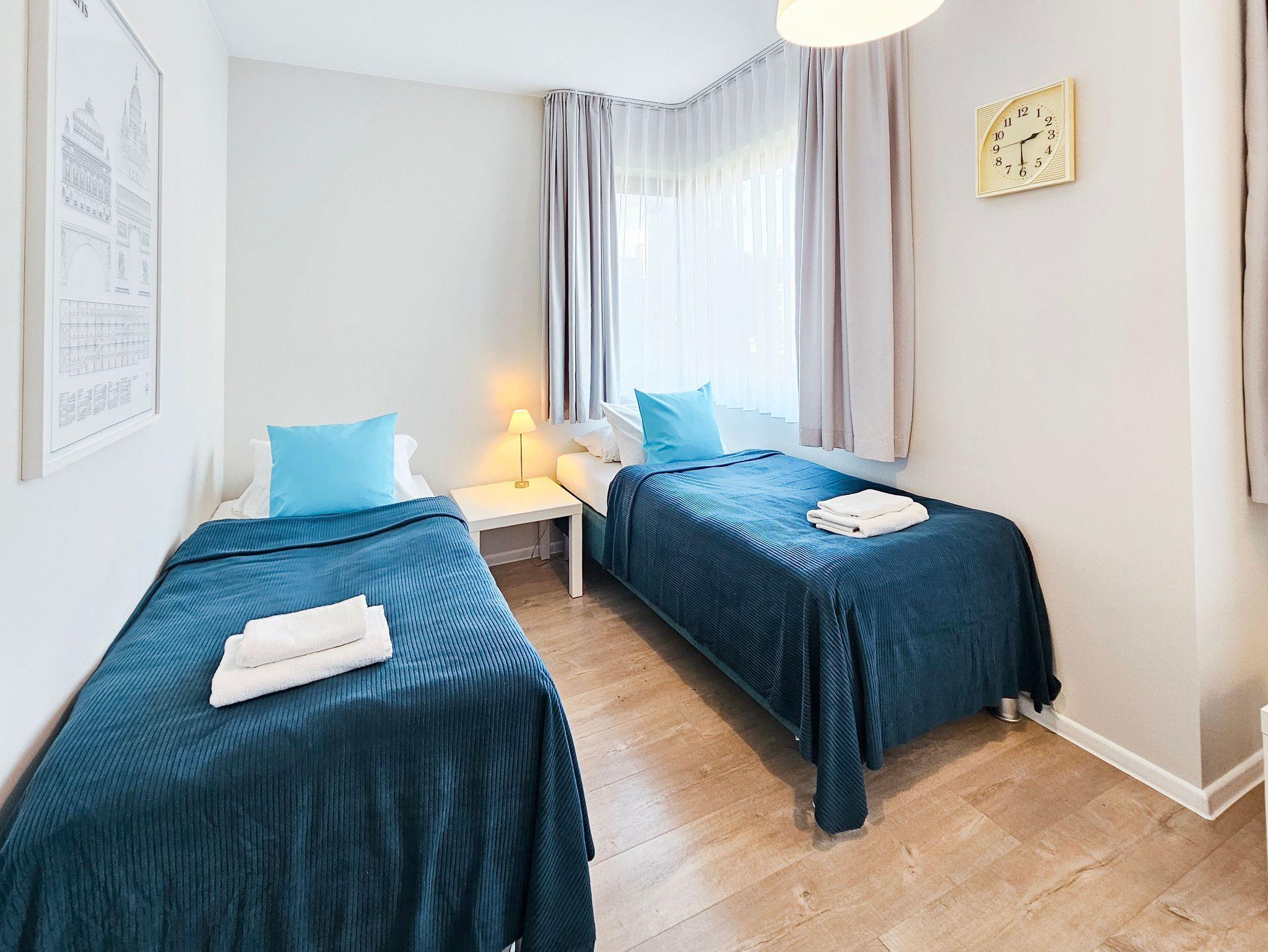 Sie besteht aus zwei Schlafzimmern und einem geräumigen Wohnzimmer mit Balkon. Die Fenster der beiden Schlafzimmer sind nach Norden zum Innenhof gerichtet. Eine Schlafzimmer ist mit einem Doppelbett, Kleiderschrank und einem Nachttisch mit Lampen ausgestattet und ein Frisiertisch, zweite Schlafzimmer mit zwei Einzelbetten.
