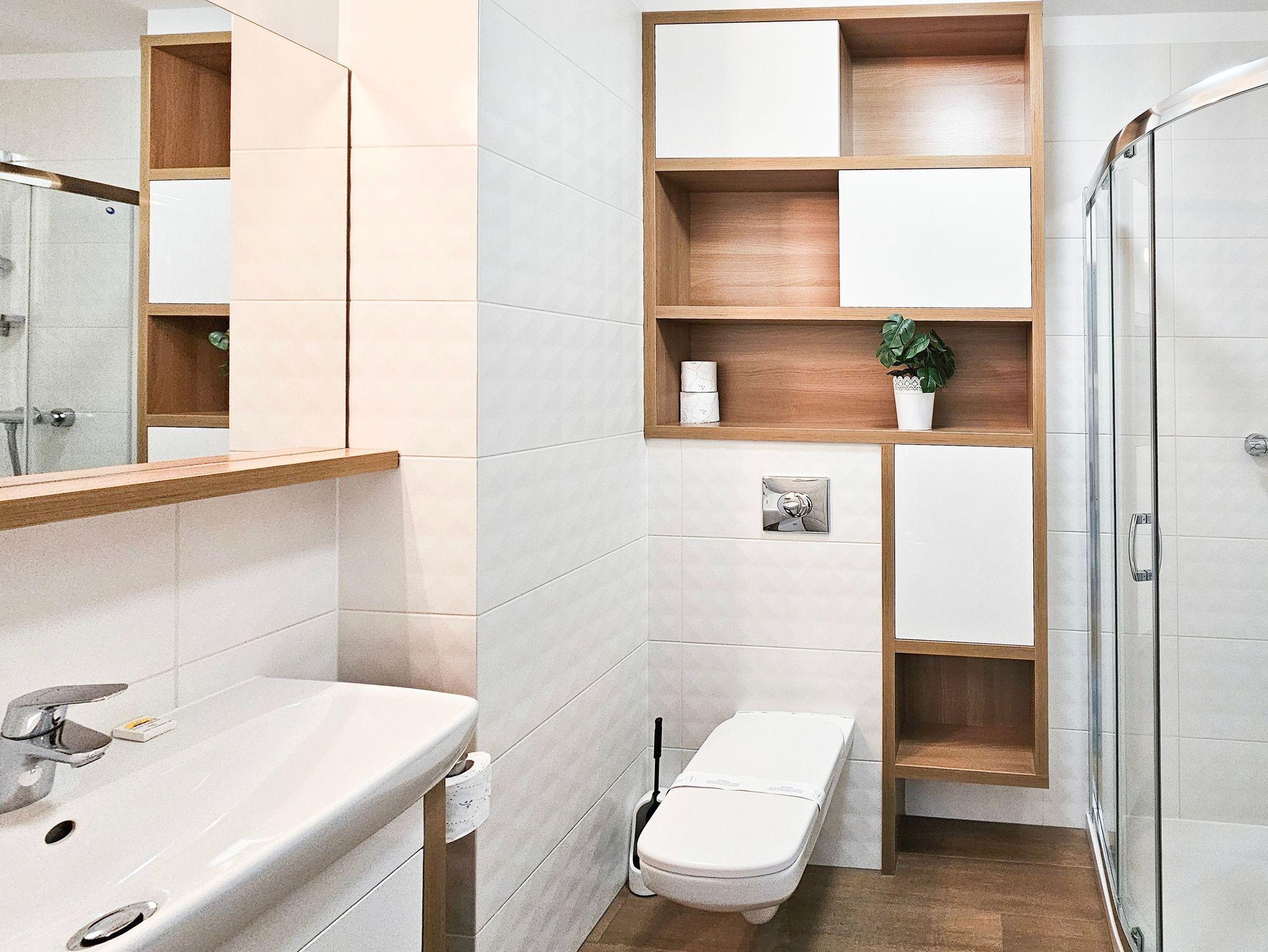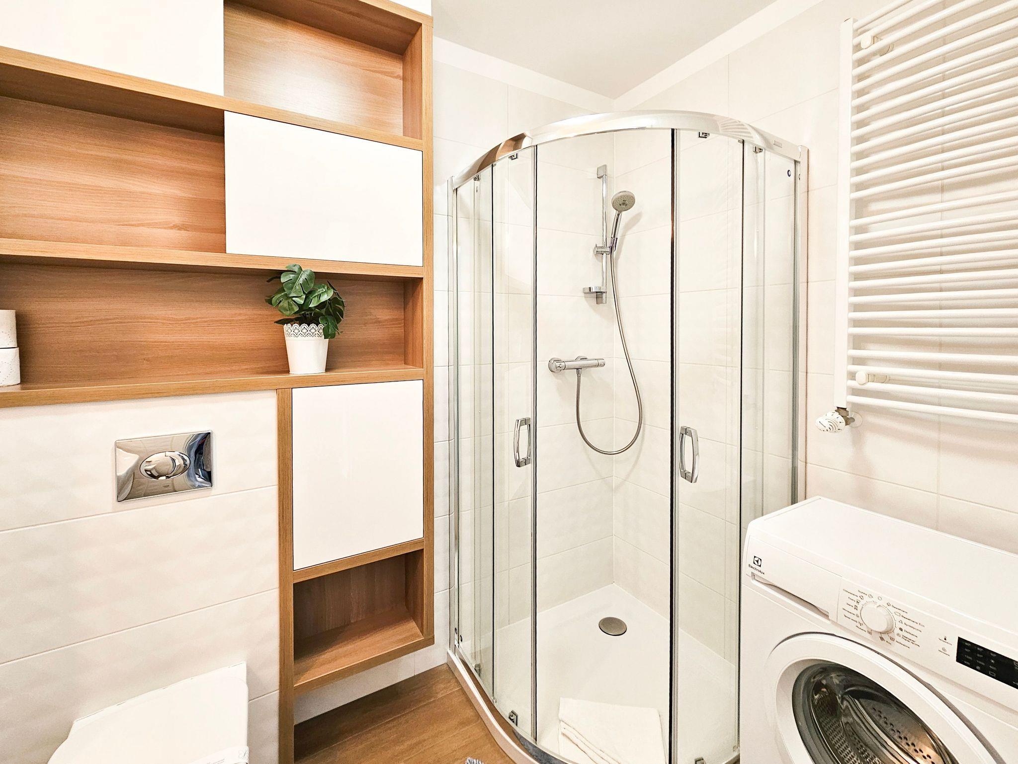 Im Badezimmer befindet sich eine Dusche, ein Waschbecken, eine Toilette und Waschmaschine.