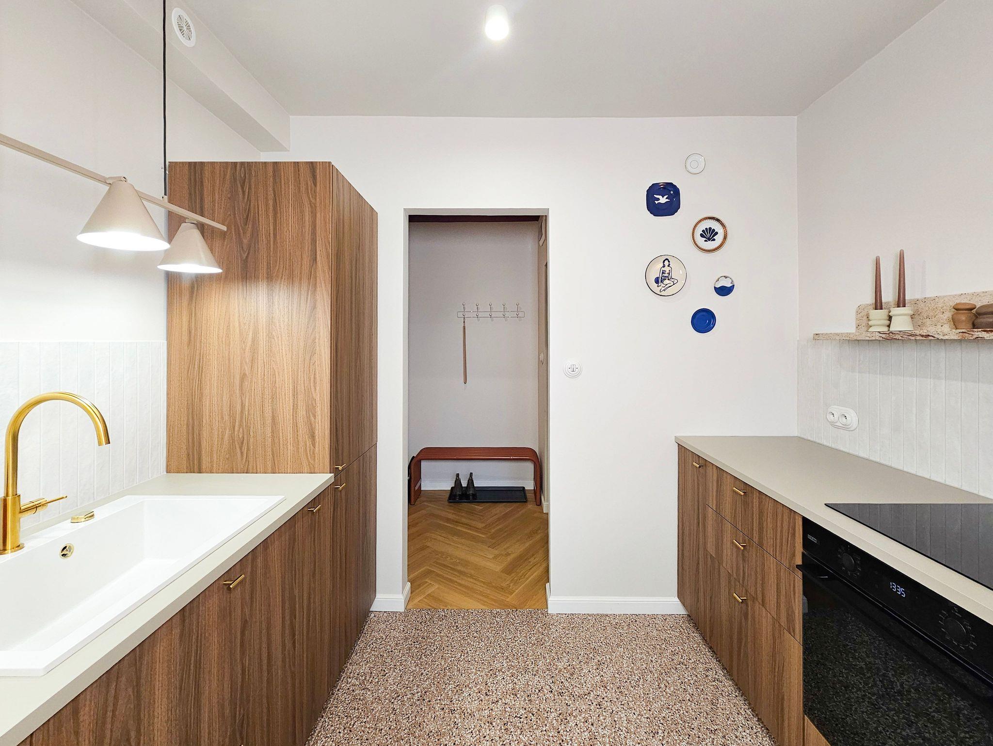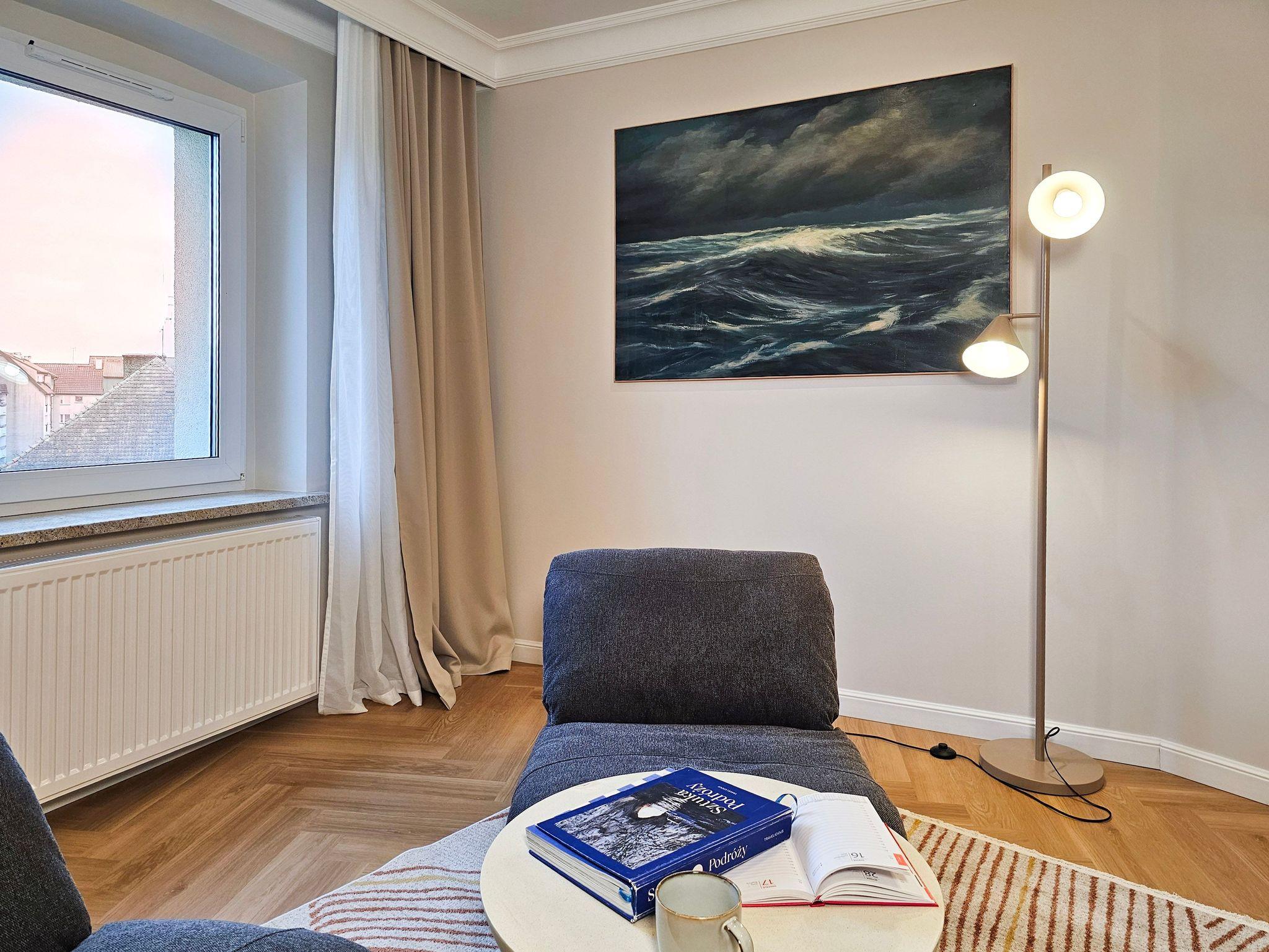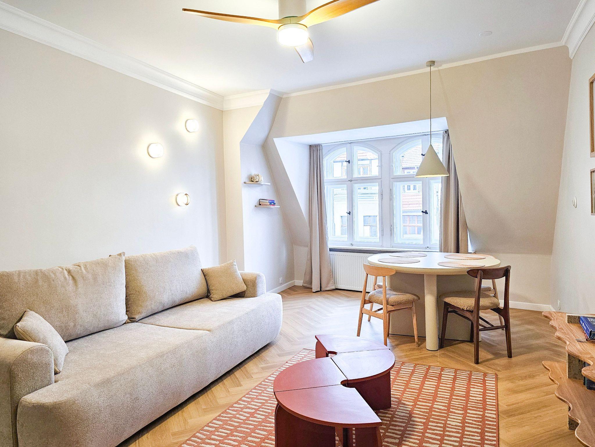 Eine geräumige und stilvolle Ferienwohnung mit einem Schlafzimmer, einem Wohnzimmer, einer Küche und einem Badezimmer, gelegen in einem historischen Mietshaus aus der Wende vom 19. zum 20. Jahrhundert. Sie befindet sich im 4. Stock und ist nur über Treppen erreichbar. Die Wohnung zeichnet sich durch einen hellen, minimalistischen, durchdachten und funktionalen Raum aus.
