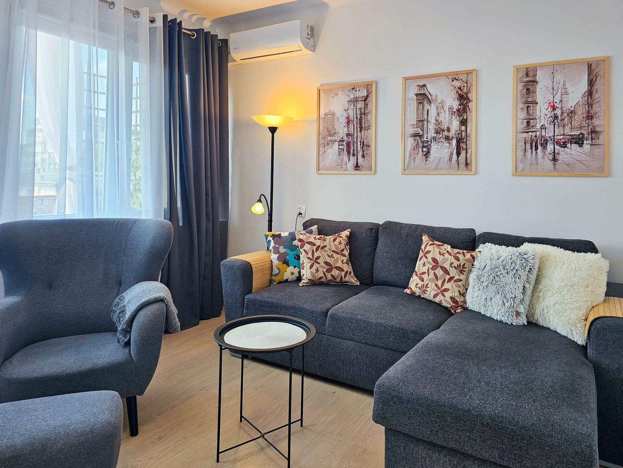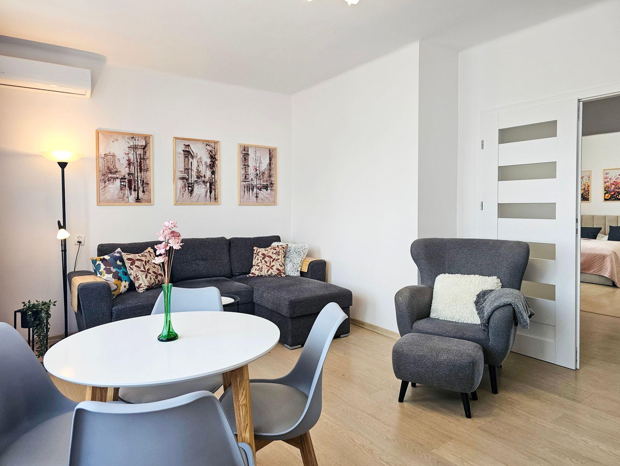 Geräumiges, sehr sonniges Wohnzimmer mit einem bequemen ausklappbaren Sofa mit Schlaffunktion (140x200cm), einer TV-Ecke, einem runden Esstisch und einem Ausgang zum Balkon.