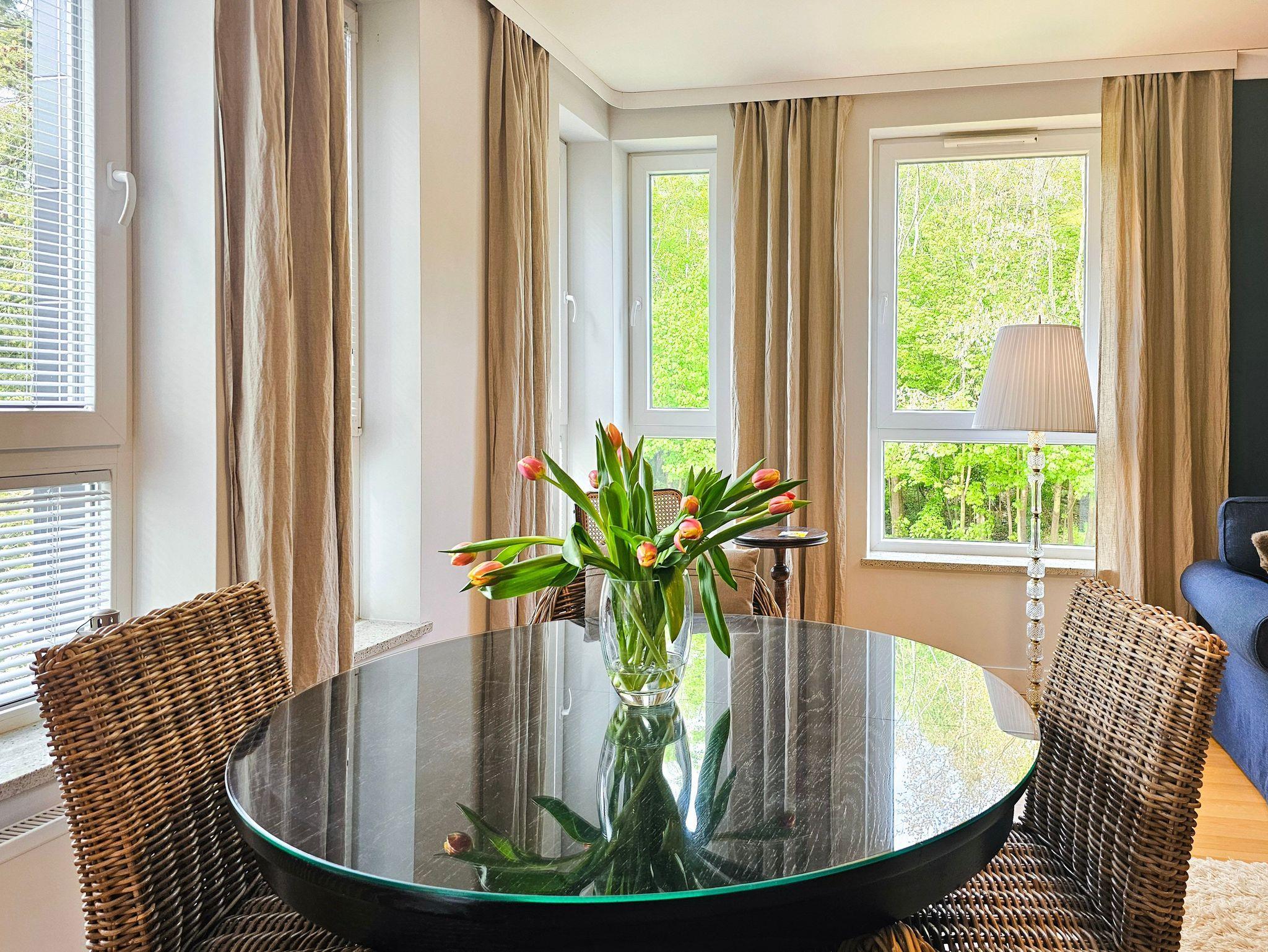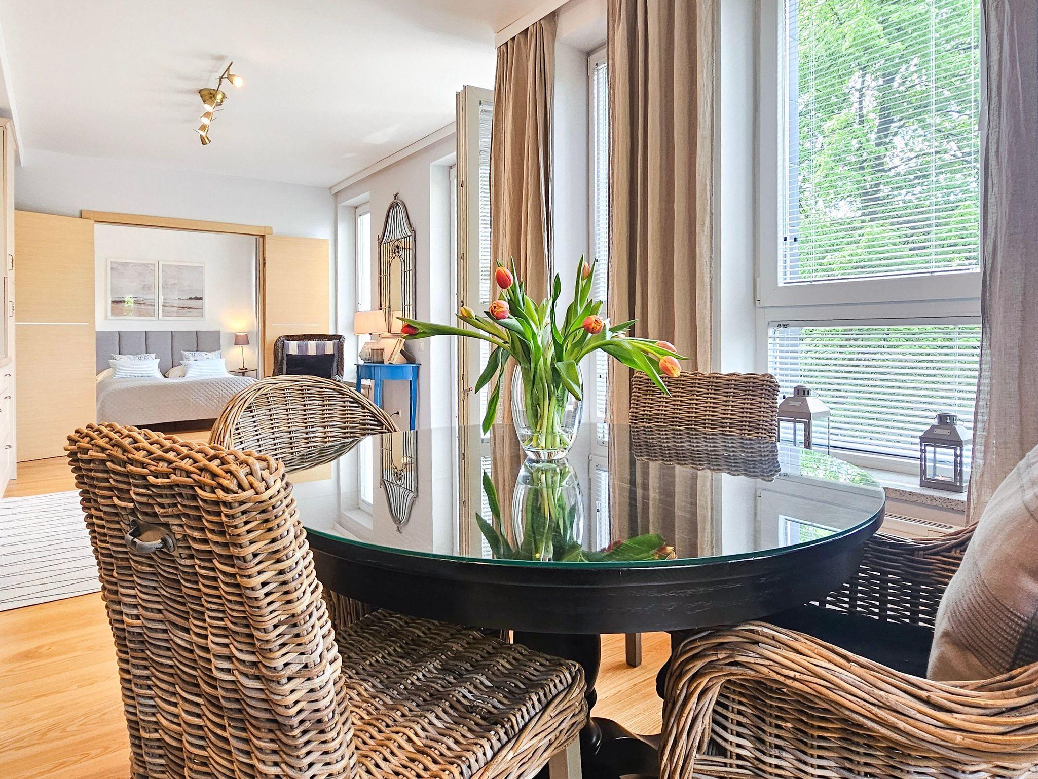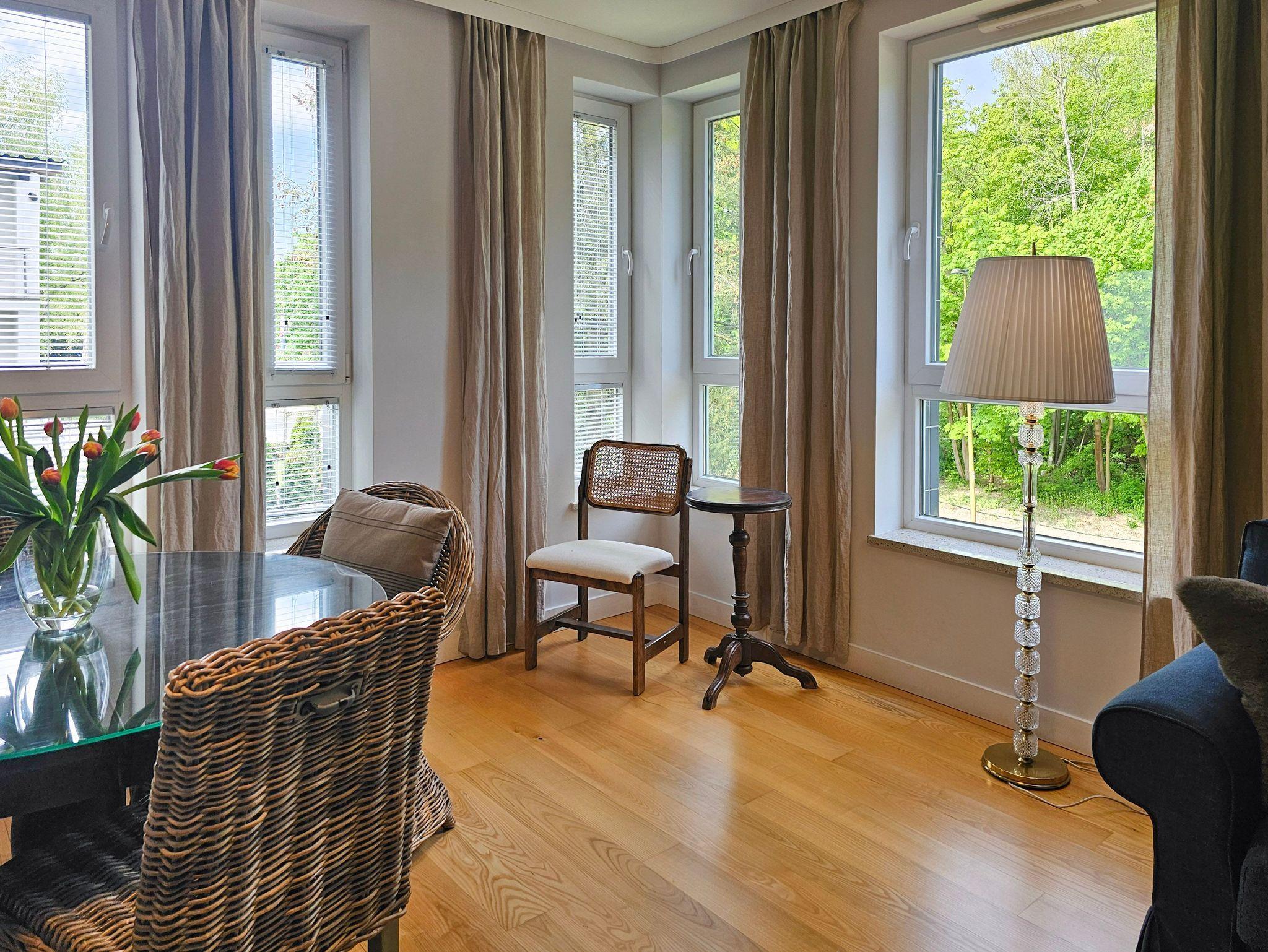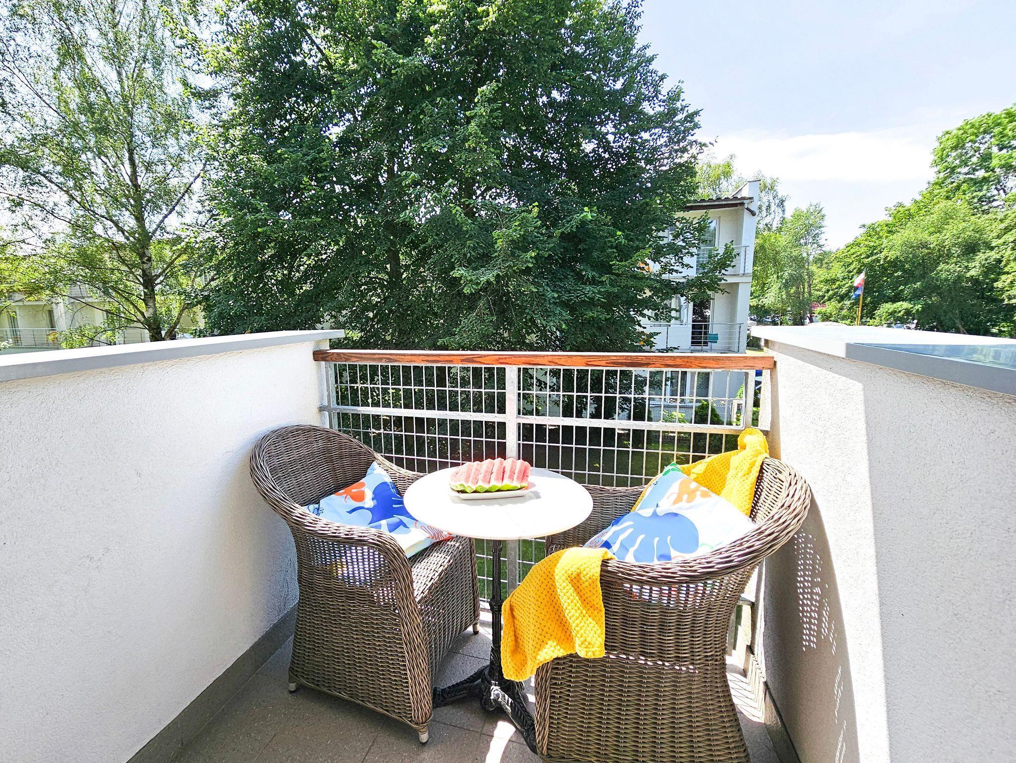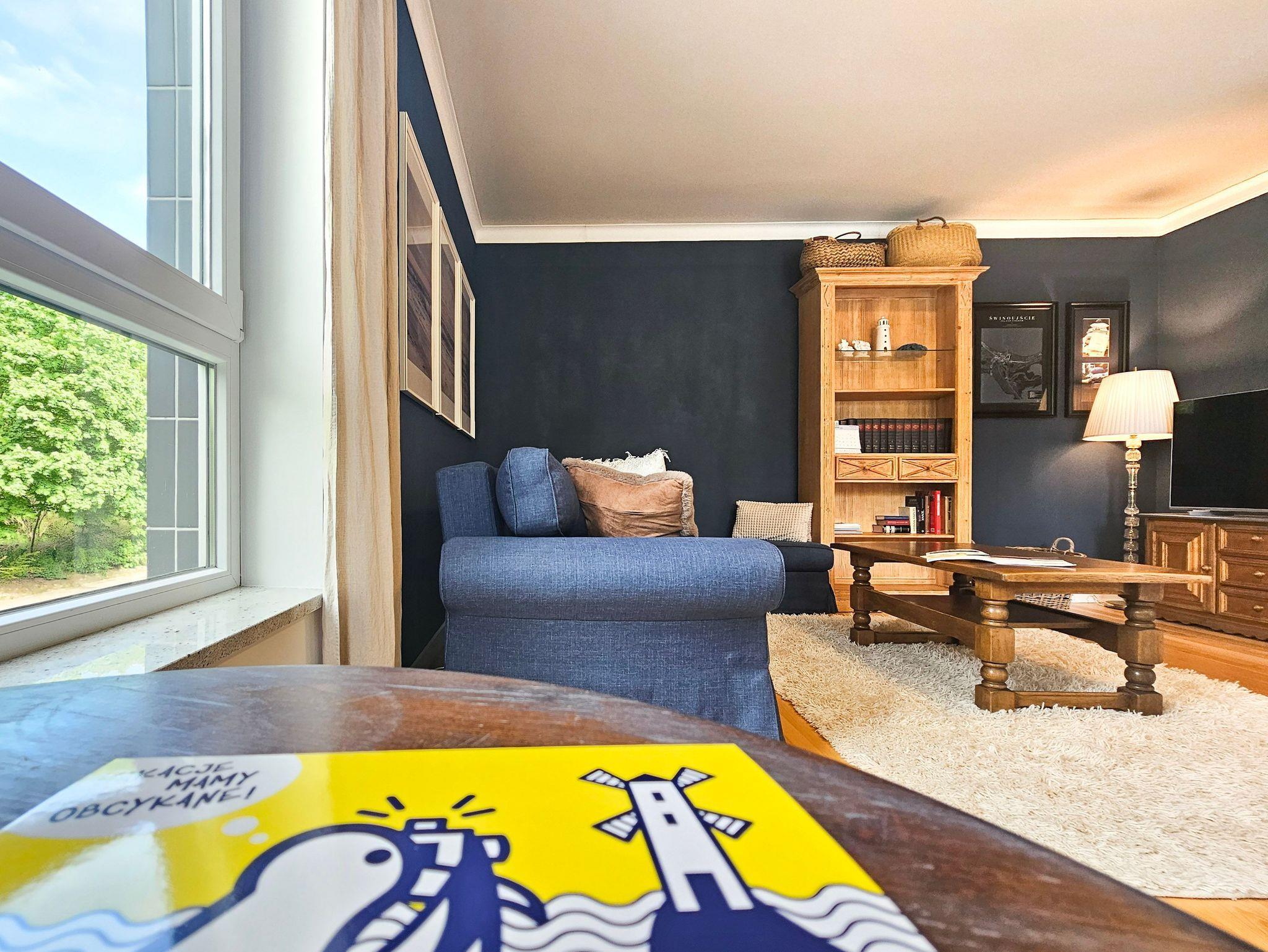 Geräumige 2-Zimmer-Ferienwohnung in Strandnähe im Kurviertel von Swinoujscie. Sie besteht aus einem Wohnzimmer mit Küchenzeile und einem separaten Schlafzimmer. Im Schlafzimmer, das auf einen Balkon führt, gibt es ein bequemes Sofa (mit einer Liegefläche von 140x200cm nach dem Ausklappen), eine Bank, einen Tisch mit 4 Sesseln. In der Küchenzeile finden Sie einen Kühlschrank, Wasserkocher, Filterkaffeemaschine, Toaster, Mikrowelle, Elektroherd. Die Fenster des Wohnzimmers gehen nach Süden und Westen, der Balkon ist nach Süden ausgerichtet.