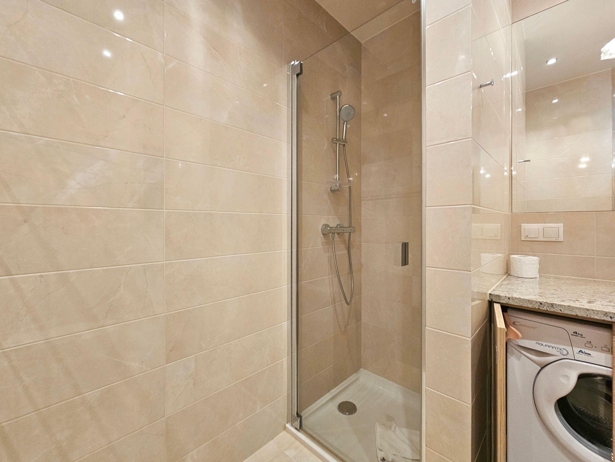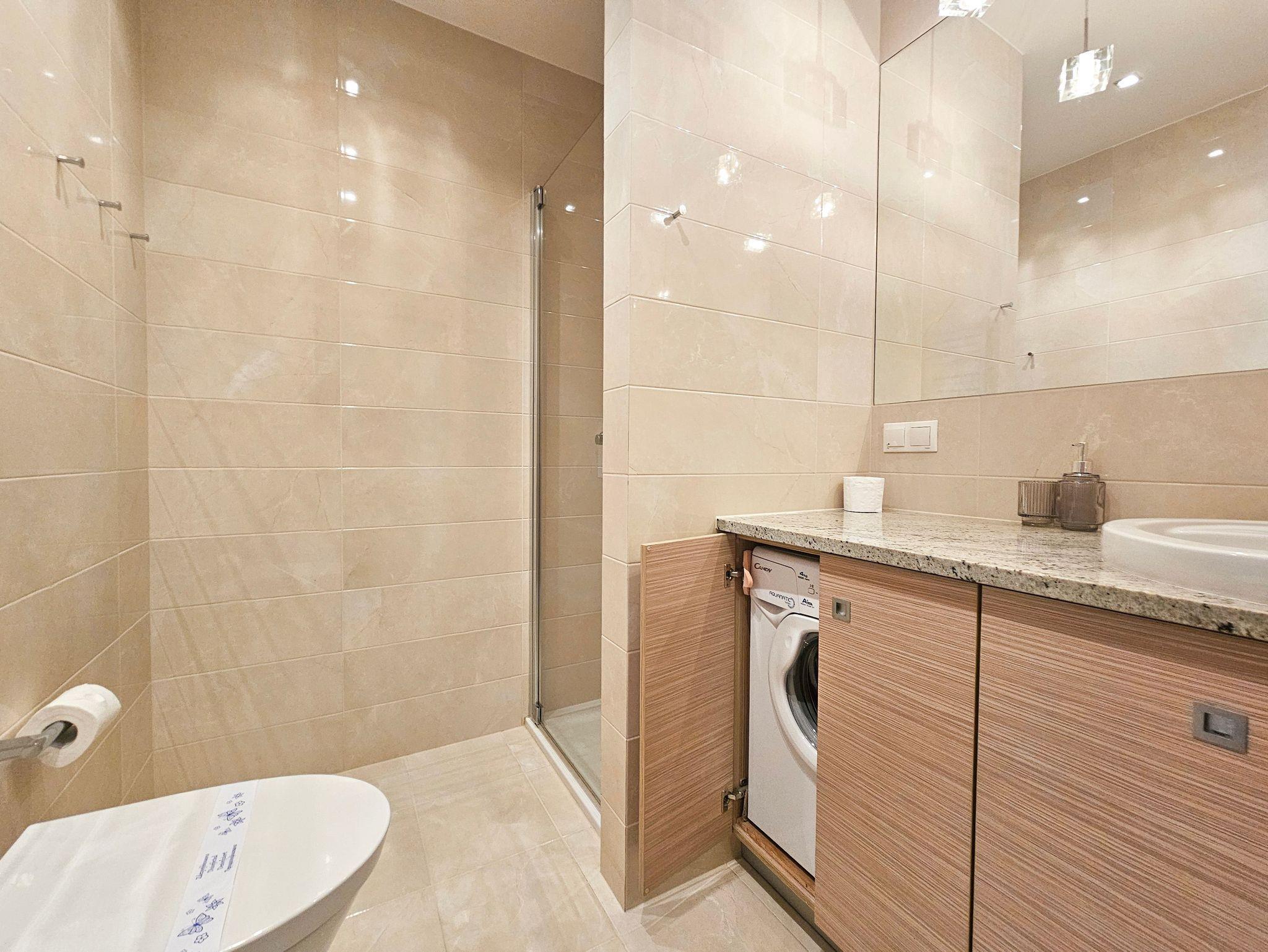 Badezimmer mit Toilette und Dusche und Waschmaschine.