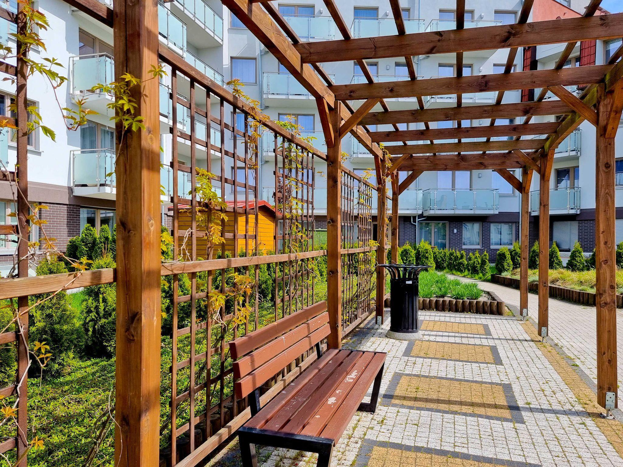 Die Wohnung besteht aus einem Wohnzimmer mit einem Schlafsofa (140cm x 200cm), einem Tisch mit einer Bank und zwei Stühlen, einer Küchenzeile und Zugang zu einem großen Balkon mit Blick auf einen grünen Innenhof. Im Wohnzimmer gibt es einen LCD-Fernseher mit polnischen und deutschen Kanälen. Die Küche ist mit allen Geräten ausgestattet, die für die Zubereitung und den Verzehr von Mahlzeiten notwendig sind, sowie mit einem großen Kühlschrank mit Gefrierfach, Backofen, Mikrowelle, Geschirrspüler, Induktionsherd mit 4 Kochplatten, Wasserkocher, Toaster und Filterkaffeemaschine.