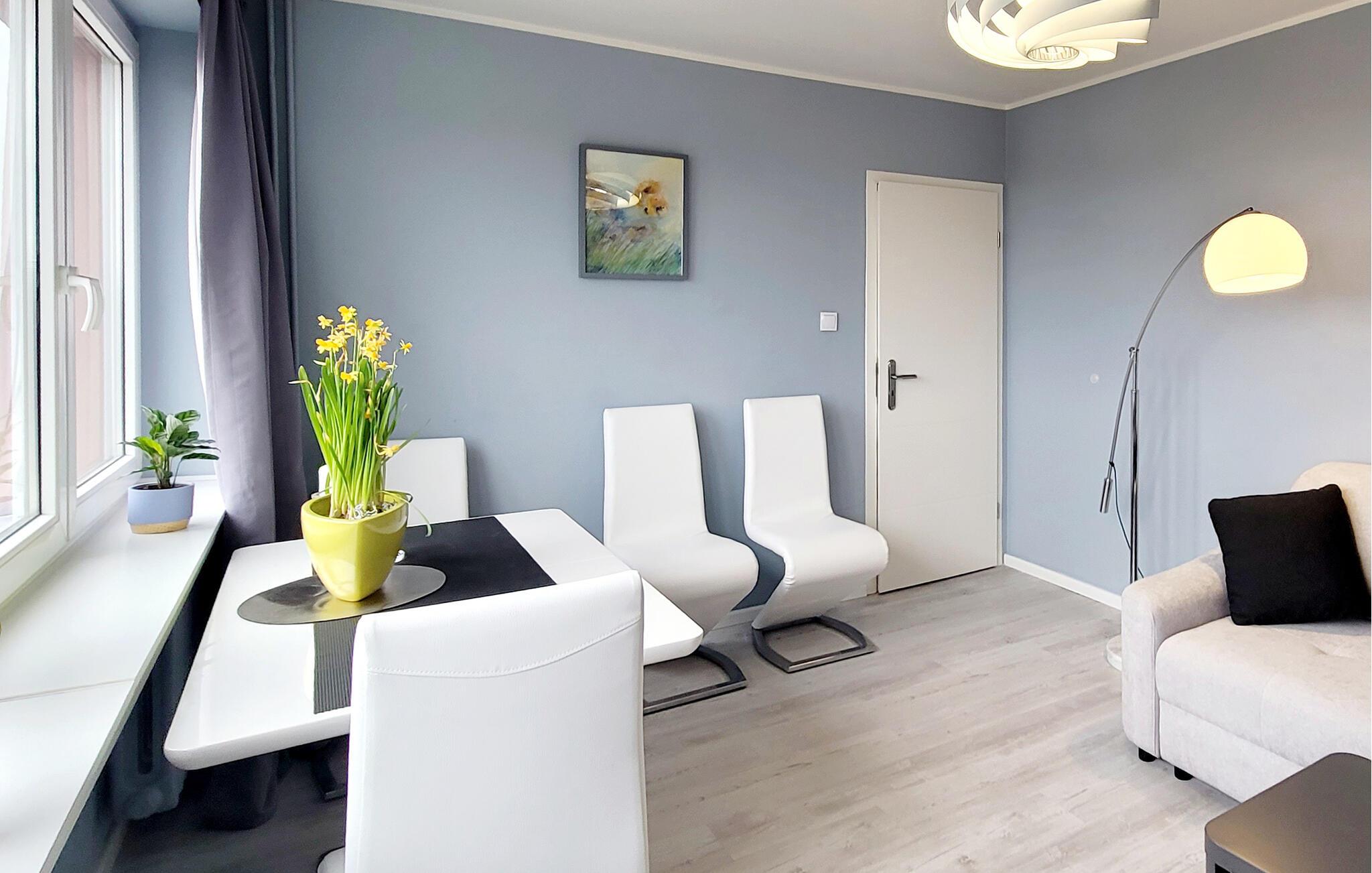 Diese charmante Ferienwohnung im Herzen von Swinemünde bietet Ihnen einen wundervollen Blick über die Stadt und schafft mit ihrer stilvollen Einrichtung eine gemütliche Atmosphäre. Das moderne Design und die sorgfältig gewählten Details laden zum Wohlfühlen ein – ideal, um Ihren Urlaub in vollen Zügen zu genießen. Vom Wohnbereich aus können Sie das urbane Treiben beobachten und die besondere Stimmung der Küstenstadt in sich aufnehmen.