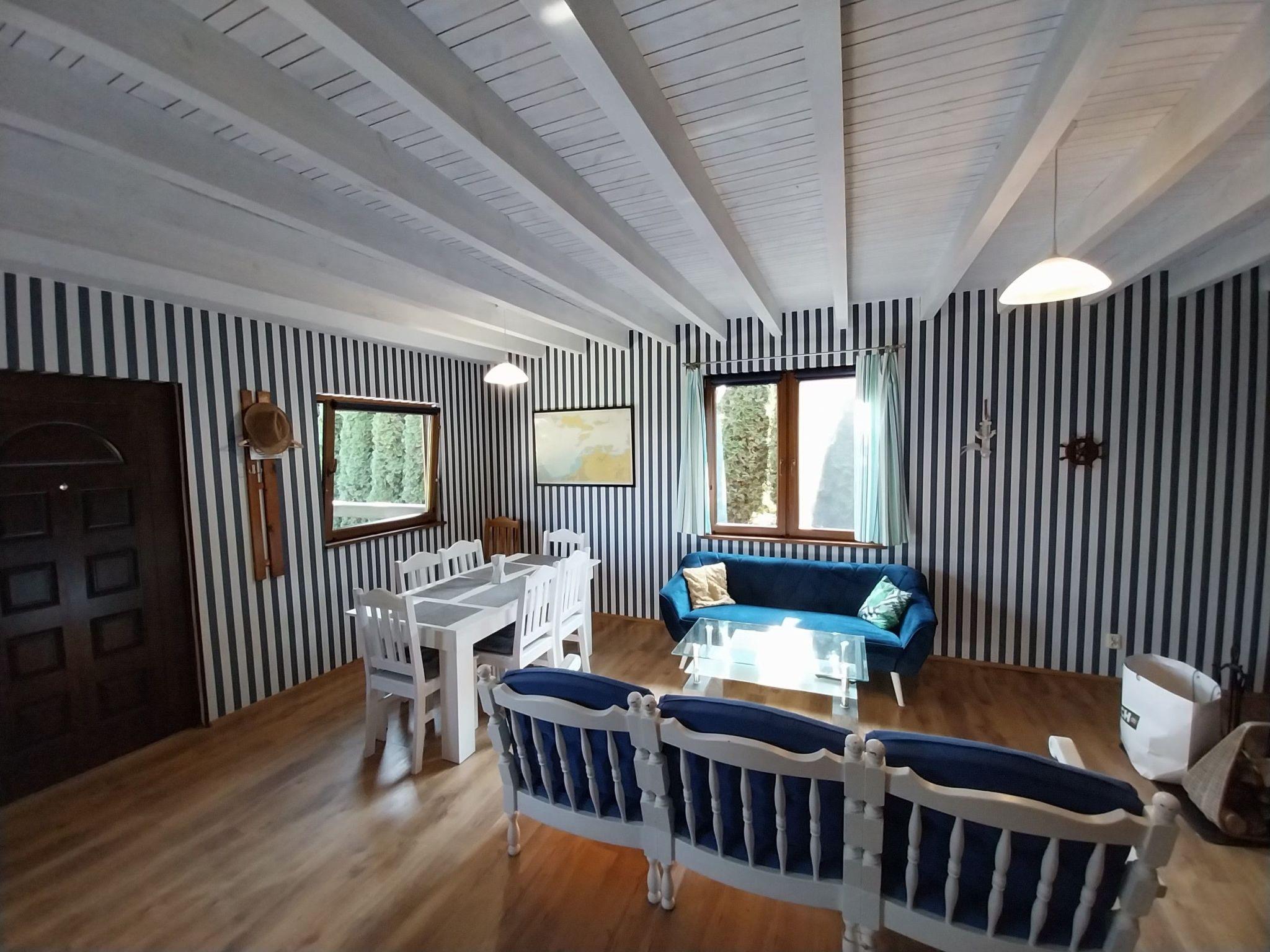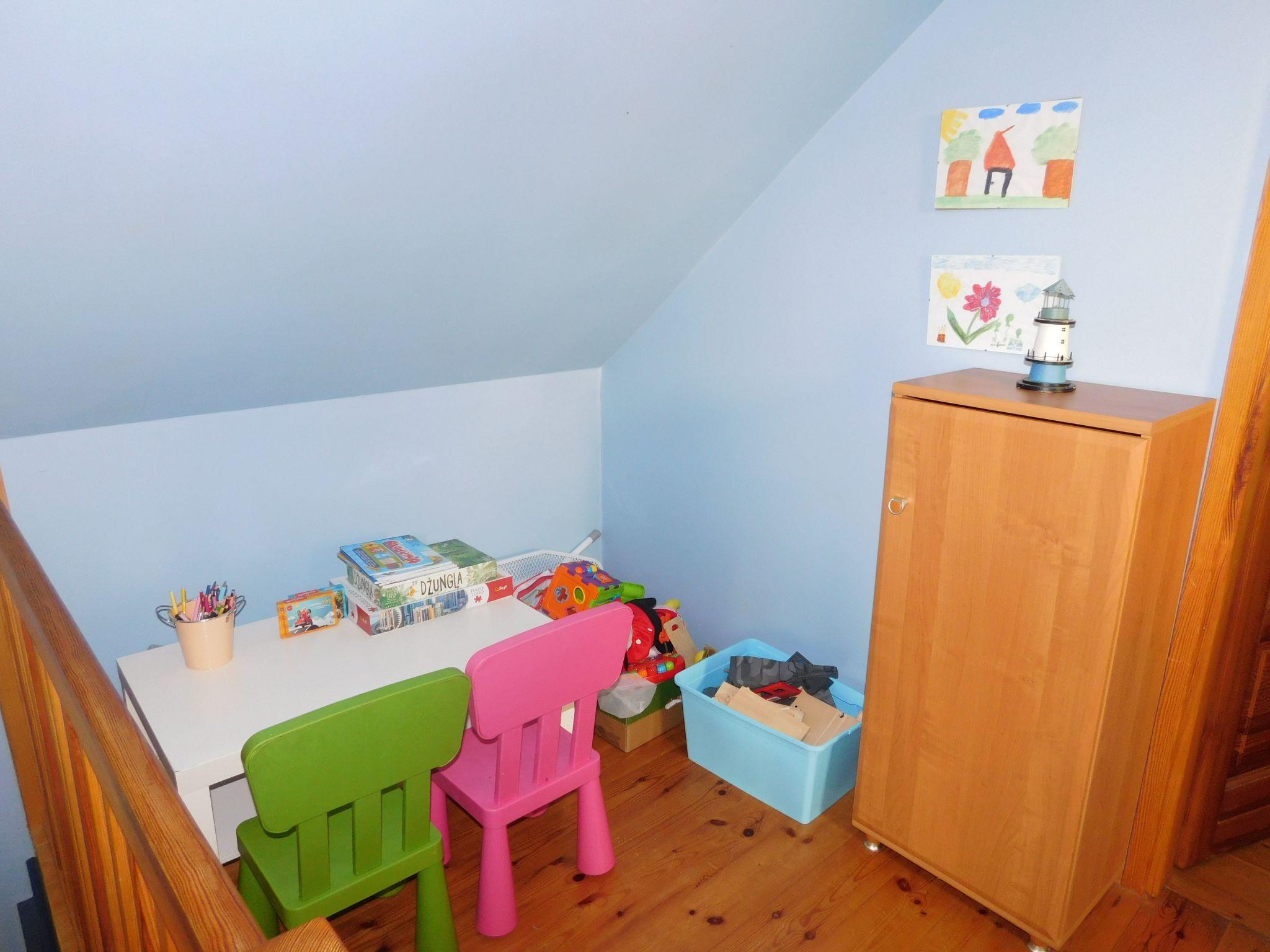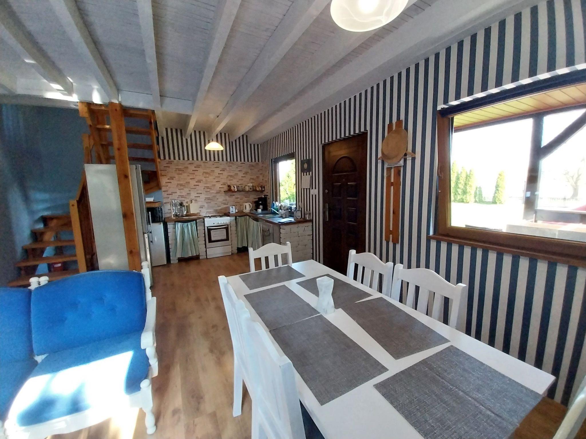 Das Ganzjahreshaus Orla Chata I wird mit einem Kamin beheizt. Das Haus hat drei separate Schlafzimmer, 2 und 3 im ersten Stock, so dass insgesamt 7 Personen übernachten können. Im Erdgeschoss des Hauses befindet sich ein Aufenthaltsbereich, bestehend aus einem Wohnzimmer mit Kamin, das mit einer offenen Küche und einem Essbereich verbunden ist, sowie ein Badezimmer mit Duschkabine. In jedem Ferienhaus steht den Gästen Folgendes zur Verfügung: TV-Kanäle in polnischer und deutscher Sprache, Heimkino, Brettspiele. Die Küche ist mit einer Kaffeemaschine, einem Toaster, einem Mikrowellenherd, Geschirr und Töpfen für die Zubereitung von Mahlzeiten ausgestattet. Zum Haus gehört eine überdachte Terrasse, die zum Entspannen einlädt, auf der man grillen und eine Zigarette rauchen kann. Auf dem Grundstück gibt es Parkplätze für Autos und einen kleinen Spielplatz für Kinder. Das Gelände um die Hütten ist eingezäunt und hat einen separaten Eingang von der Warzywna-Straße. Orla Chata I ist ein maritimes Ferienhaus, die Wände sind mit Gipskartonplatten verkleidet und in maritimen Farben gestrichen.