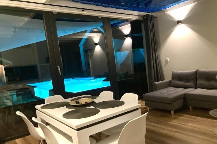 Parterre: (offene Küche(Esstisch, Wasserkocher, Kochendwasserhahn, Toaster, Kochherd(2 Kochplatten, Induktion), Espressomaschine, Backofen, Spülmaschine, Kühl-/Gefrierkombination), Wohn-/Schlafzimmer(Doppelschlafcouch, TV(Satellit, Deutsch Fernsehsender)), Schlafzimmer(Doppelbett), Badezimmer(Dusche, Waschbecken, Toilette)) In der 1. Etage: (Schlafzimmer(Einzelbett, Einzelbett), Schlafzimmer(Doppelbett)) Sauna, Terrasse, Garten(Gemeinschaftliche Nutzung mit anderen Gästen, umzäunt, angelegt), Gartenmöbel, Liegen, Parkplatz, Pool(Gemeinschaftliche Nutzung mit anderen Gästen, beheizbar, Seperates Kinderschwimmbad (Tiefe 50 cm), 10 x 5 m., geöffnet von Mai bis einschließlich Sep), Sandkasten, Fußballtor, Volleyballfeld