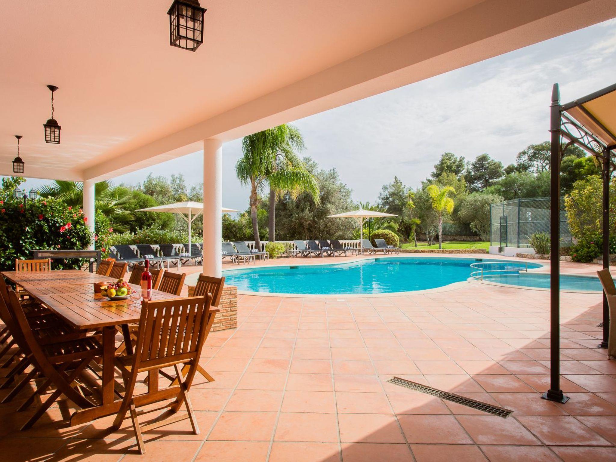 Beeindruckende Villa im maurischen Stil in Strandnähe, mit Pool und Tennisplatz Die Villa im marokkanischen Stil liegt in einem Wohngebiet auf einem großen Privatgrundstück (mit zwei anderen Villen). Die Villa bietet Platz für 16 Personen (einschließlich des Studios), und die nächsten Geschäfte und Restaurants sind in 5 Autominuten zu erreichen. Der nächste Strand Praia Centianes ist 500 m entfernt. Drei Golfplätze innerhalb von 10 Autominuten. Flughafen Faro ca. 45 Autominuten entfernt.