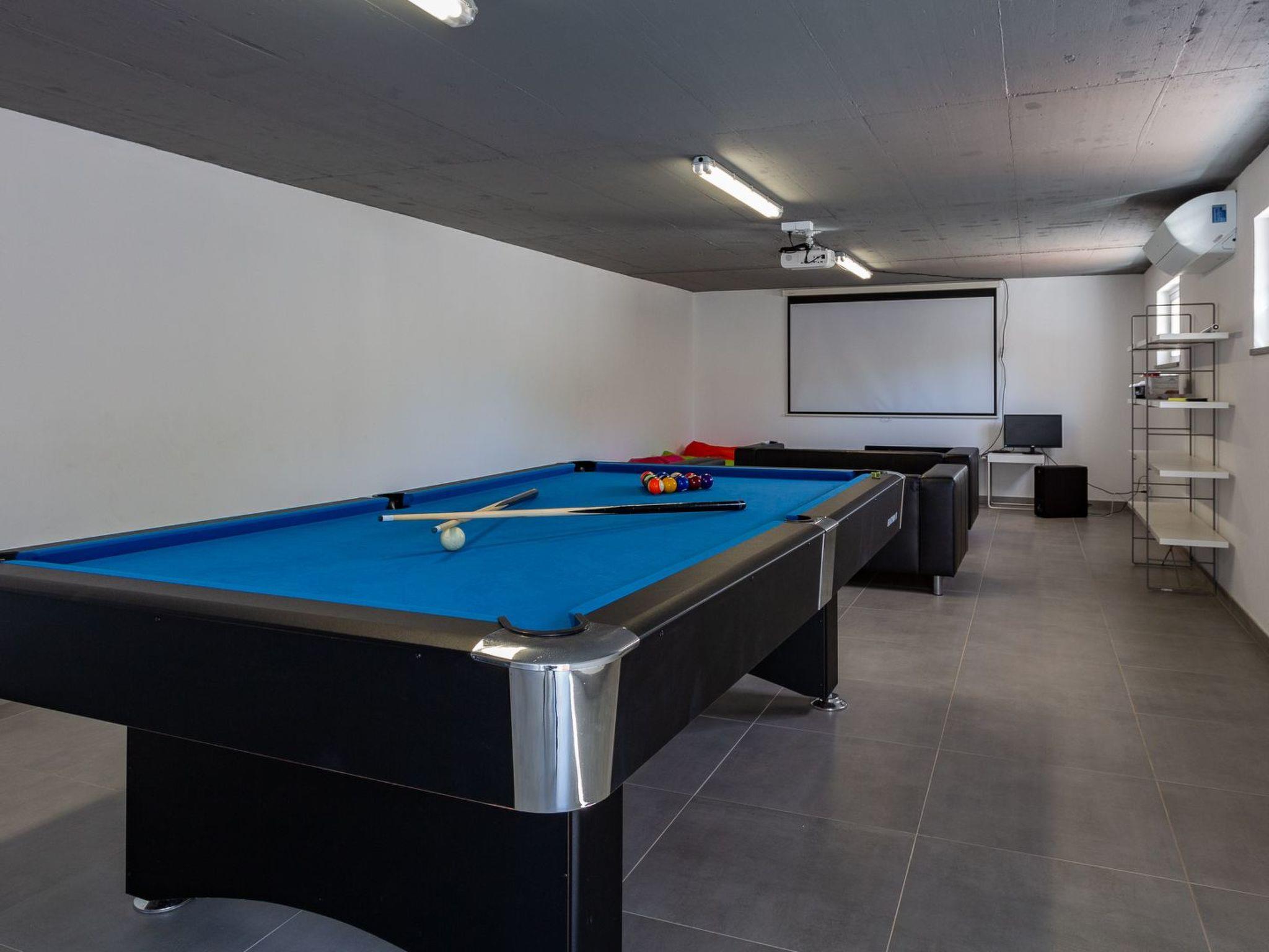Der private Pool ist 14 x 5 m groß und hat einen separaten Bereich für Kinder. Der Pool ist beheizbar (extra Kosten). Der Pool ist von großzügigen Terrassen umgeben, darunter zwei große professionelle Sonnenschirme, bequeme Sonnenliegen, ein Esstisch mit Stühlen, eine Sitzecke, ein Grill und ein Terrassenkamin.