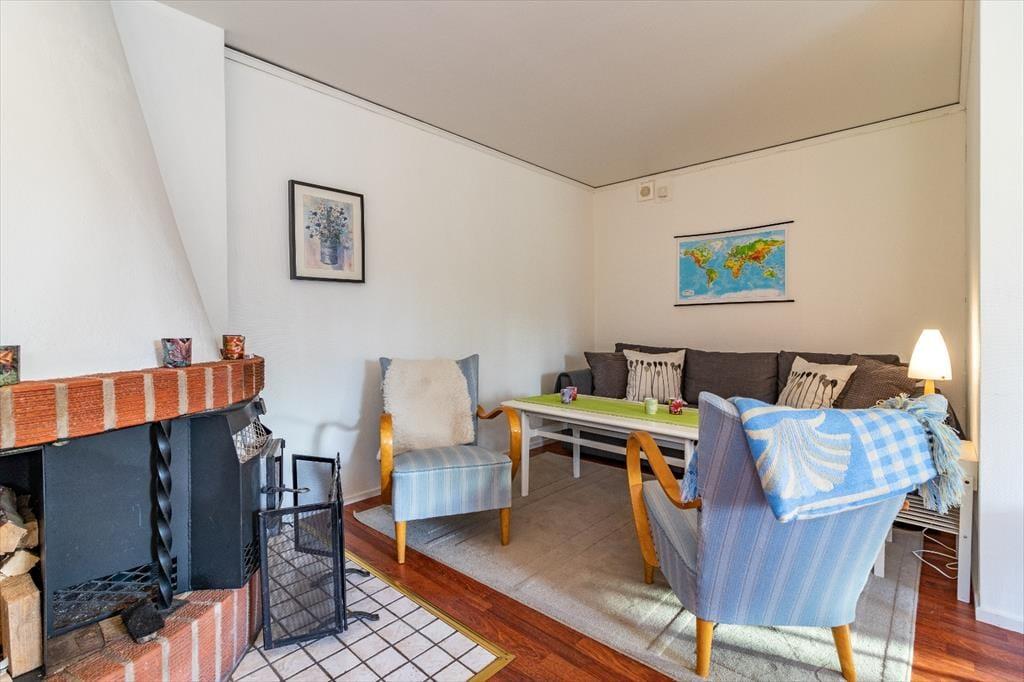 Auf 45 m² bietet das Haus bis zu 4 Personen bequem Platz. Auch zwei Haustiere sind willkommen. Sie gelangen über die kleine überdachte Terrasse mit Gartenmöbeln und Grill auf der Rückseite zur Haustür und betreten dann einen kleinen mittig im Haus gelegenen Eingangsbereich. Dieser führt Sie rechter Hand in die Küche mit kleinem Essbereich, die neben einem Kühl- und Gefrierschrank, Ofen, Ceran-Herd mit vier Kochfeldern, Mikrowelle und Filterkaffeemaschine alles beinhaltet, was Sie zum Zubereiten und Servieren gängiger Gerichte für 4 Personen benötigen. Von der Küche aus gelangen Sie weiter ins Schlafzimmer mit zwei Einzelbetten. Durch dieses erreichen Sie auch durch einen weiteren kleinen Flur das geräumige Badezimmer mit WC, Dusche und einer Waschmaschine. Die anderen beiden Schlafplätze bietet das doppelte Schlafsofa im Wohnzimmer. Letzteres liegt auf der anderen Seite des Hauses, linker Hand vom Eingangsbereich. Dort finden sich der Esstisch für alle Gäste, gemütliche Sessel, ein Sofa, der Flachbildfernseher und der Kamin, der den Raum an kühlen Abenden mit behaglicher Wärme füllt.