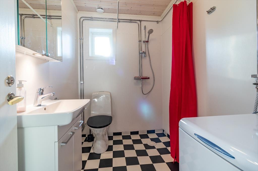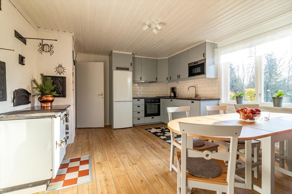 Haus Tilda bietet auf 110 m² bis zu 6 Urlaubsgästen bequem Platz, davon vieren in festen Betten in zwei Schlafzimmern und zweien bei Bedarf in zwei Zustellbetten. Du betrittst das Haus über einen L-förmigen Flur mit Garderobe, der dich ins Badezimmer mit WC, Dusche und Waschmaschine sowie in die Küche mit Essbereich führt. Die moderne Küche bietet neben einem Kühl- und Gefrierschrank, Ofen, vierfachem Induktionskochfeld, Mikrowelle, Geschirrspüler und Filterkaffeemaschine alles, was du zum Zubereiten und Servieren gängiger Mahlzeiten für 6 Personen benötigst. In der Küche kannst du für ein Maximum an schwedischer Ferienhausatmosphäre auch den Holzofen anzünden. Von der Küche aus erreichst du ferner zum einen das erste der beiden Schlafzimmer, das mit einem Doppelbett eingerichtet ist, und zum anderen das Wohnzimmer. Dieses ist mit einem gemütlichen Sofa, einem Sessel und einem Fernseher mit deutschen Programmen ausgestattet. Ans Wohnzimmer schließt sich wiederum das zweite Schlafzimmer mit zwei Einzelbetten an.