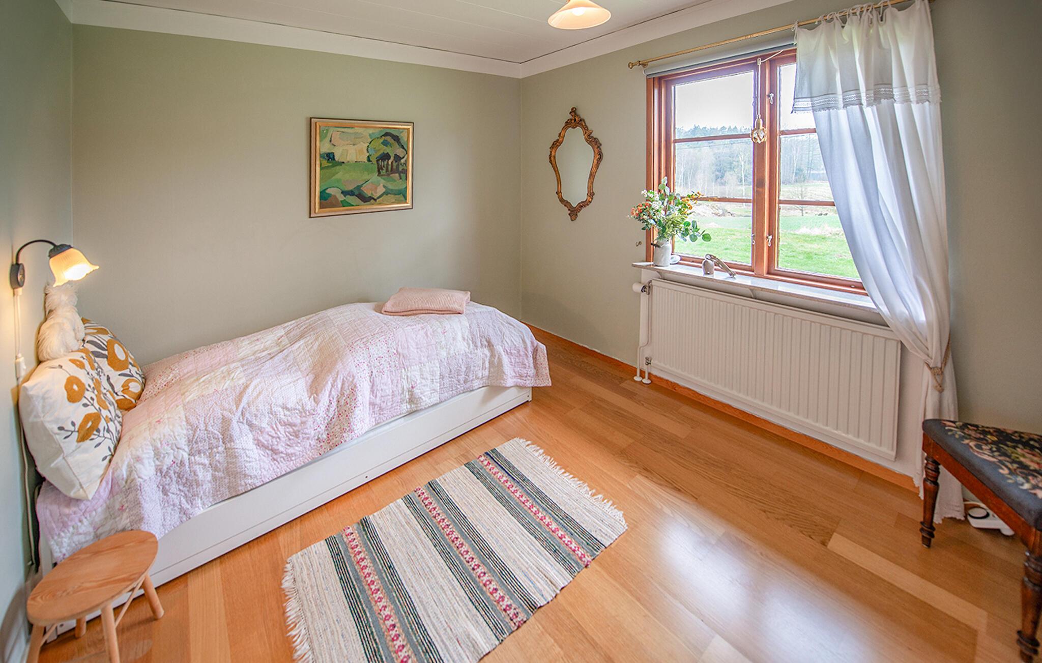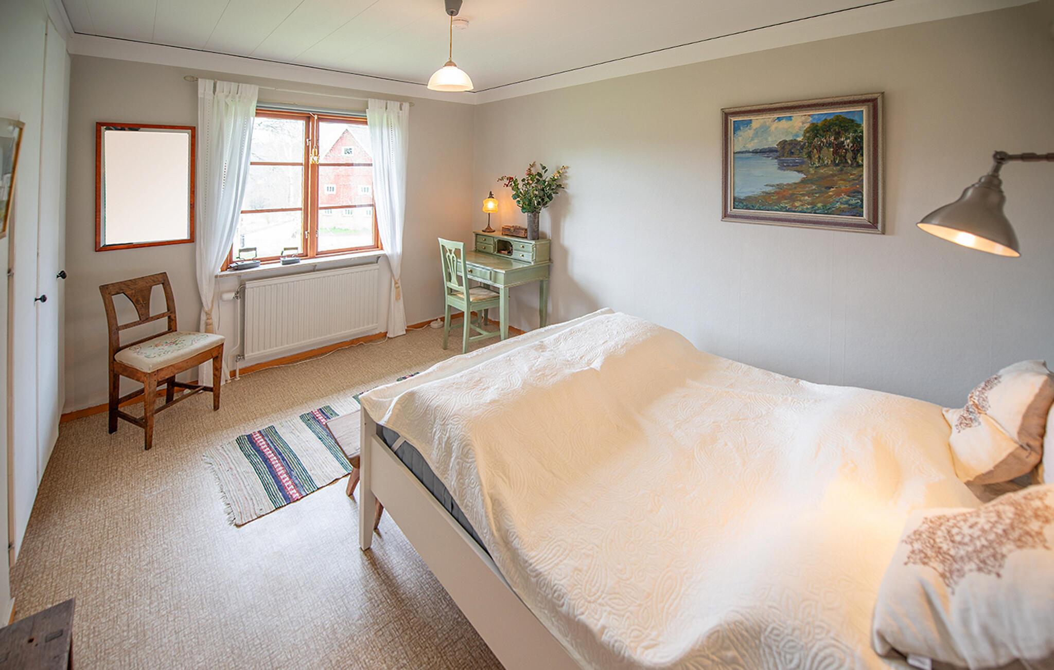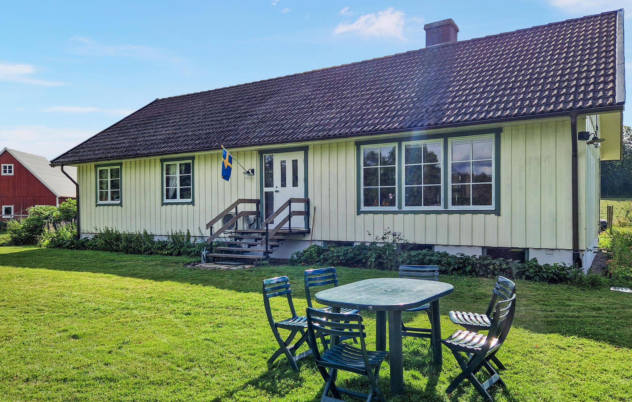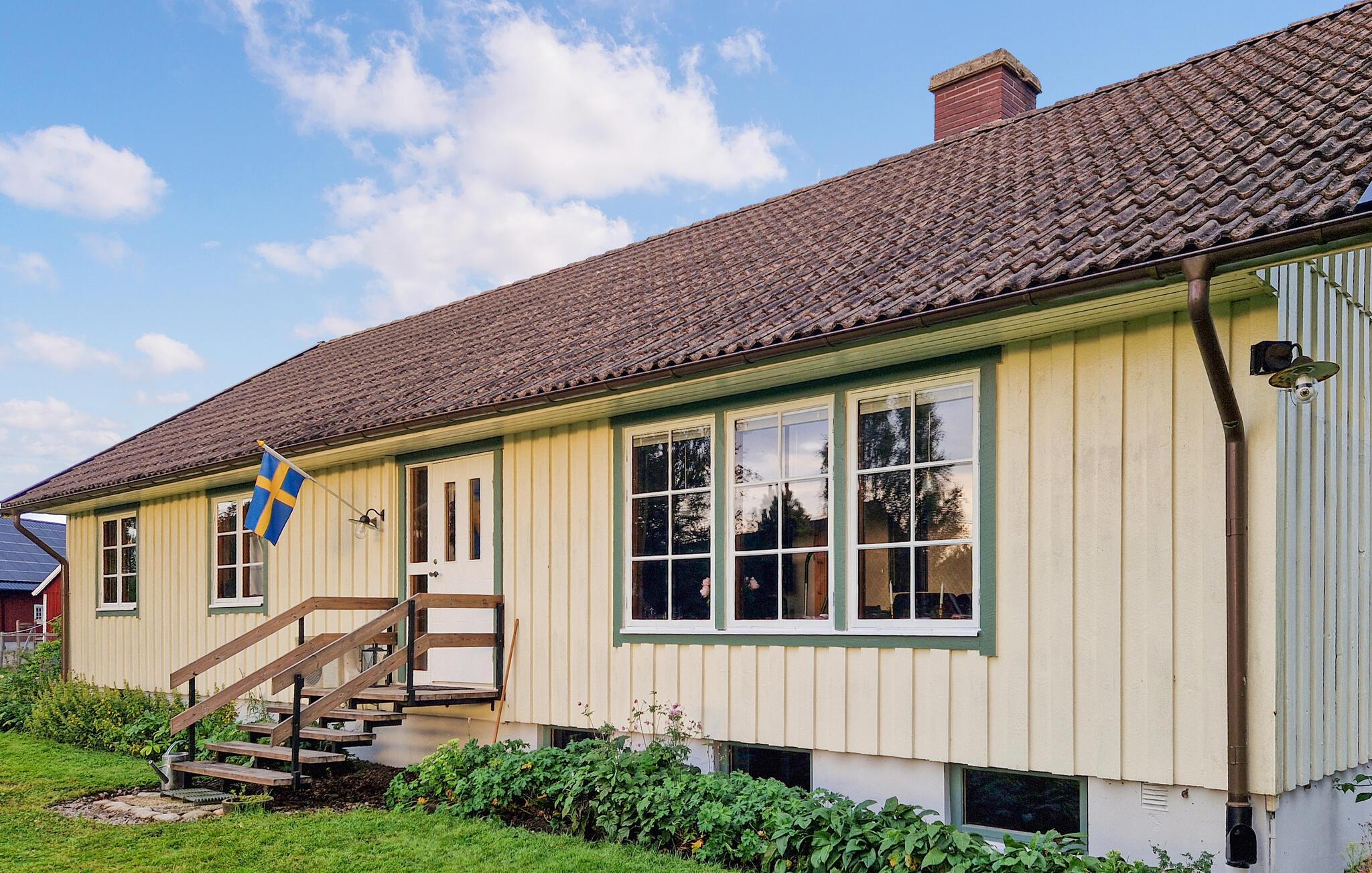 Dieses helle und mit viel Liebe zum Detail eingerichtete Ferienhaus begrüßt Sie mit echter Wohlfühlatmosphäre. Kochen Sie gemeinsam in der geräumigen, gut ausgestatteten Küche und speisen Sie mit Blick in die Naturlandschaft – vielleicht schauen hier Kraniche, Hasen, Füchse oder Hirsche vorbei. Entfachen Sie den Kaminofen, nehmen Sie auf dem Sofa Platz und genießen Sie die Aussicht auf den Gårdsjön und den kleinen Badeteich,