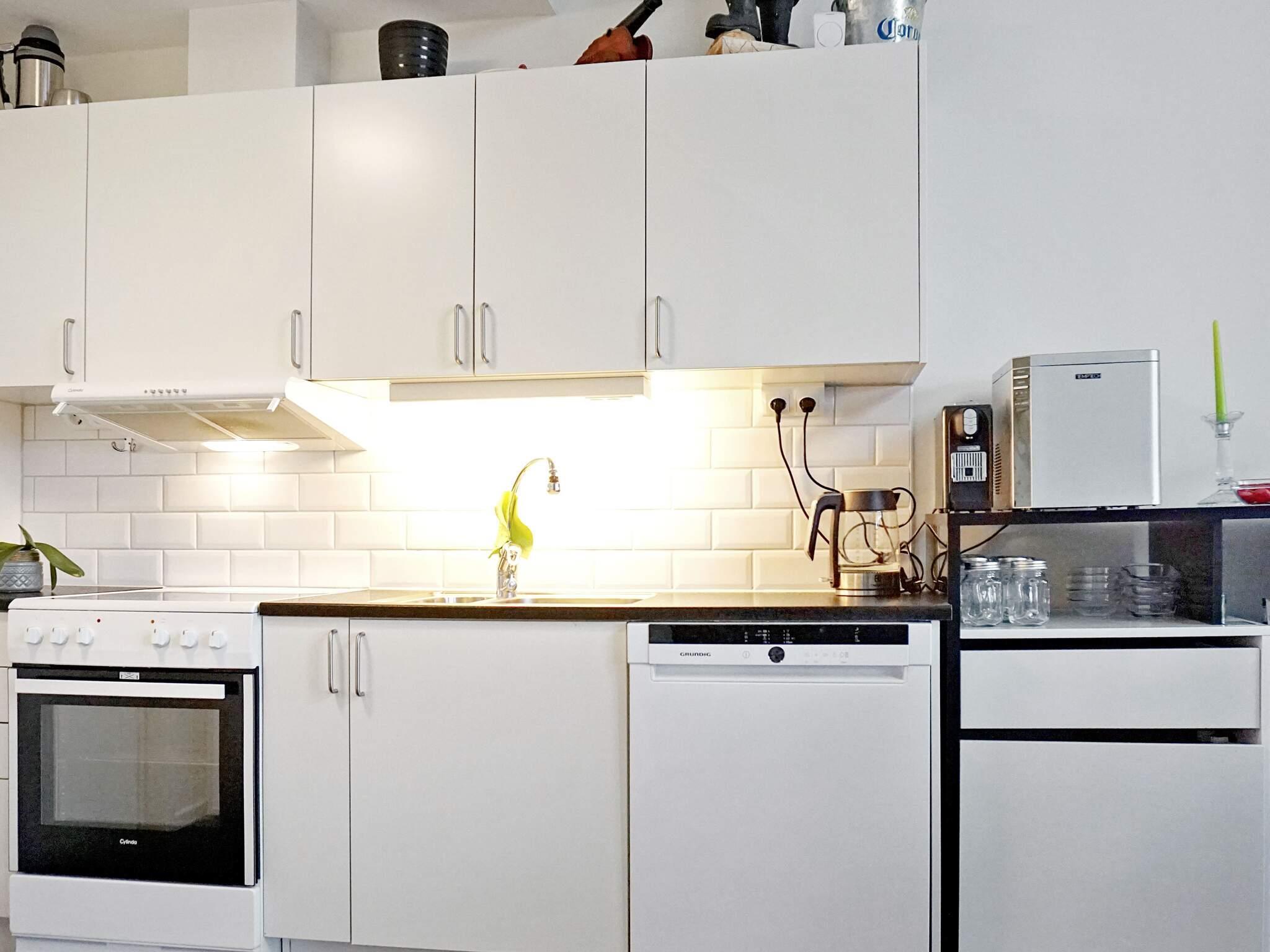 Off. Küche: E-Herd, Kühl-Gefrier-Kombi, Mikrow., Abzugsh., Kaffeem., Spülm.
